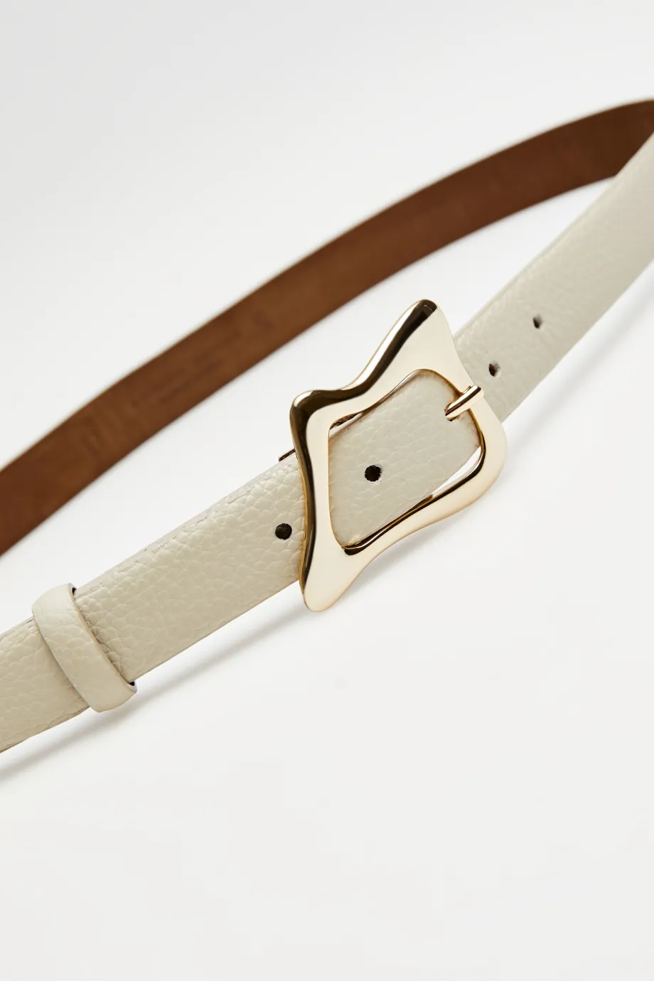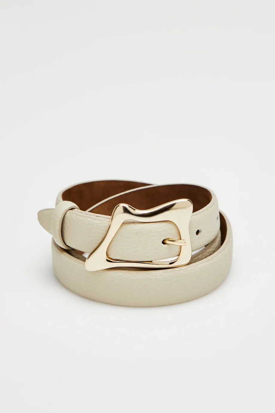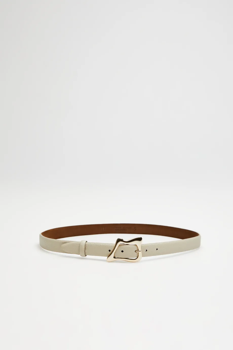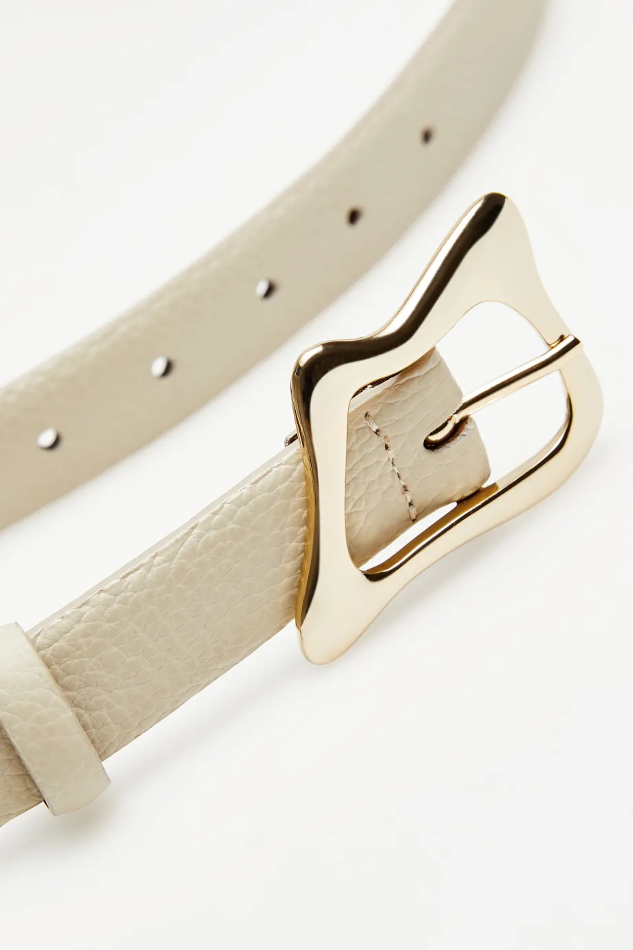 Cienki pasek z beżowej skóry groszkowej, odpornej na zarysowania, z klamrą w kolorze złota.