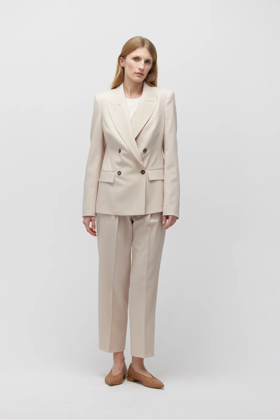 - Wełniane spodnie w kolorze nude z zakładkami, kieszeniami, wylamowanymi szwami podkroju i szlufkami
