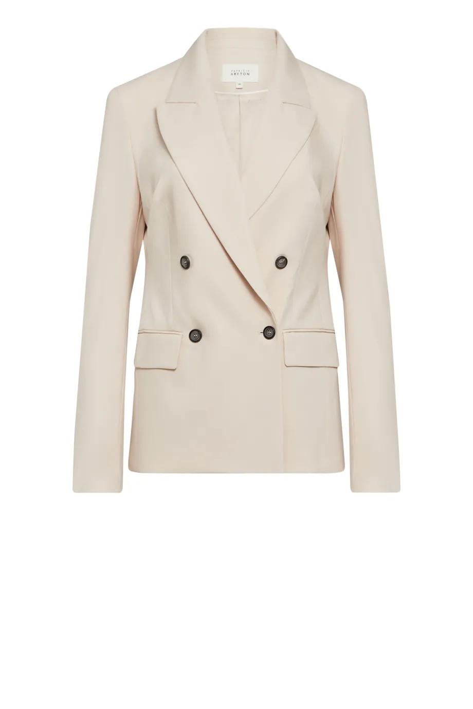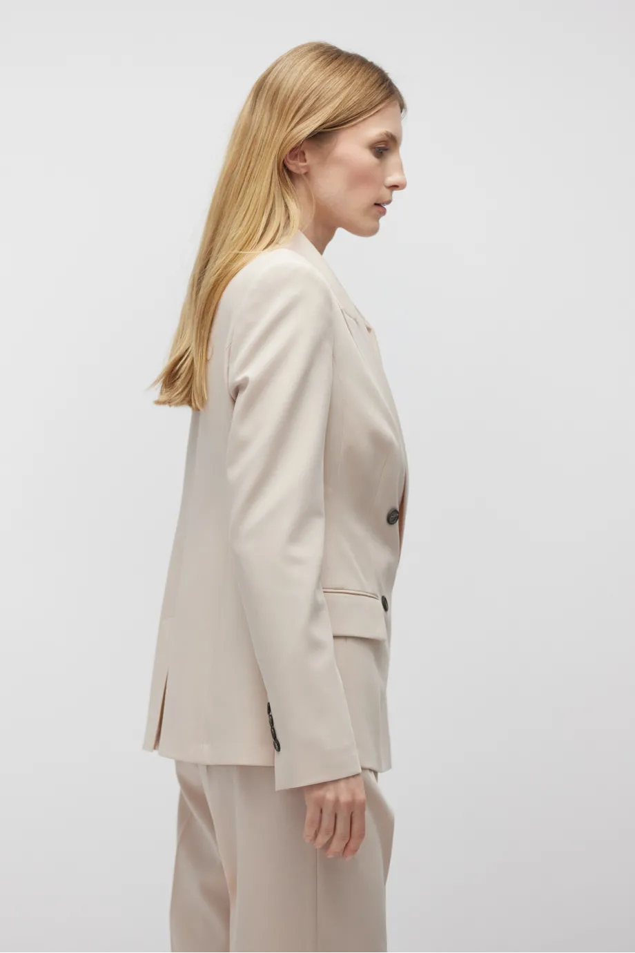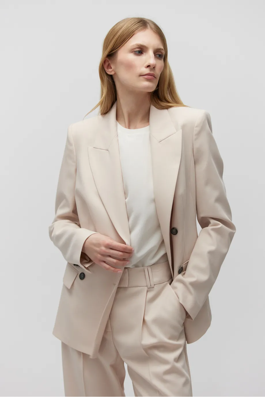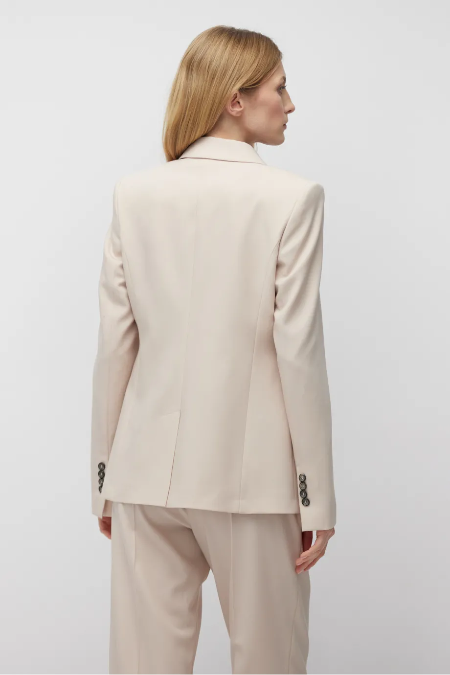 - Dwurzędowy, taliowany żakiet z podkreśloną linią ramion, wykonany z wysokogatunkowej wełny w kolorze nude
