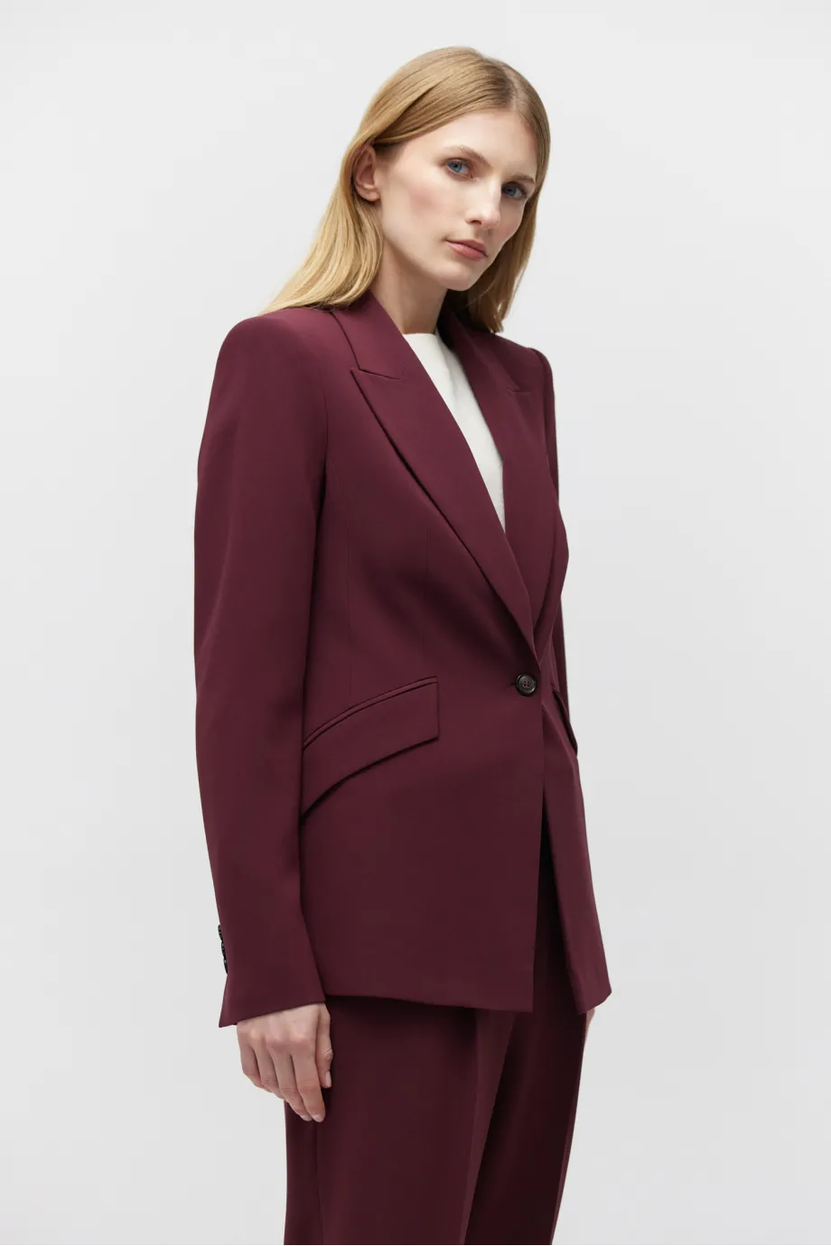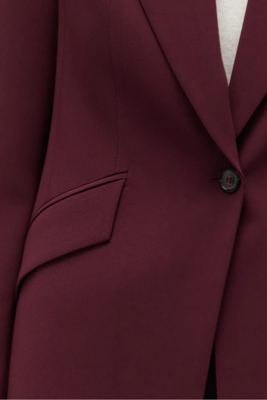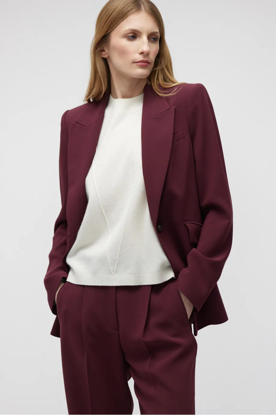 - Taliowany żakiet w kolorze plum berry, z podkreśloną linią ramion, wykonany z tkaniny z triacetatem.