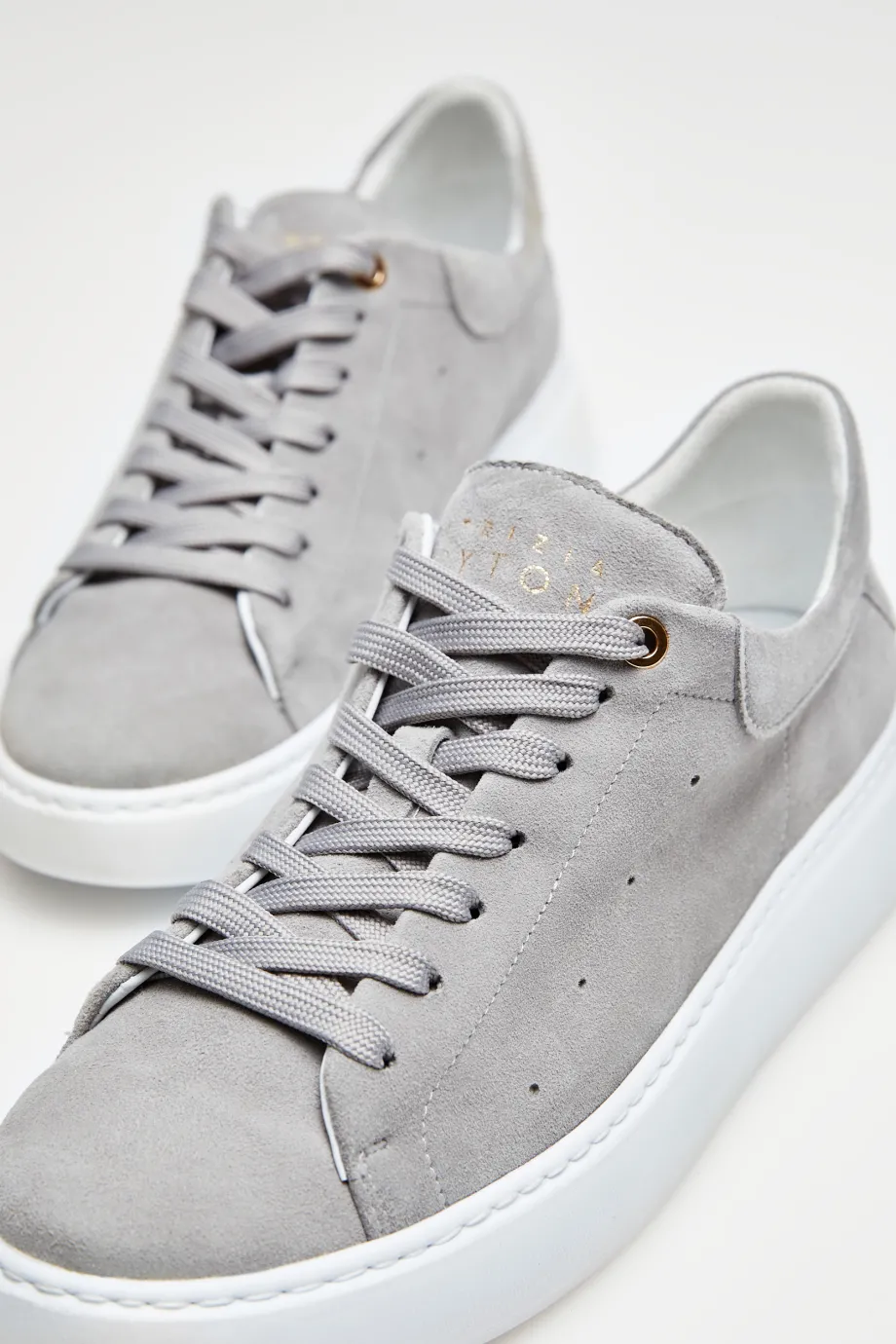 Te damskie zamszowe sneakersy zostały wykonane ręcznie w polskiej manufakturze, z najwyższej jakości skóry koźlęcej o pięknej, matowej fakturze zamszu. Uniwersalny odcień szarości doskonale współgra zarówno z casualowymi jeansami, jak i bardziej eleganckimi stylizacjami – świetnie prezentują się np. w połączeniu z wełnianym garniturem, wpisując się w aktualne trendy smart casualu. Miękka cholewka oraz starannie zaprojektowany design sprawiają, że nasze wygodne sneakersy damskie subtelnie wysmuklają stopę, zachowując przy tym pełnię wygody przez cały dzień.