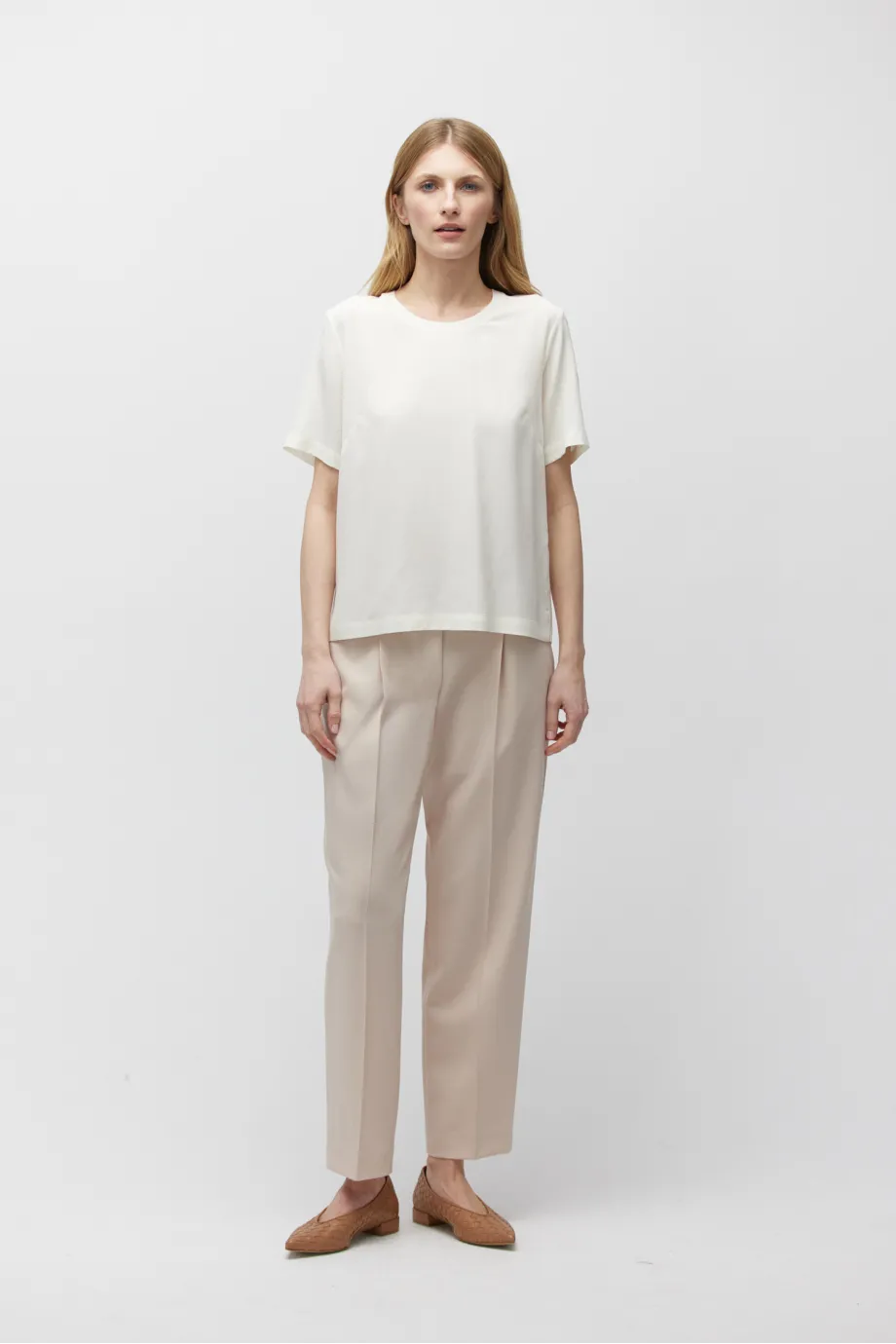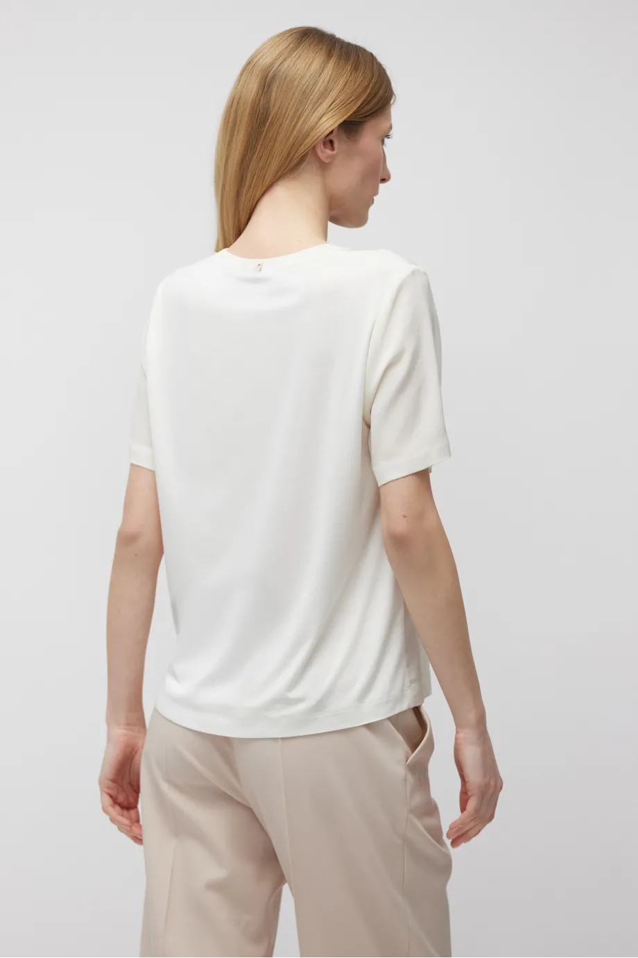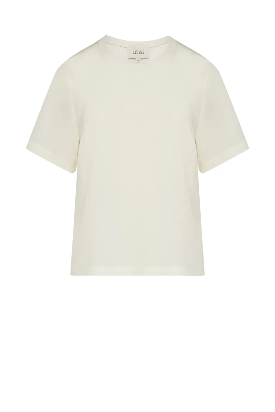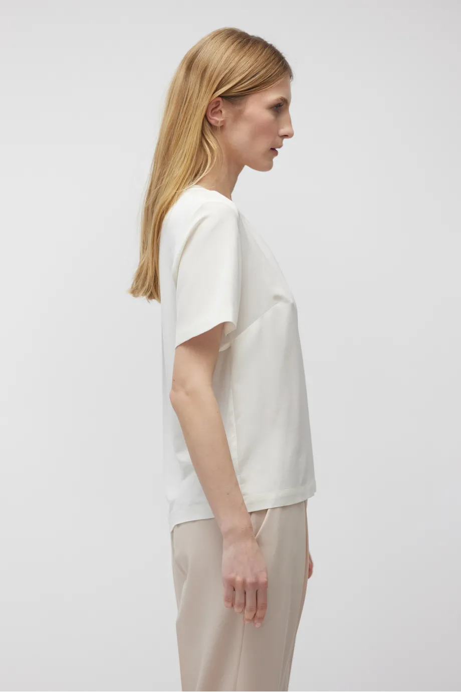 Śmietankowy odcień bluzki podkreśla jej klasyczny charakter, dodając świeżości i blasku każdej stylizacji. Prosta bluzka z okrągłym dekoltem i krótkim rękawem harmonijnie współgra z różnorodnymi elementami garderoby, od eleganckich żakietów po casualowe kardigany. Minimalistyczny design bluzki Brigitte wpisuje się w aktualne trendy, gdzie liczy się jakość, funkcjonalność i subtelna elegancja.