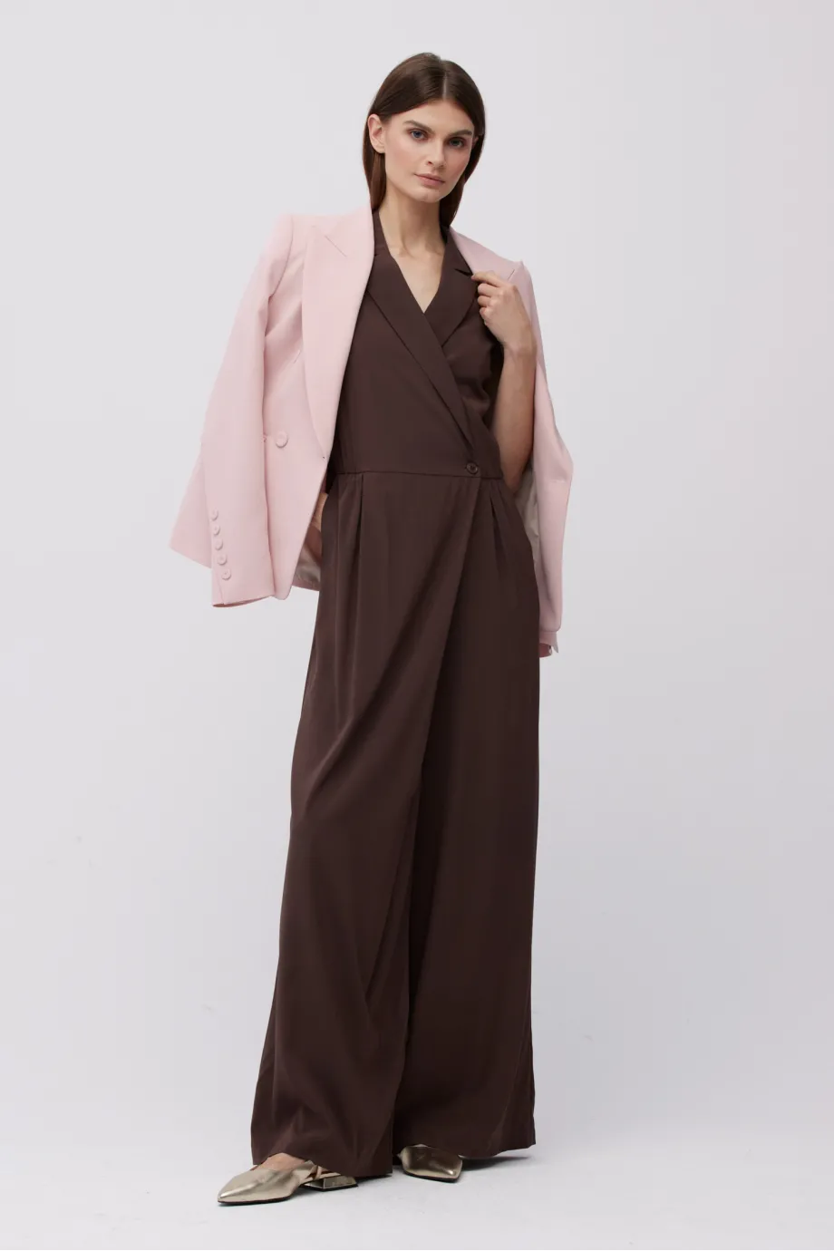 Czekoladowy kombinezon z szerokimi nogawkami i dekoltem V