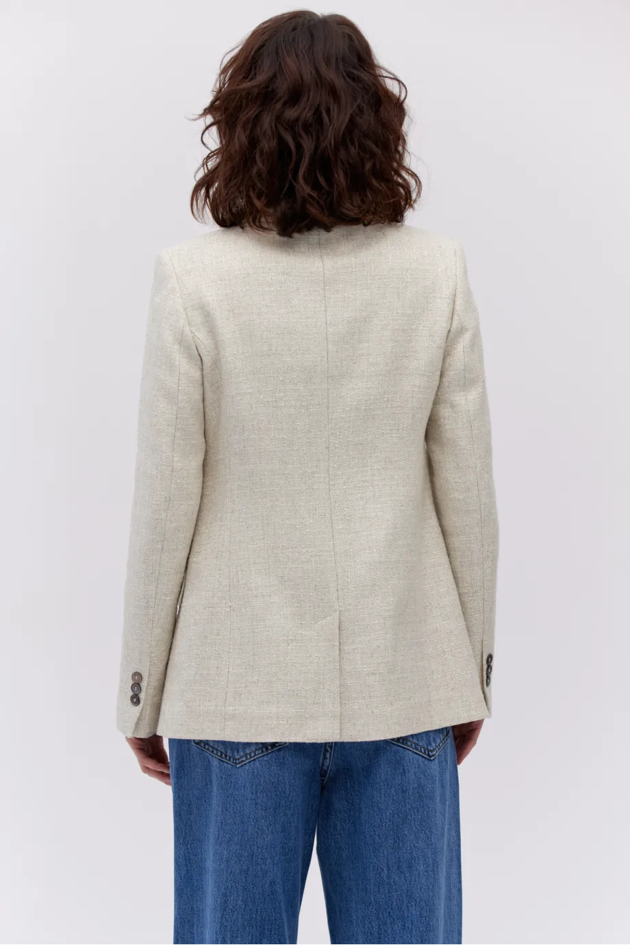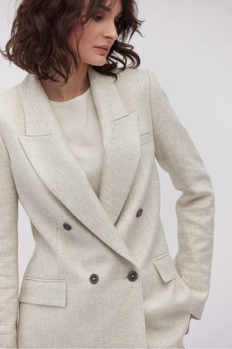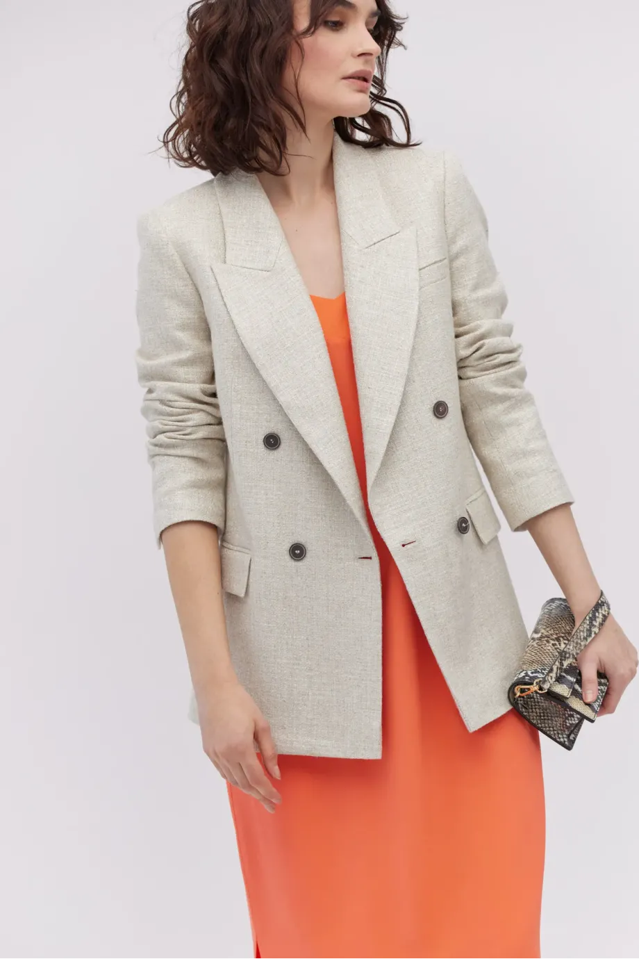 - Beżowy żakiet z lnem o strukturalnej fakturze.