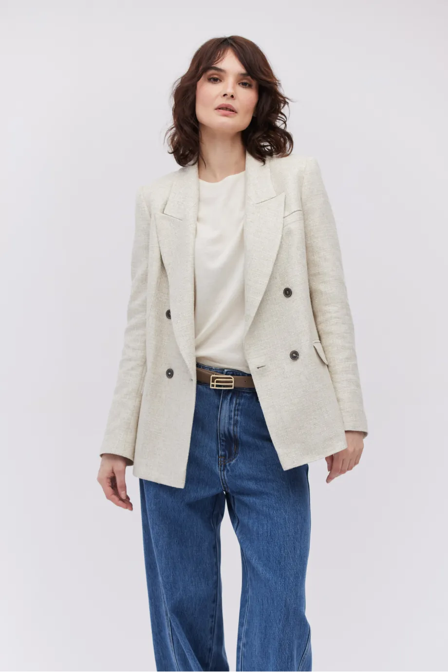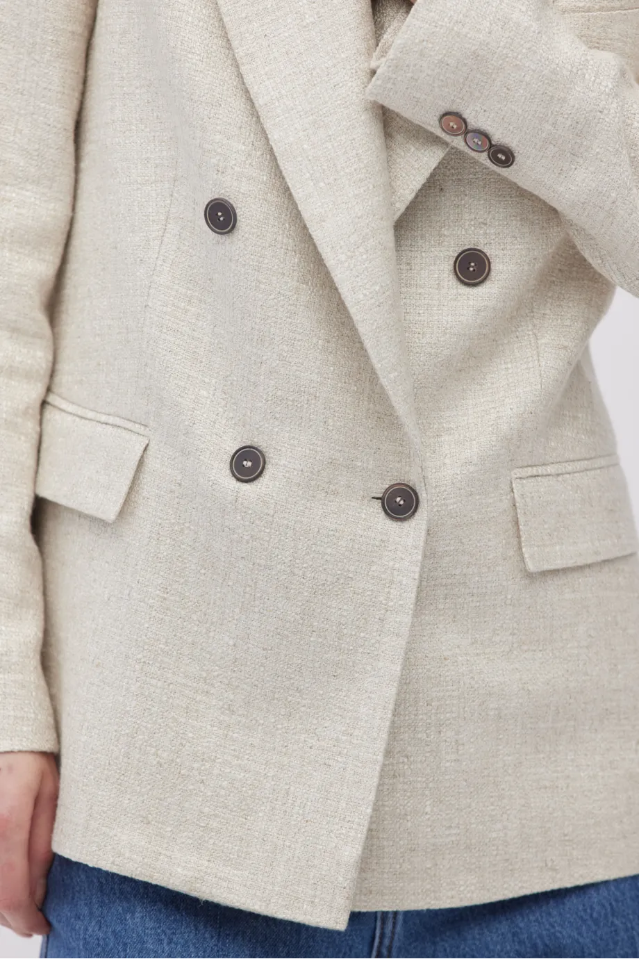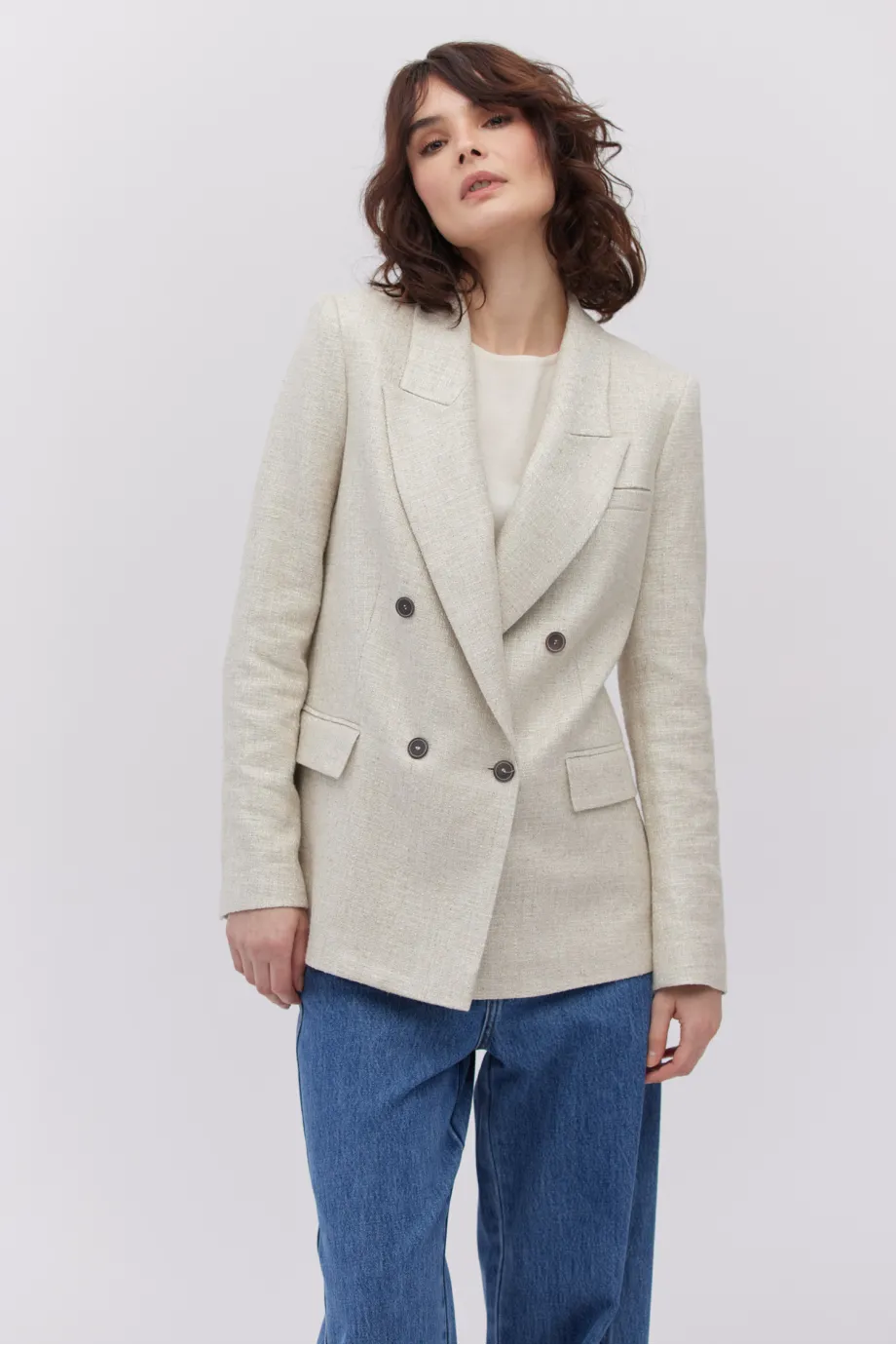 - Beżowy żakiet z lnem o strukturalnej fakturze.