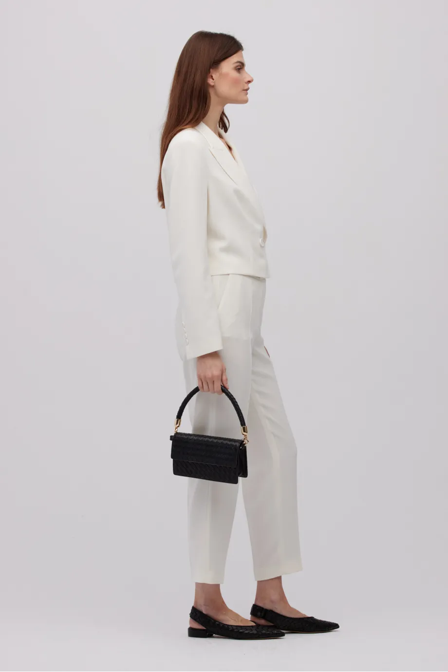 Śmietankowy żakiet Patrizia Aryton świetnie prezentuje się zarówno w duecie z wąskimi lub szerokimi spodniami z tej samej tkaniny, jak i w bardziej kontrastowych zestawieniach z czernią lub brązem. Stylizacje koktajlowe można dopełnić zwiewną spódnicą i beżowymi balerinami z migdałowym noskiem, a miejskie – szerokimi spodniami i akcesoriami w kolorach sezonu: nasyconych plum berry i cegle oraz pastelowych błękicie czy panna cotta. Model dobrze pracuje również jako element blokowych stylizacji, z czarnymi butami i torebką jako dodatkami.