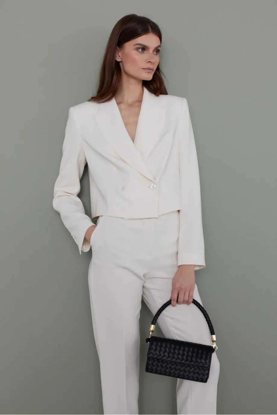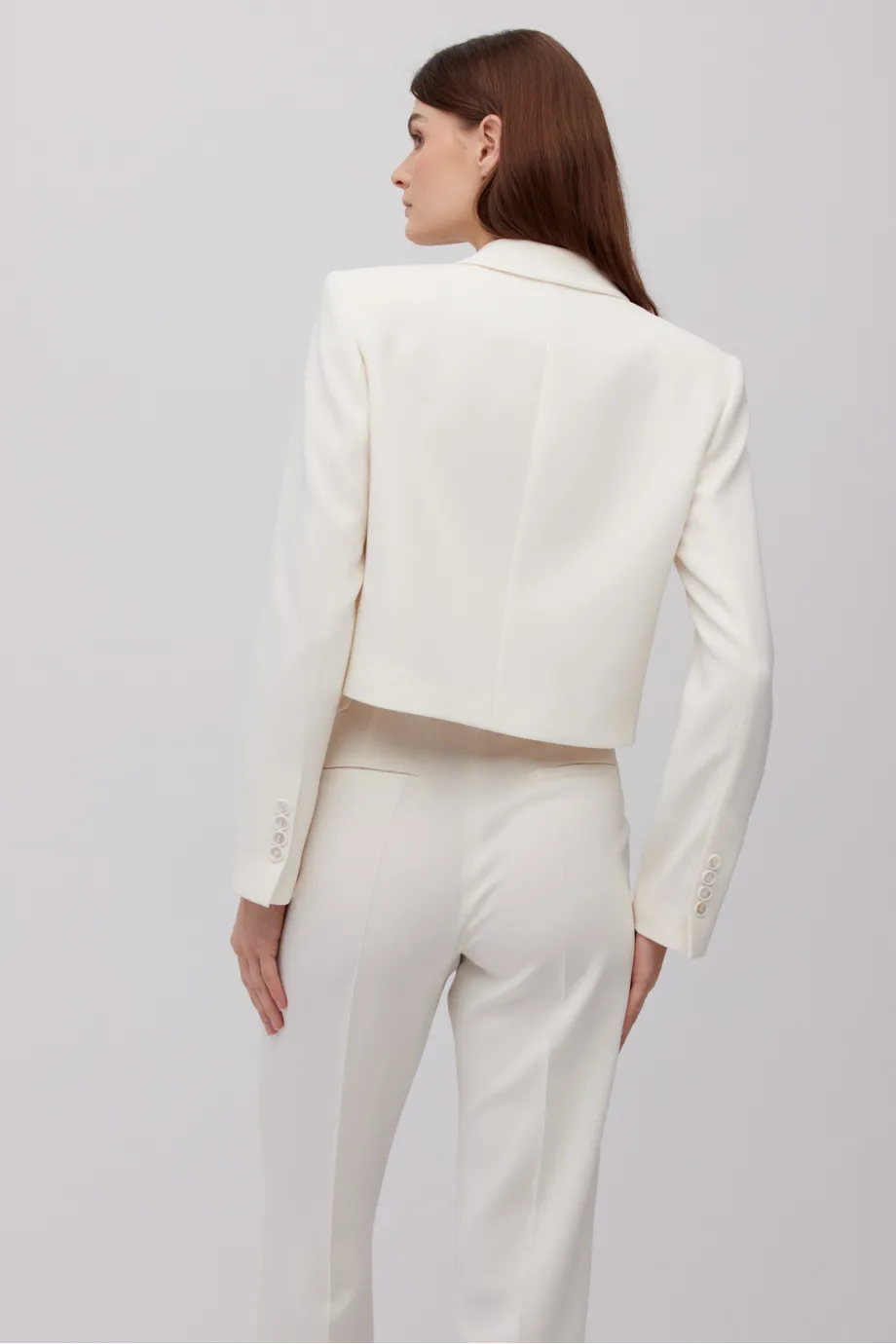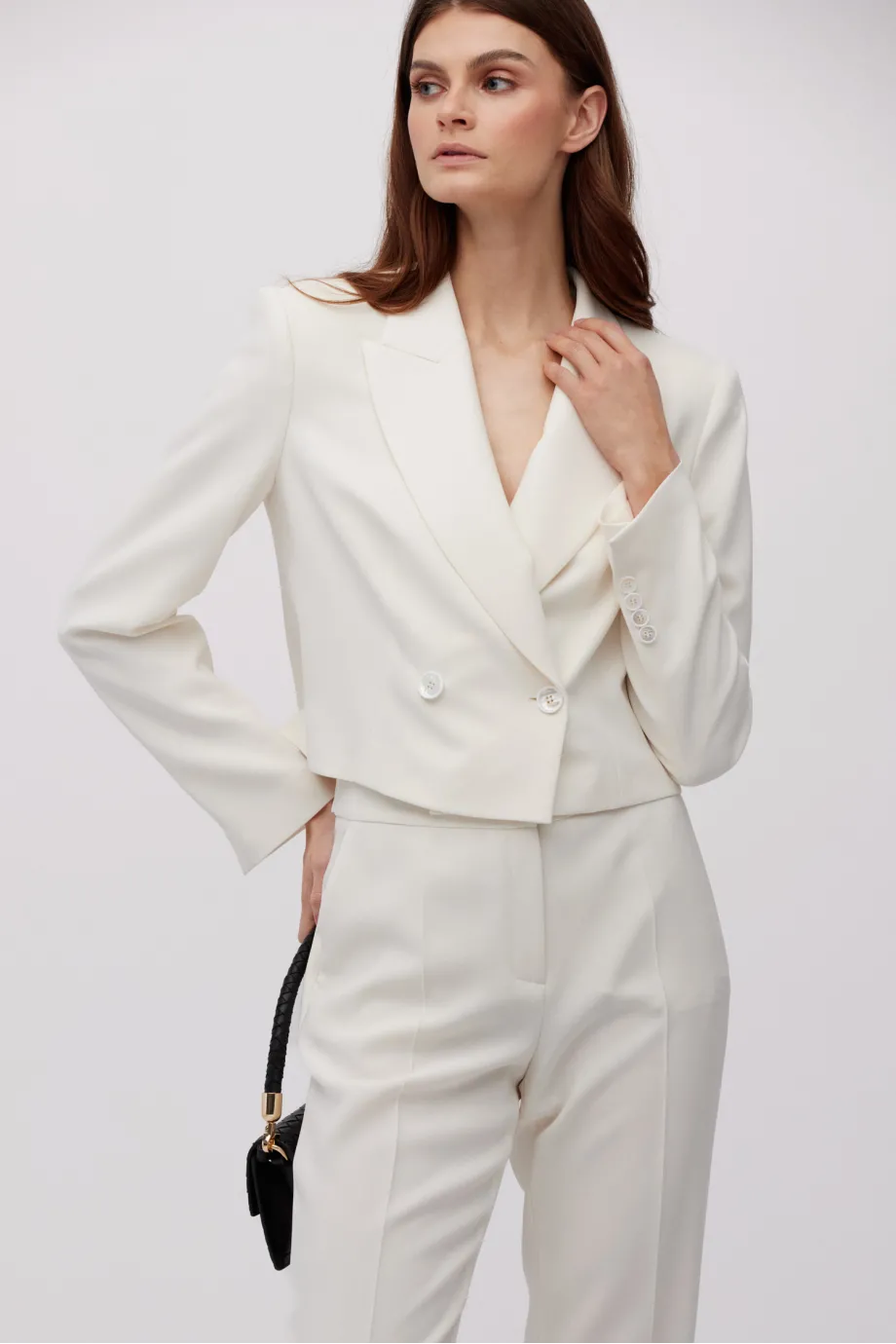 Ten krótki żakiet beżowy w rozbielonym odcieniu ma formę pudełkową z lekko obniżoną linią ramienia. To detal, który wpisuje się w aktualne trendy redefiniowania proporcji w modzie formalnej. Osadzono go na podszewce, co zapewnia komfort wkładania i noszenia, a jednocześnie daje stabilność konstrukcji. Nie posiada kieszeni, dzięki czemu zachowuje czystą i gładką linię. Zapinany jest na dwa guziki – zewnętrzny z dodatkiem macicy perłowej oraz ukryty wewnątrz, z naturalnego orzecha, dla lepszego dopasowania do ciała. Długość do talii (lub lekko poniżej, w zależności od wymiarów właścicielki) pomaga zaakcentować wcięcie i wizualnie wydłużyć nogi.