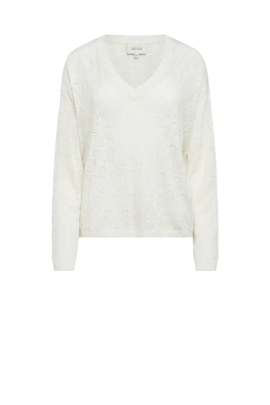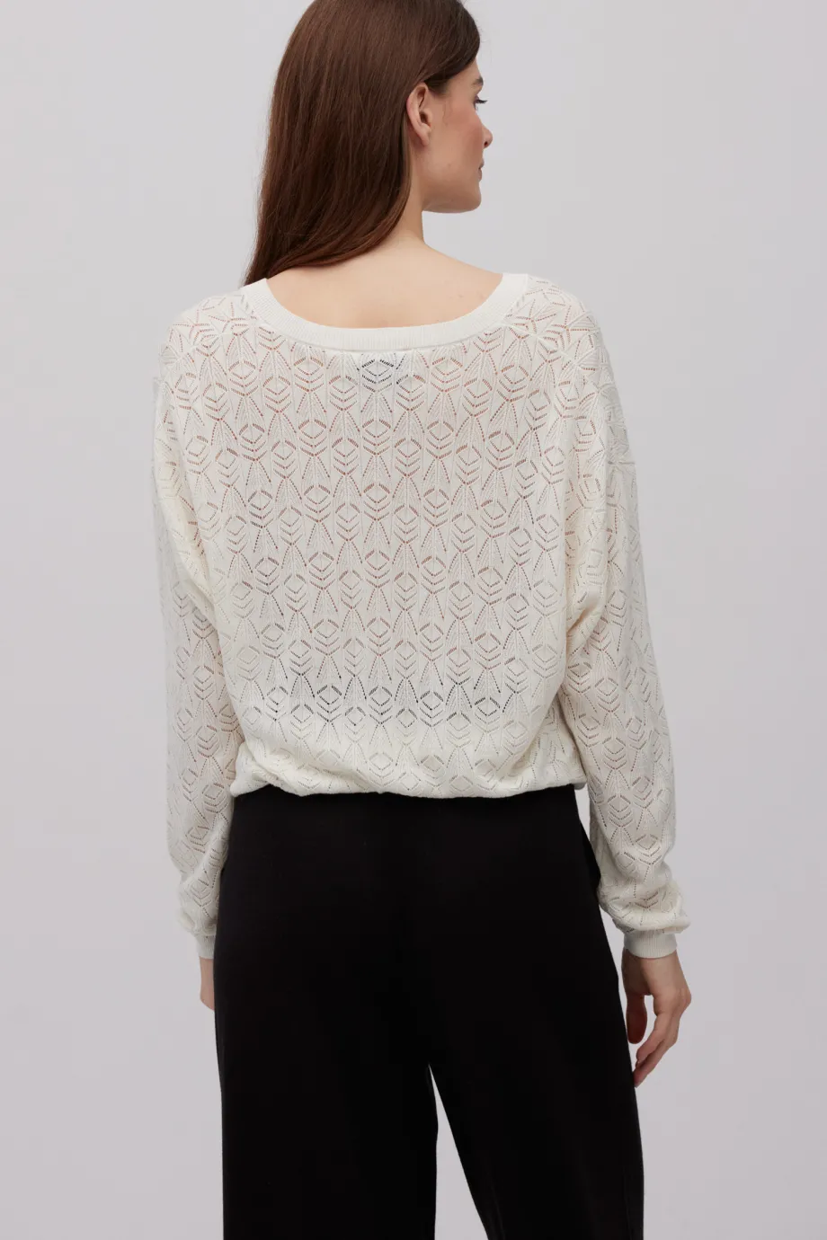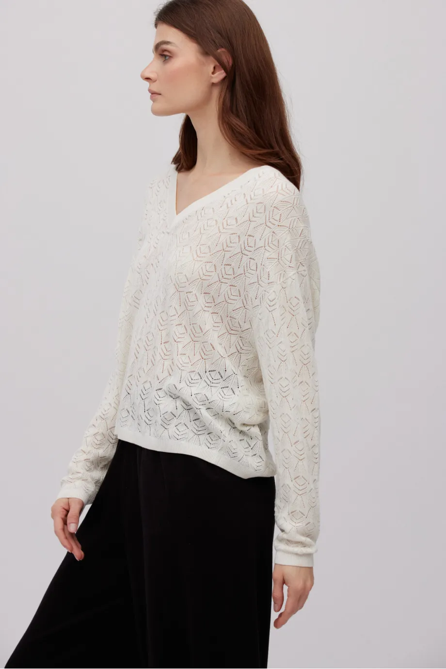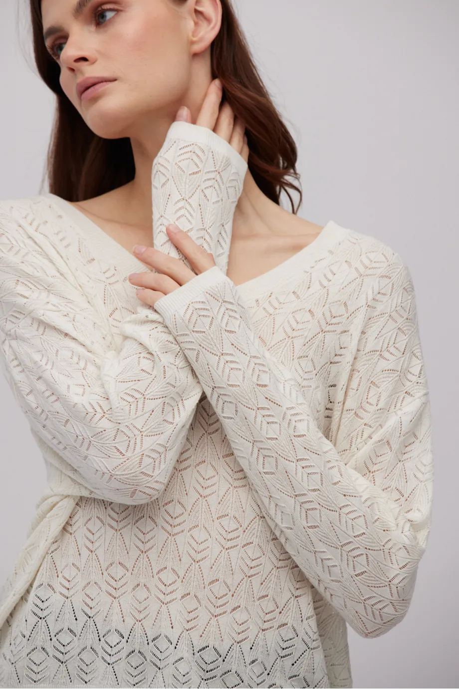 - Bluzka z jedwabiem i kaszmirem, wykonana w splocie open knit, na maszynie o uigleniu 16 GG