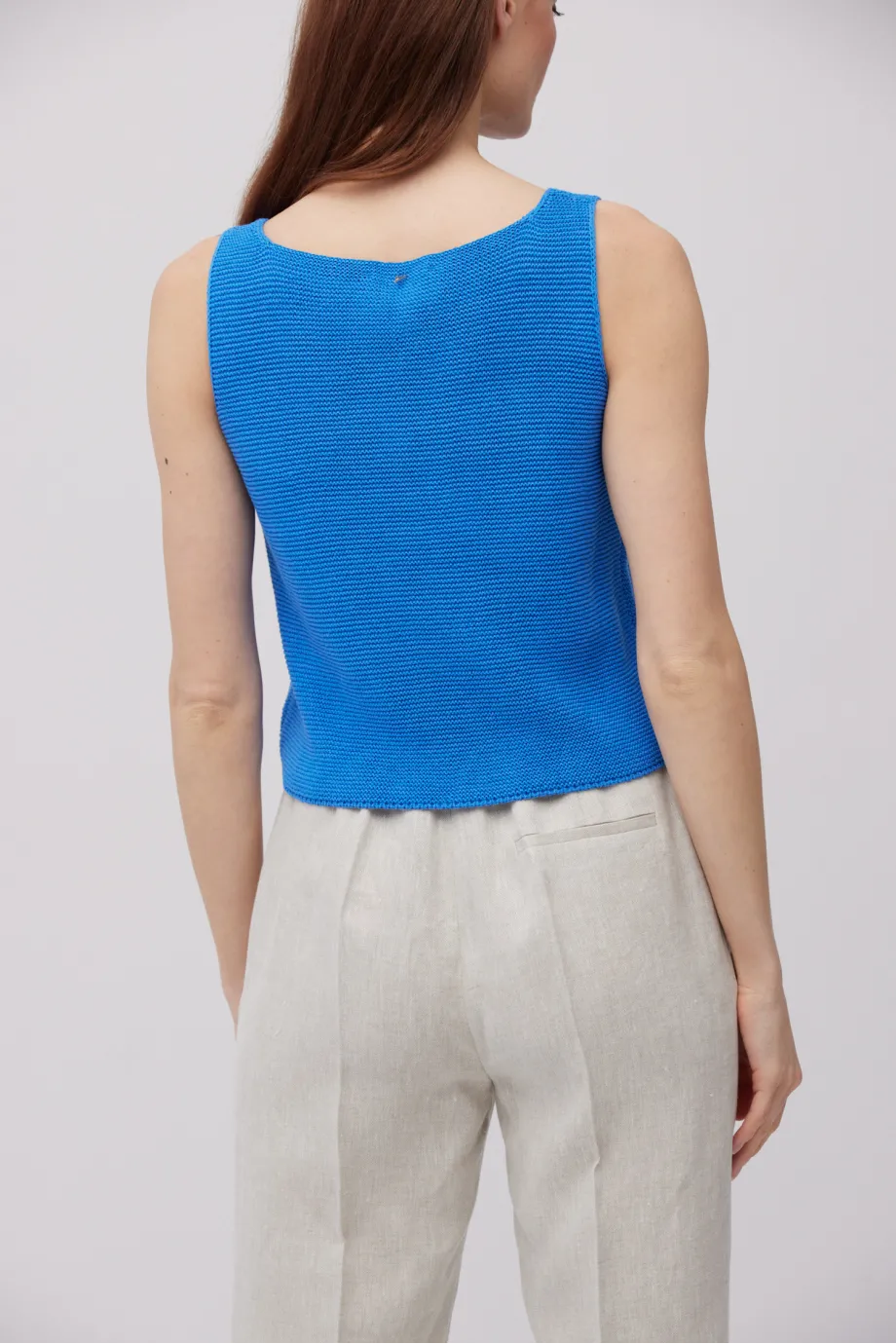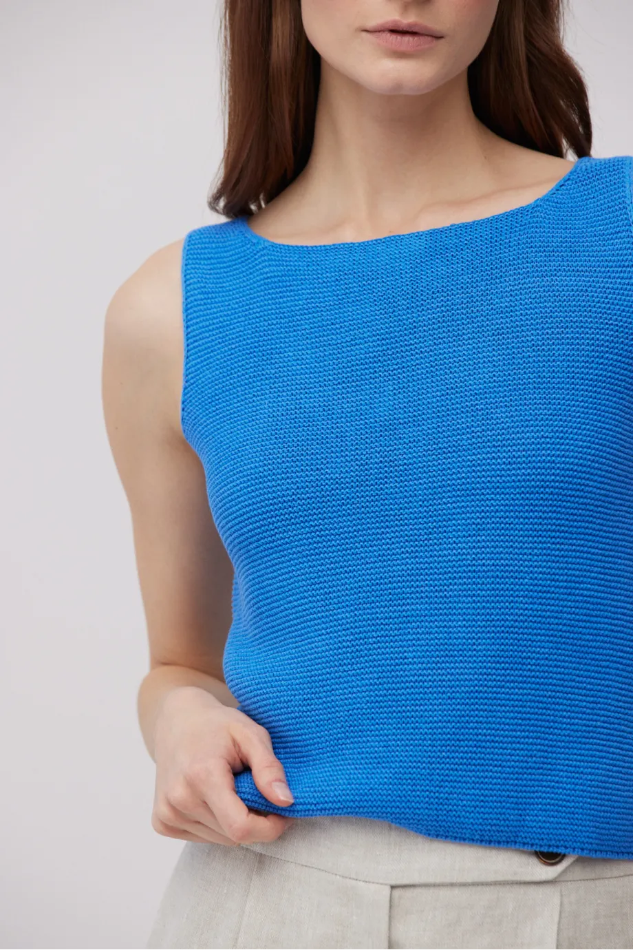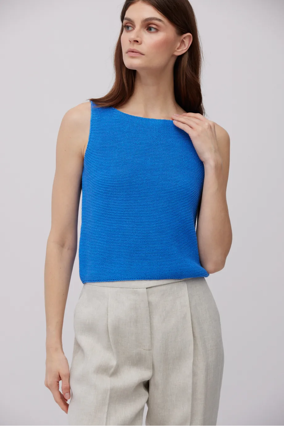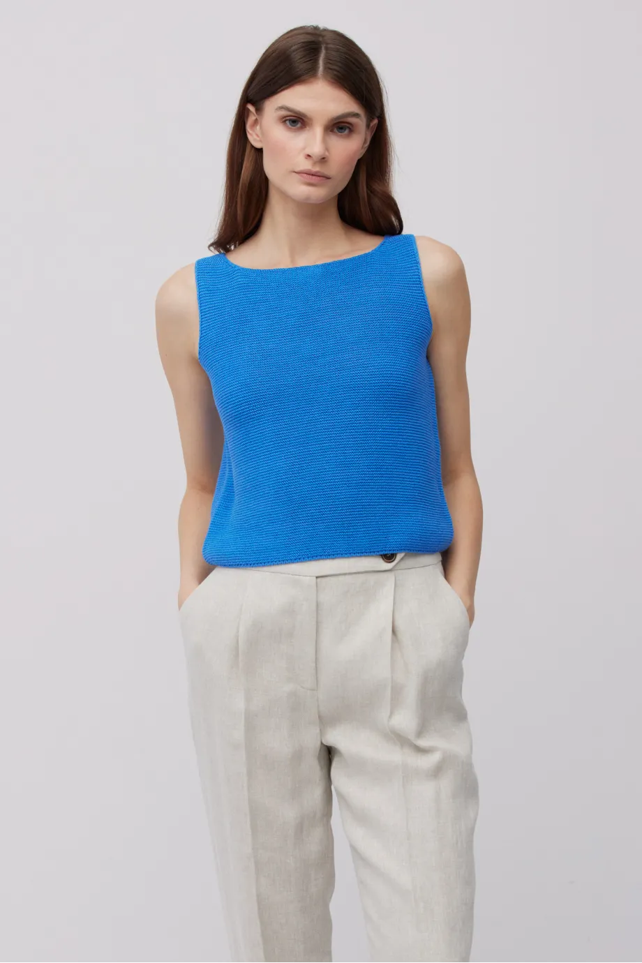 - Bluzka z lnem na szerokich ramiączkach, z dekoltem w łódkę i krótszym krojem
