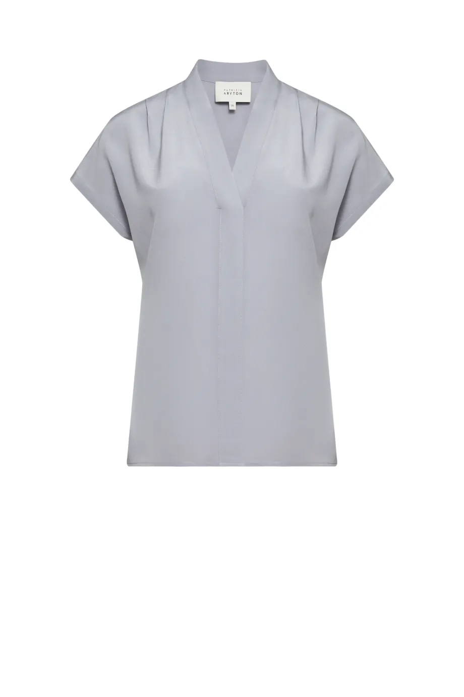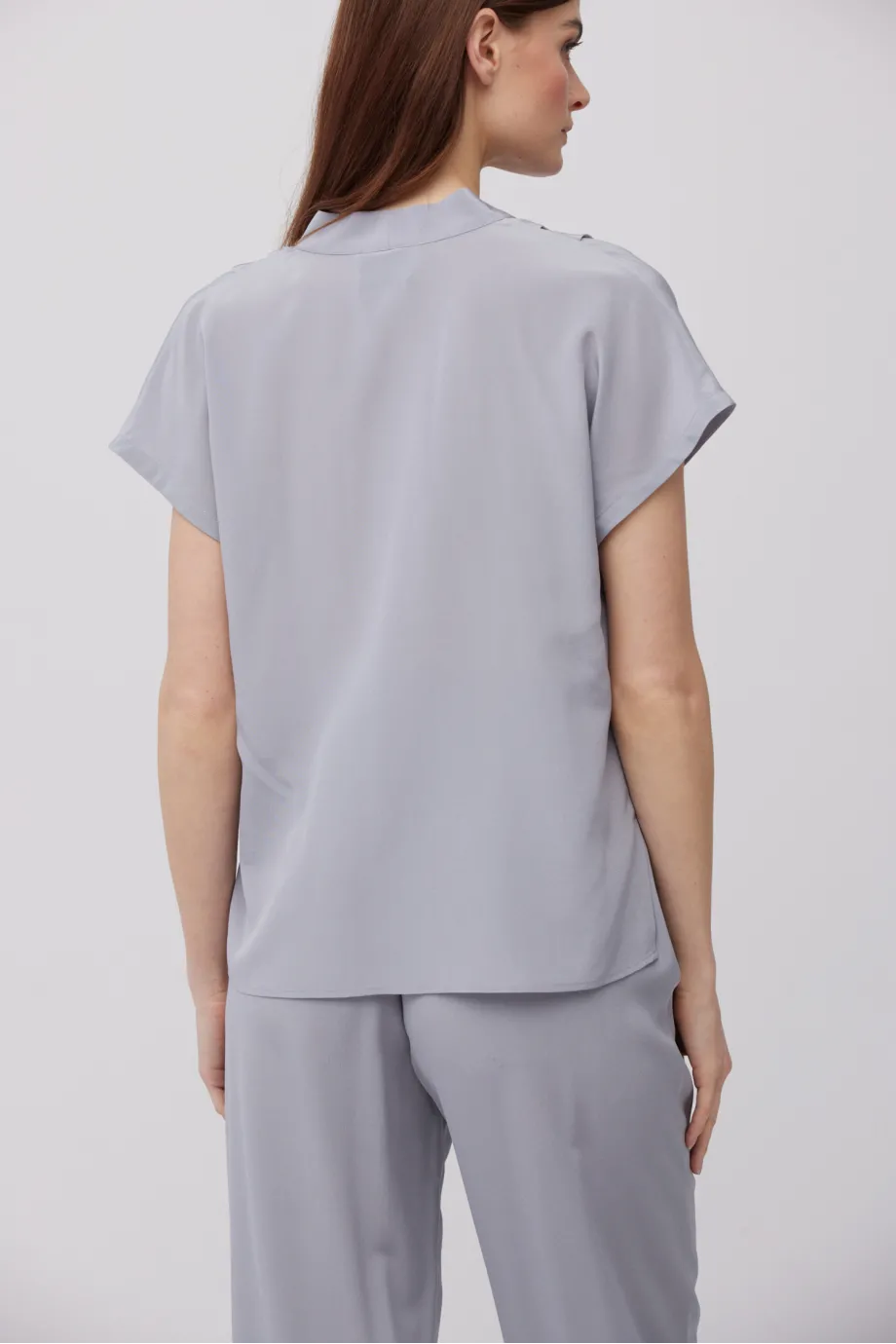 Nie każda prosta bluzka z dekoltem w szpic ma w sobie to coś. Jednak ten model jest wyjątkowy z kilku powodów – posiada bardzo modny i wykwintny kolor, uszyto go z luksusowego jedwabiu i ma niezrównanie wszechstronny krój. Przekonaj się, jakie sekrety skrywa w sobie minimalistyczna i modernistyczna w stylu szara bluzka z krótkim rękawem Patrizia Aryton.