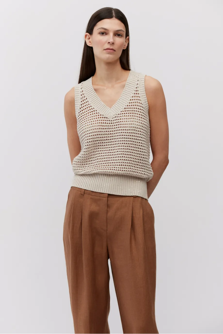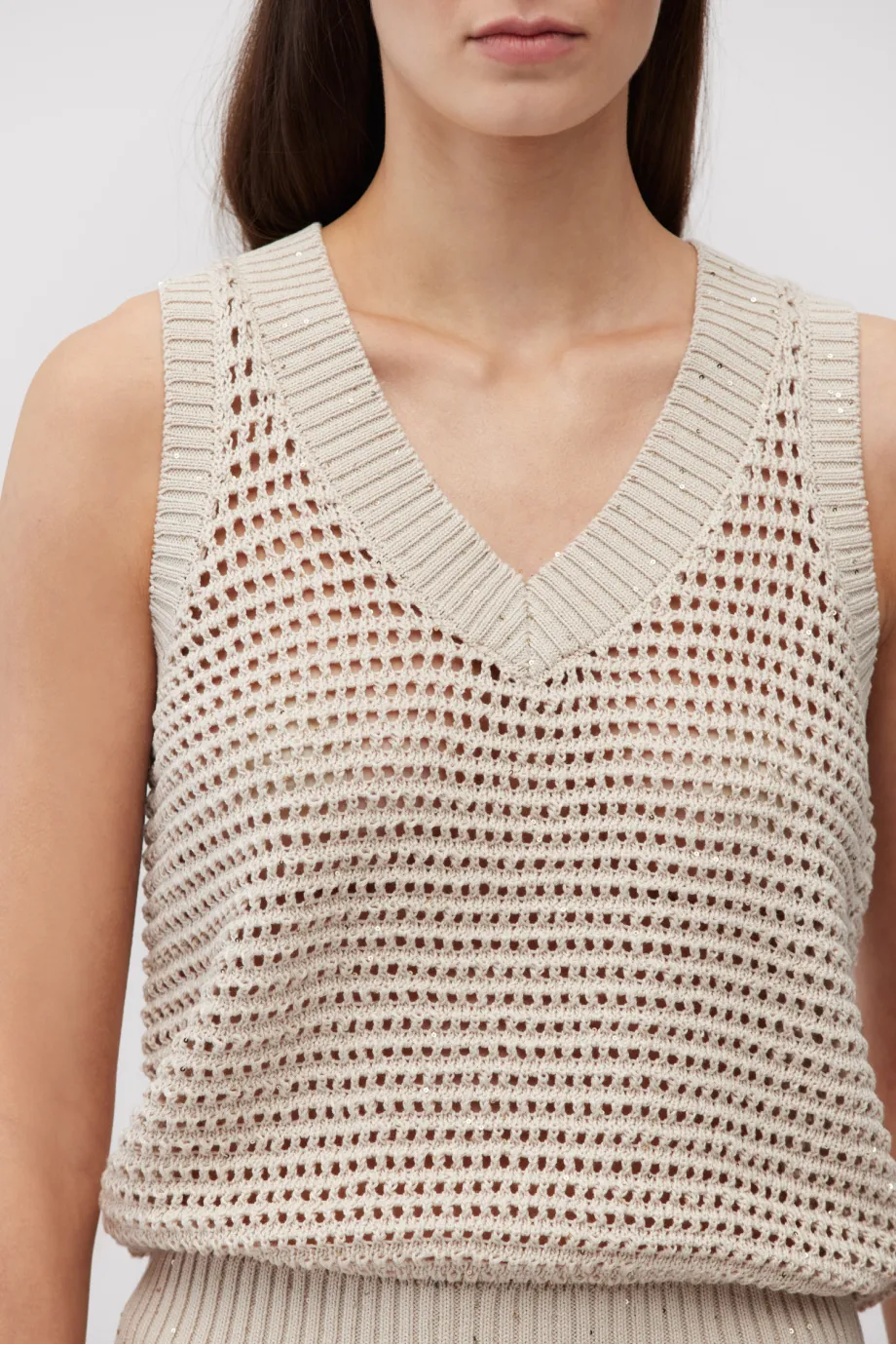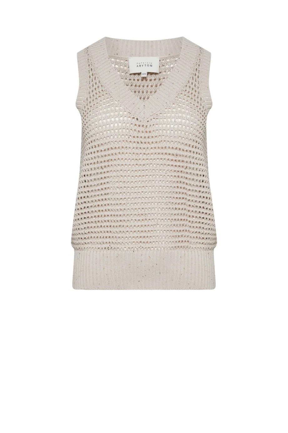 Ten dopasowany top cechuje prosta, dopasowana forma i brak rękawów oraz dekolt w serek, optycznie wysmuklający figurę. Wykończono go pasem prążkowanej dzianiny, podobnie jak krawędzie po bokach i dół ubrania. Przód i tył bluzki powstał z dzianiny w splocie pointelle, stworzonej na maszynie o uigleniu 5 GG. Całość jest lekka i delikatnie lejąca w fakturze, ale wzorowo pozycjonuje się na ciele.