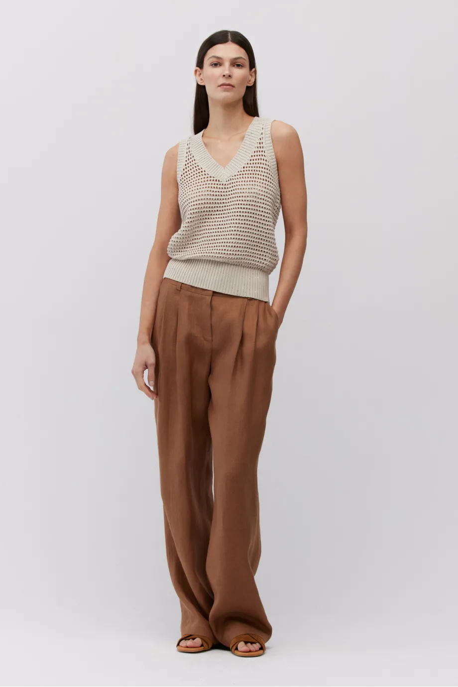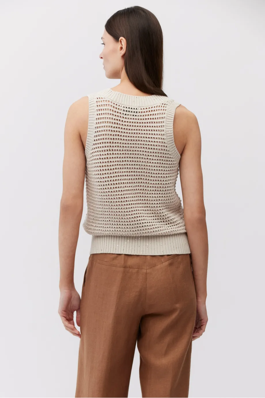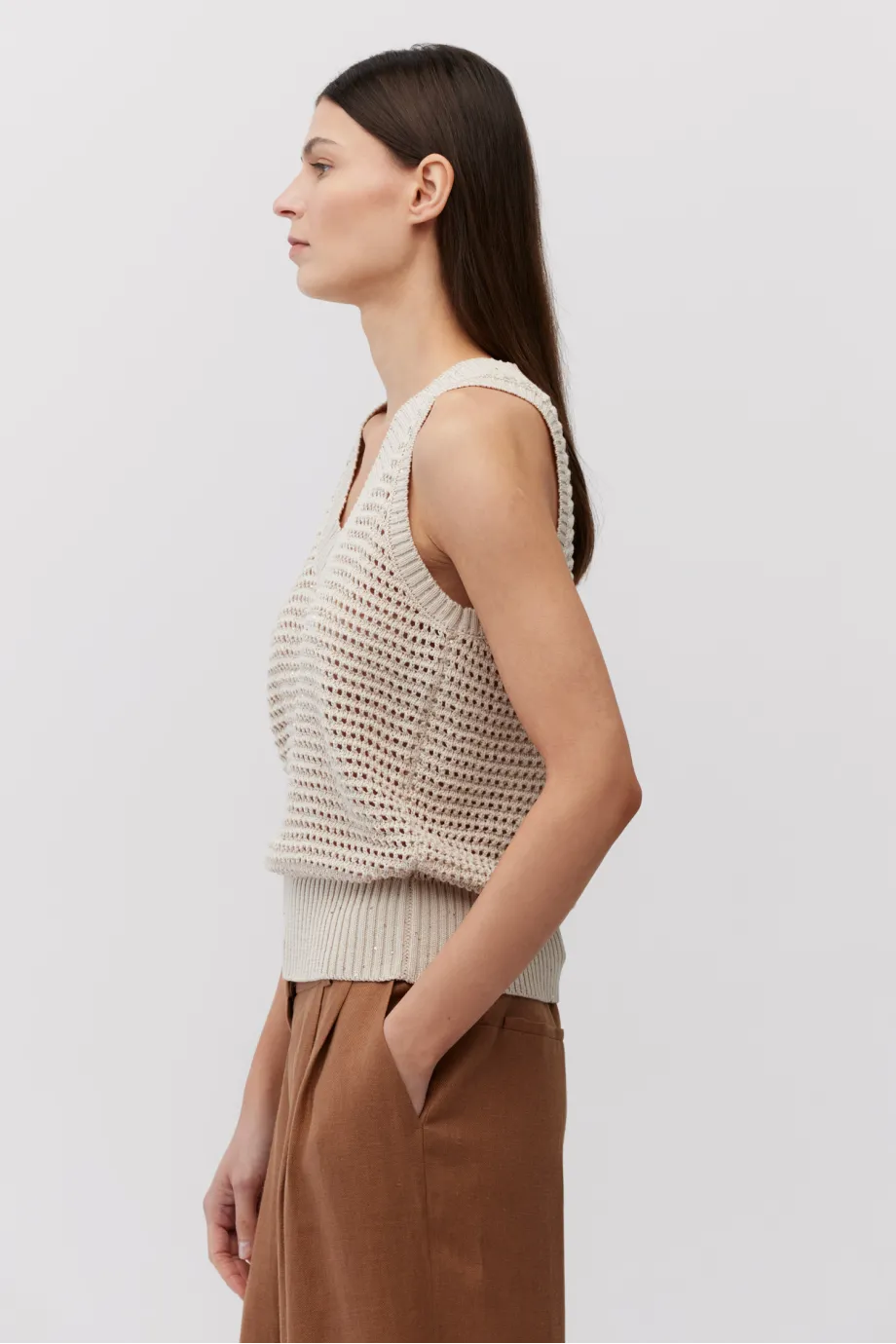 Ten dopasowany top cechuje prosta, dopasowana forma i brak rękawów oraz dekolt w serek, optycznie wysmuklający figurę. Wykończono go pasem prążkowanej dzianiny, podobnie jak krawędzie po bokach i dół ubrania. Przód i tył bluzki powstał z dzianiny w splocie pointelle, stworzonej na maszynie o uigleniu 5 GG. Całość jest lekka i delikatnie lejąca w fakturze, ale wzorowo pozycjonuje się na ciele.