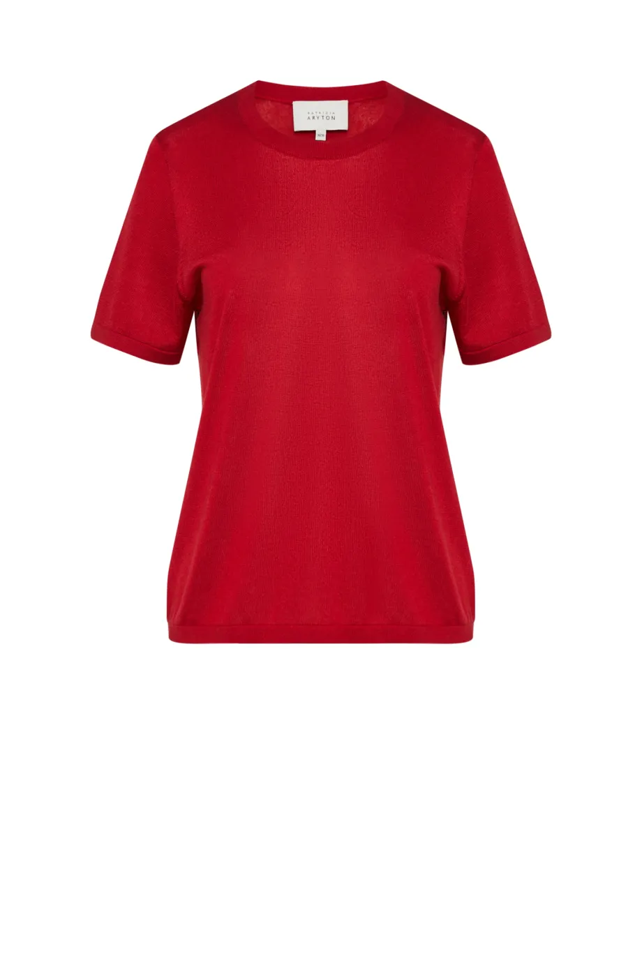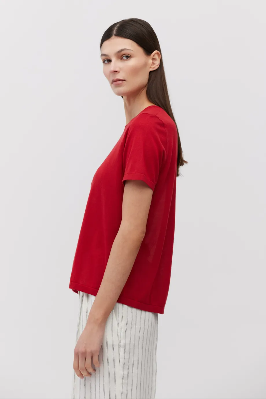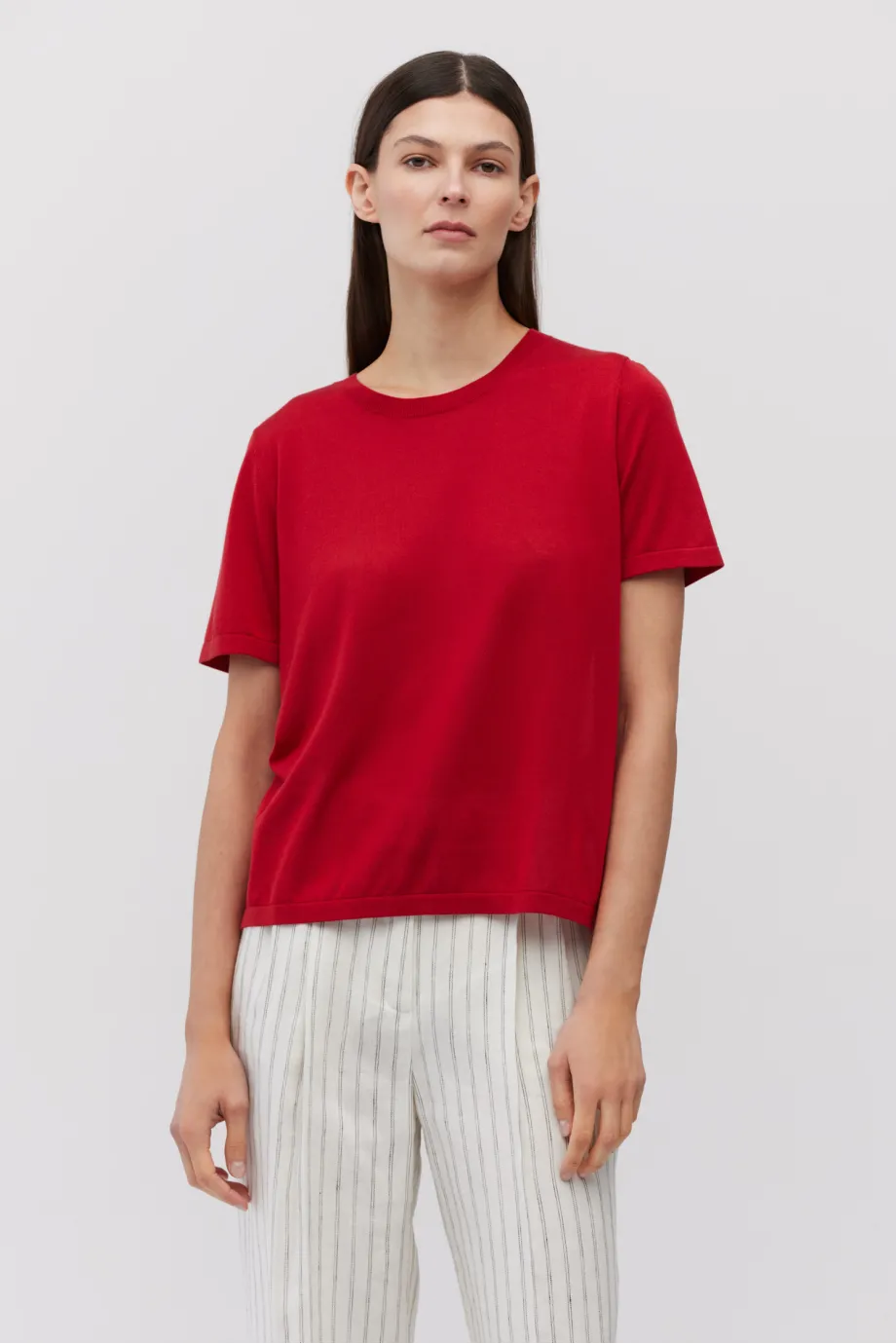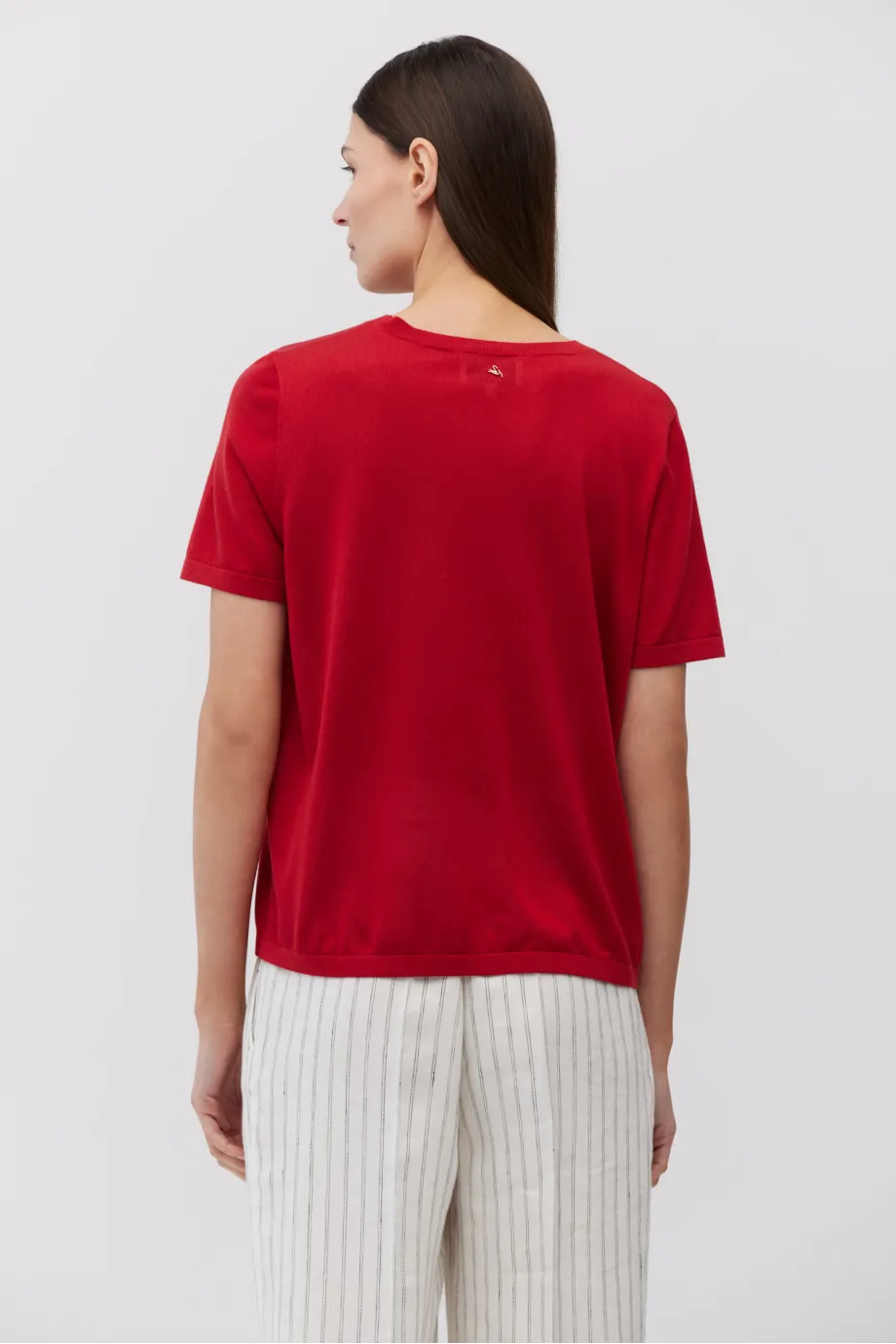 Bluzka z okrągłym dekoltem zachwyca prostym, ponadczasowym krojem. Dzięki krótkiemu rękawowi i miękkiej dzianinie typu single jersey subtelnie układa się na sylwetce, zapewniając komfort i swobodę ruchu. Model wykonany został na maszynie 16 GG, co gwarantuje delikatność splotu i precyzję wykończenia. Energetyczna czerwień wnosi do stylizacji wyrazistość i kobiecość świetnie komponując się z klasycznymi spodniami z szeroką nogawką, garniturem lub spódnicą.