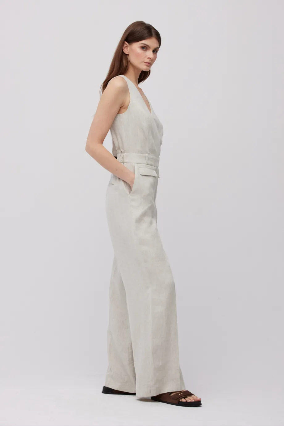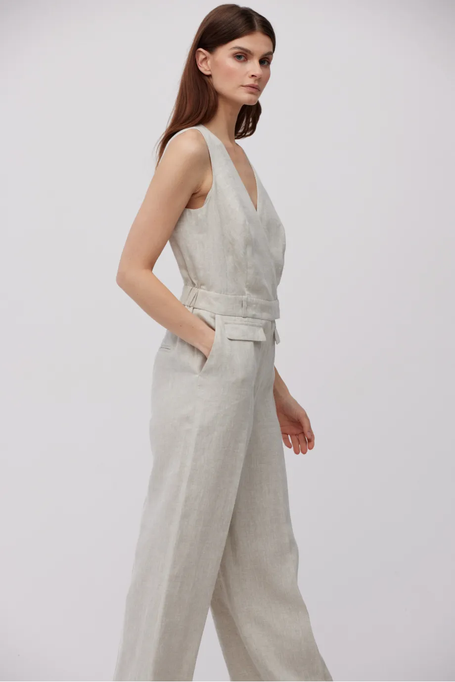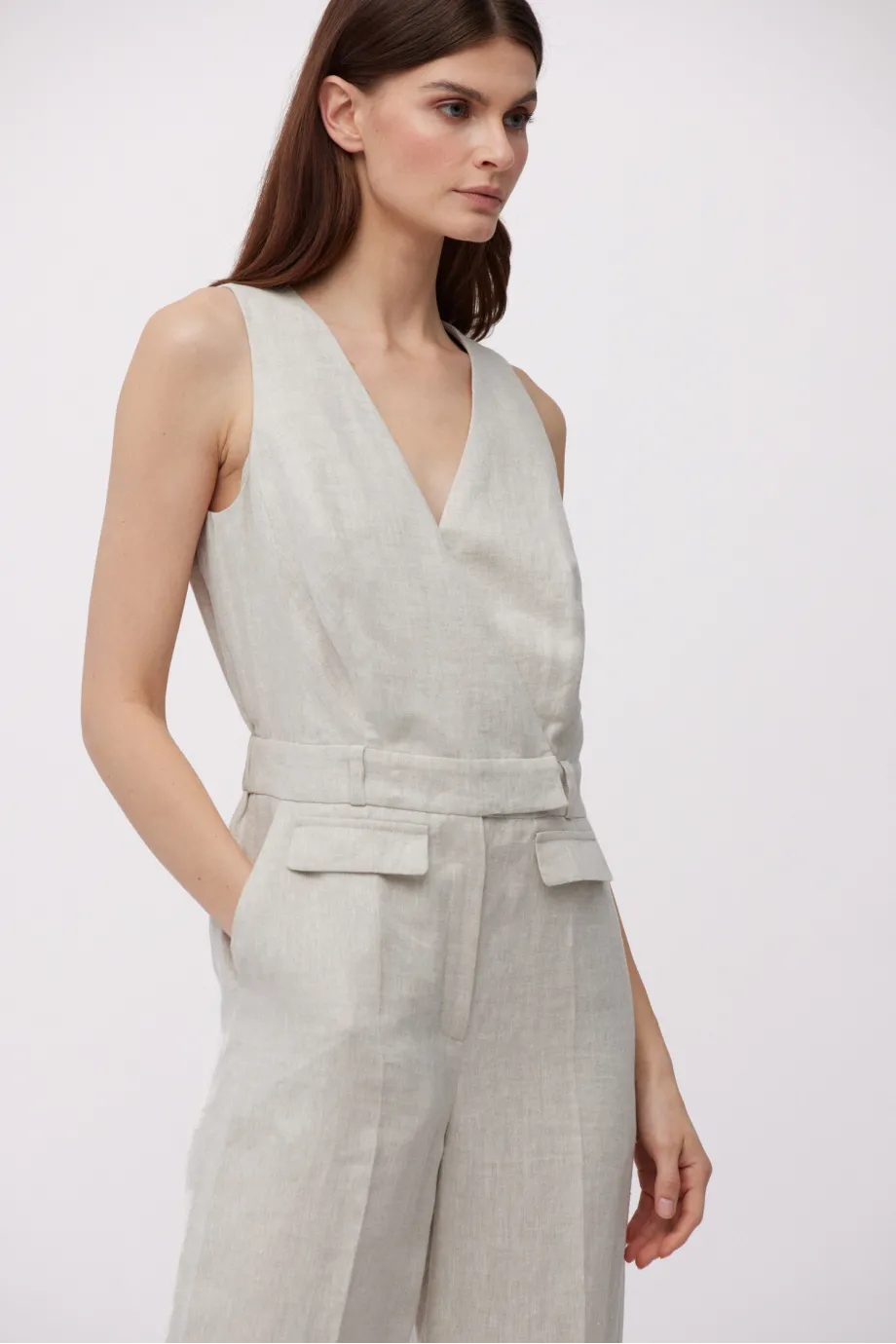 - Beżowy kombinezon z lnu z dekoltem w szpic