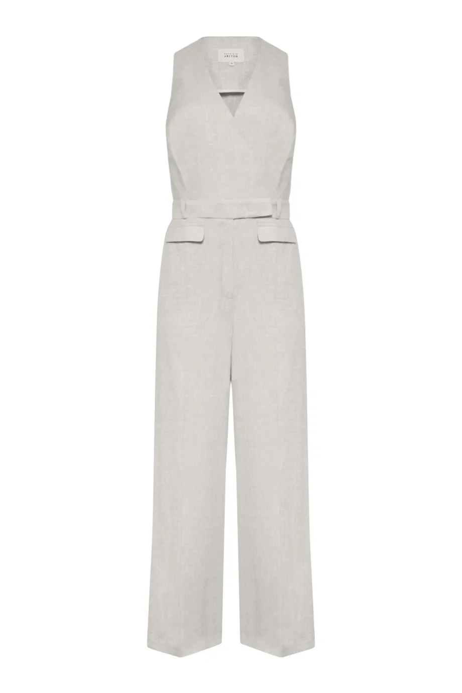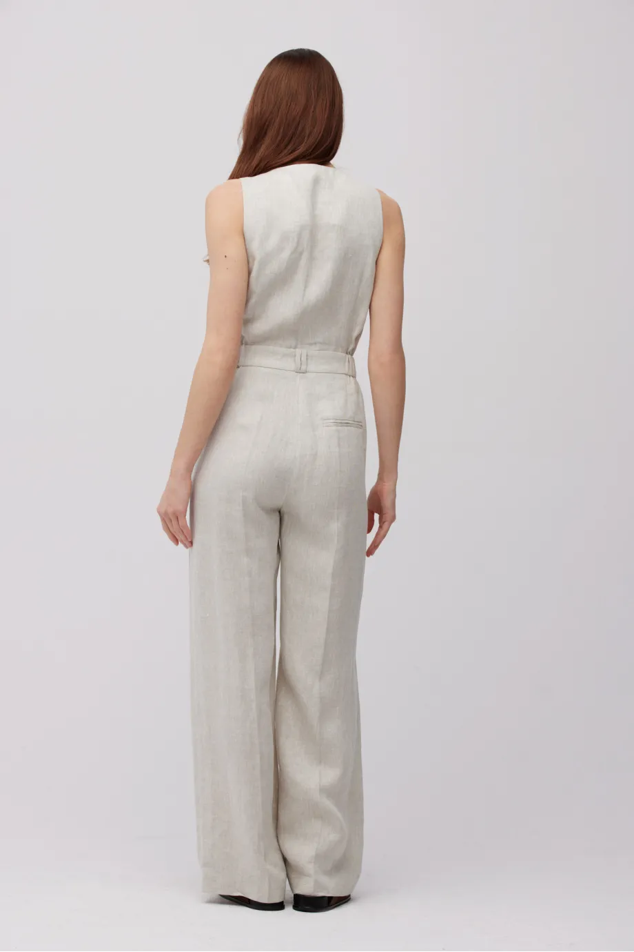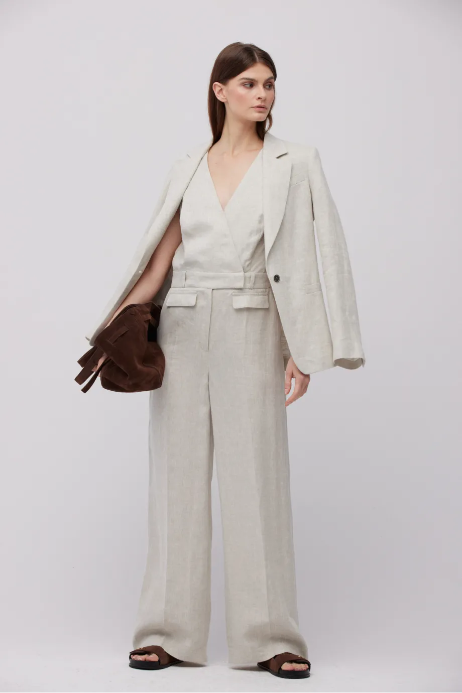 - Beżowy kombinezon z lnu z dekoltem w szpic