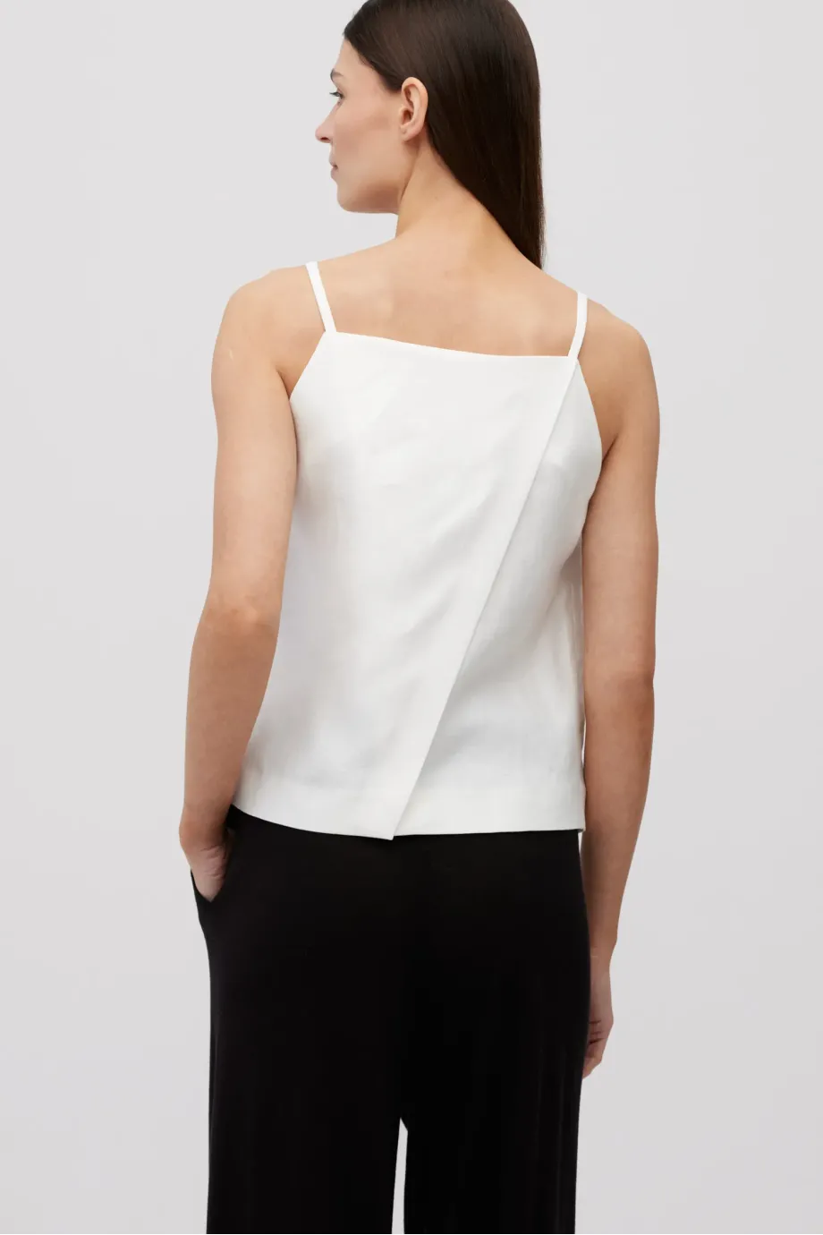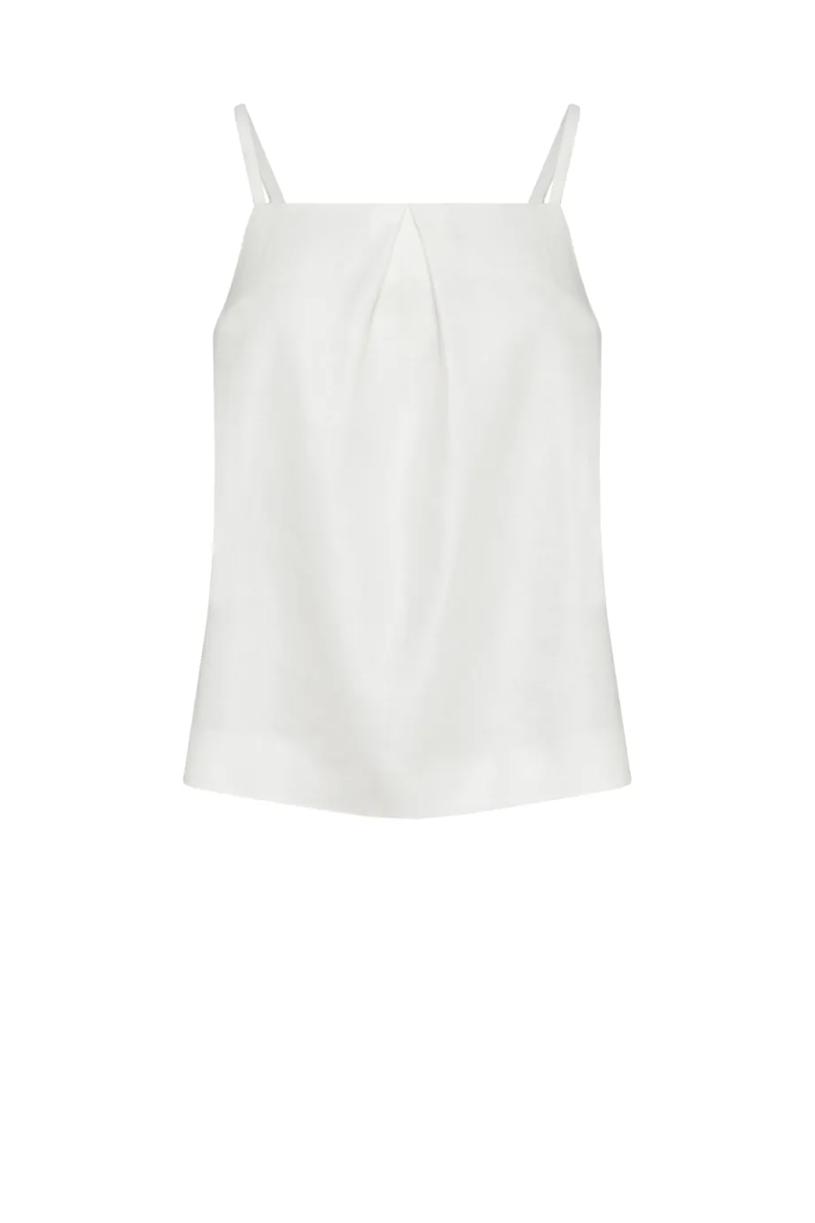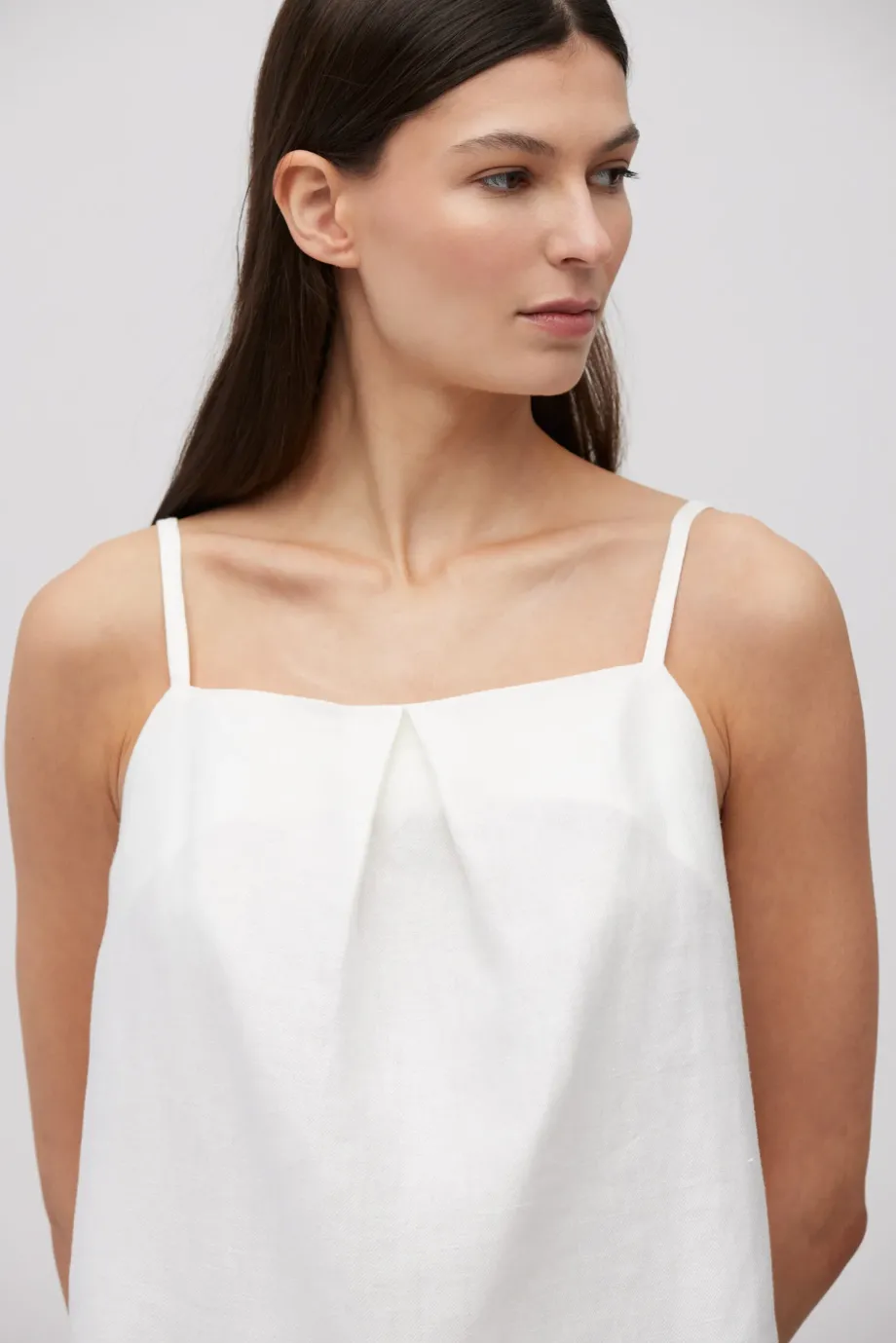 Biały top z lnu. Luźna, trapezowa forma. Z przodu zakładka, z tyłu kopertowe założenie. Cienkie ramiączka.