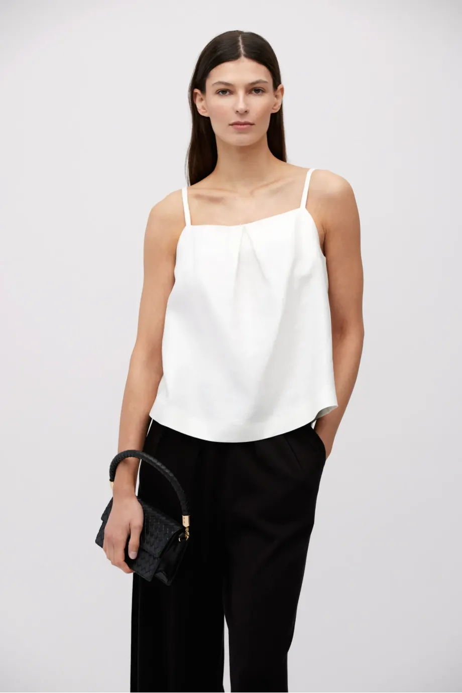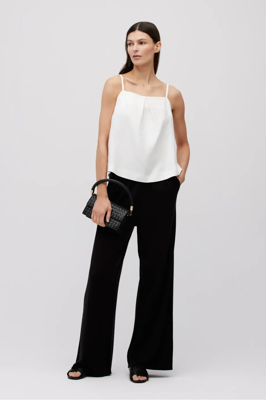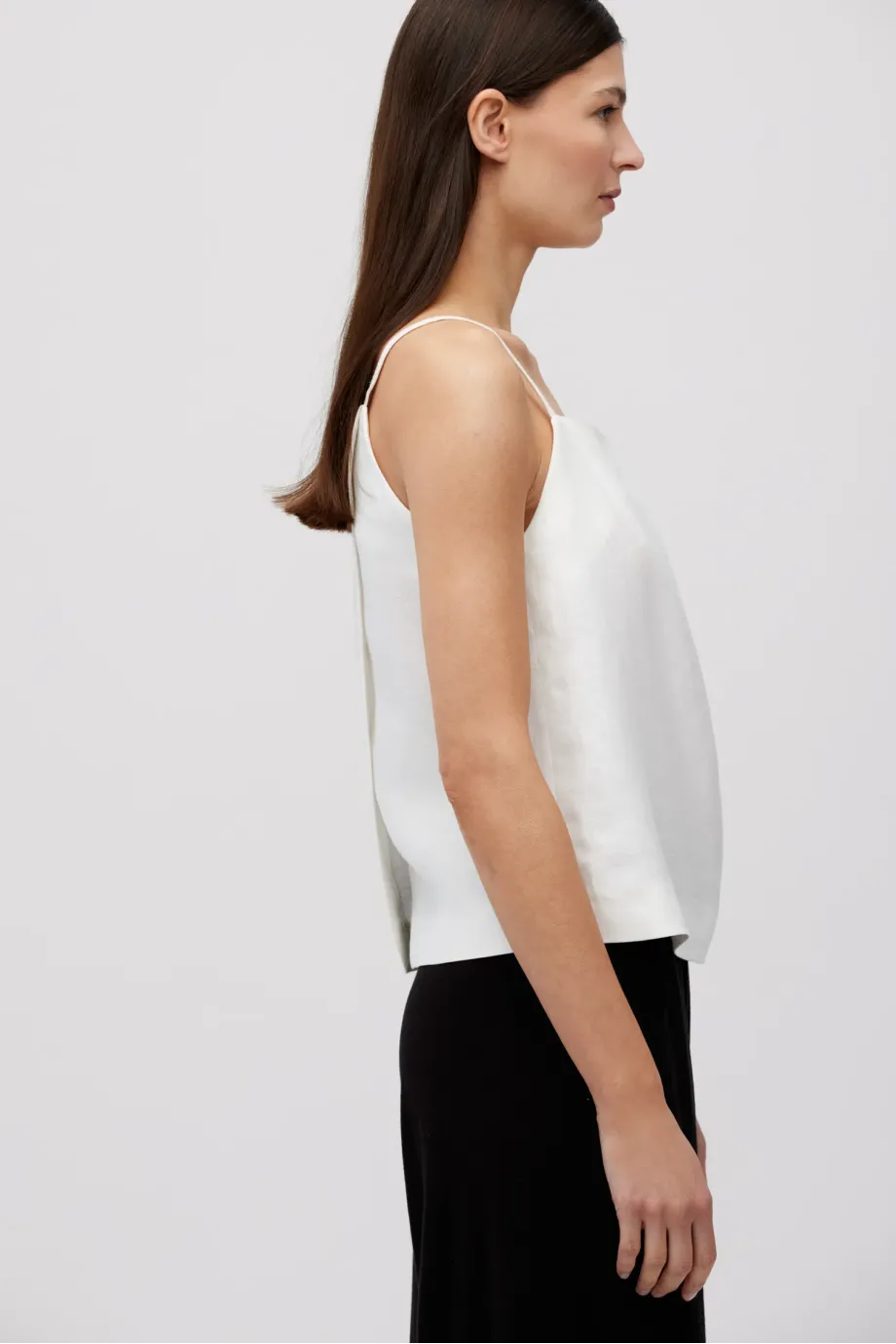 Biały top z lnu. Luźna, trapezowa forma. Z przodu zakładka, z tyłu kopertowe założenie. Cienkie ramiączka.