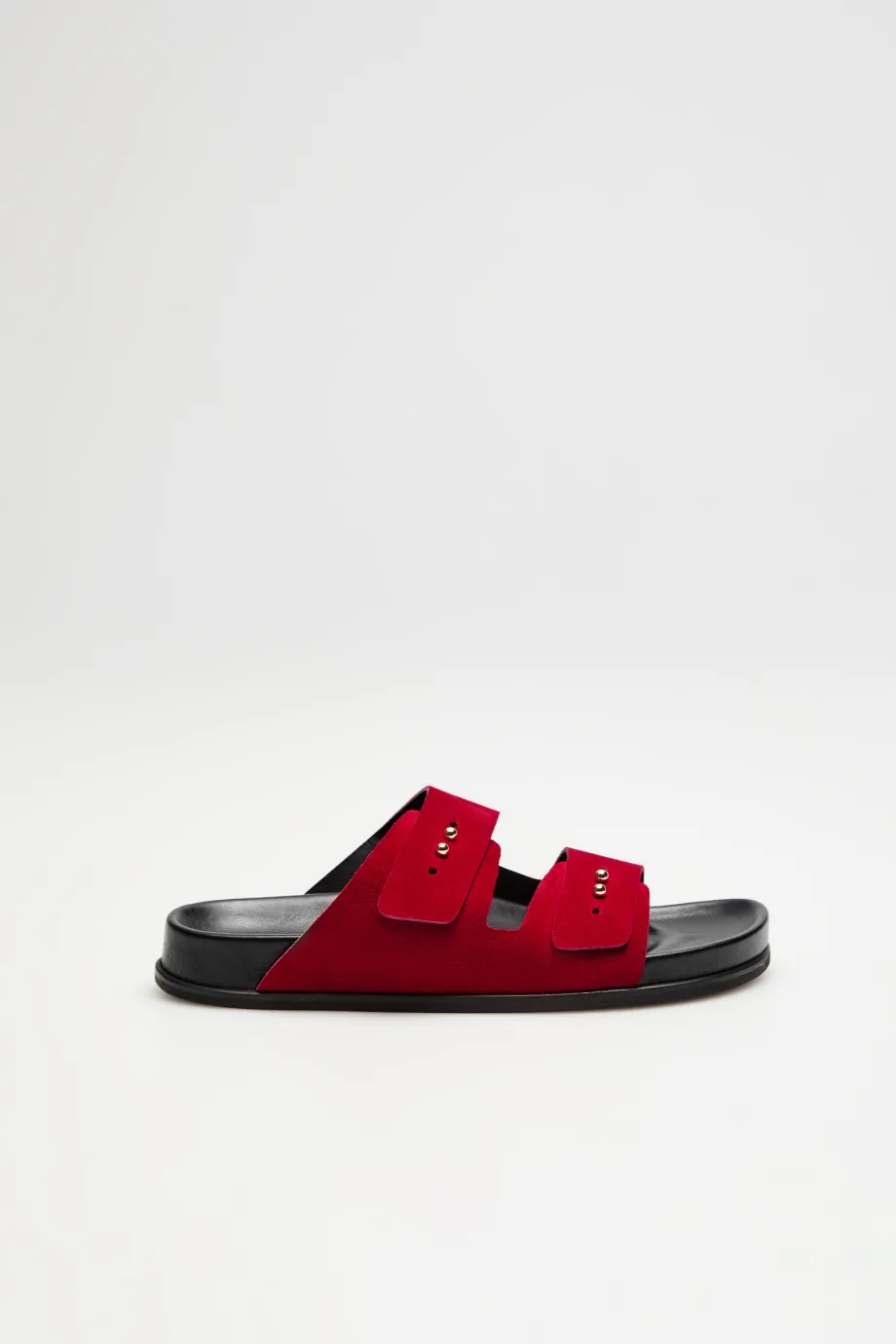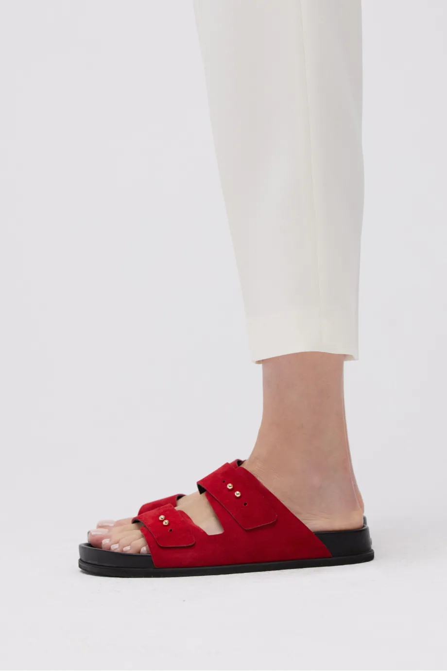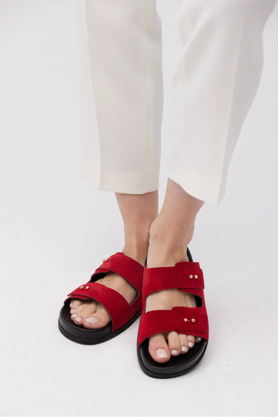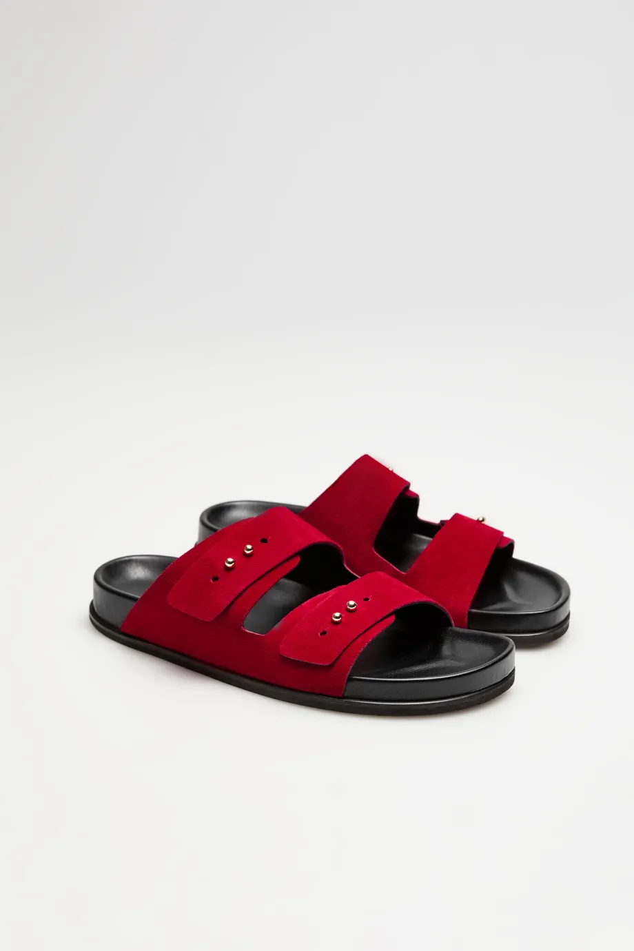 - Klapki z naturalnej czerwonej skóry zamszowej, z dwoma szerokimi paskami, ręcznie wykonane w polskiej manufakturze