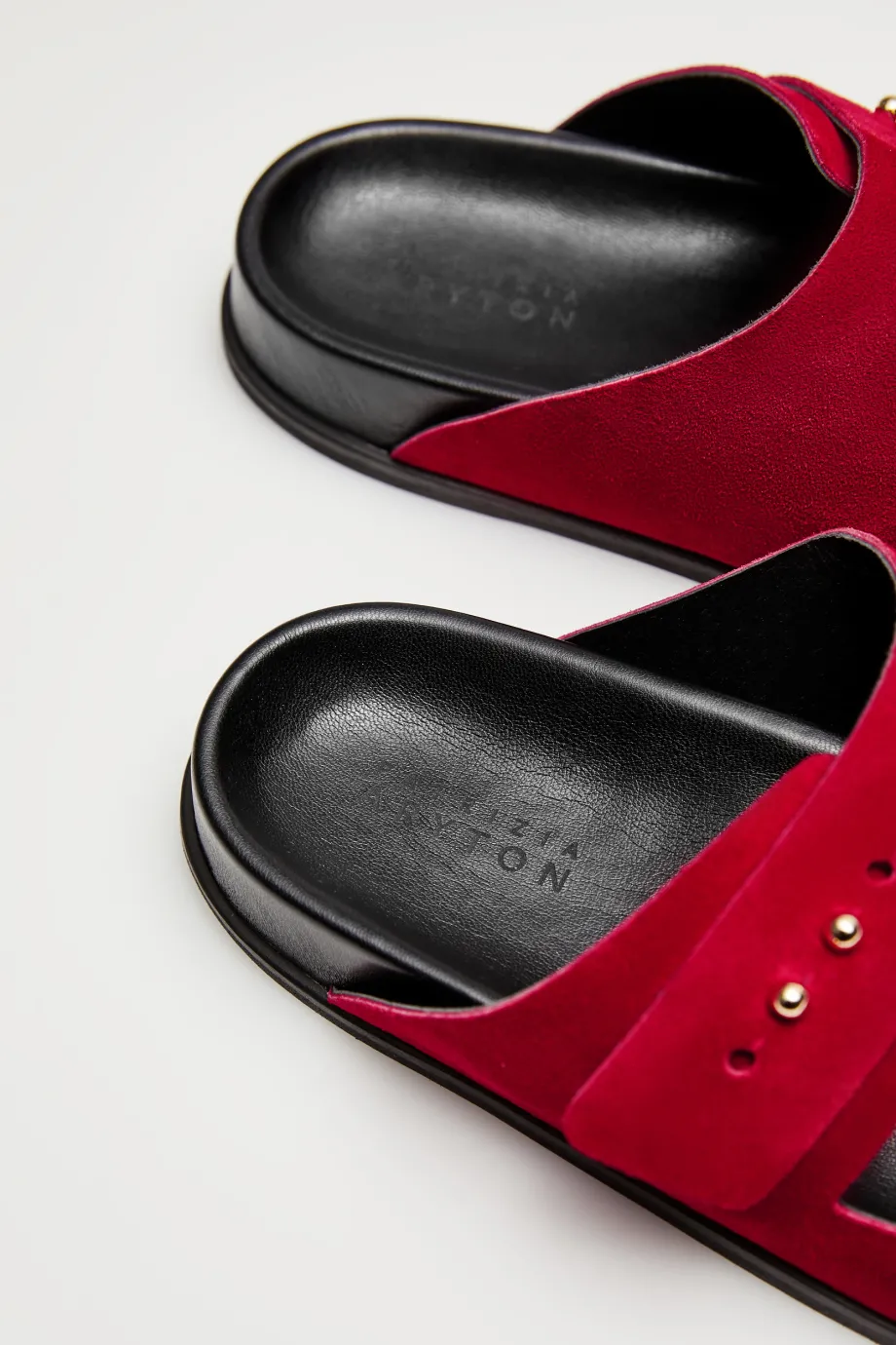 Zamszowe klapki Patrizia Aryton posiadają charakterystyczny krój. Dwa szerokie, regulowane paski pozwalają precyzyjnie dopasować obuwie do stopy. Czarna, profilowana wkładka i podeszwa kontrastują z intensywnym kolorem zamszu, podkreślając jego głębię i dodając całości charakteru. Subtelnym niuansem są dwie maleńkie kuleczki na każdym pasku, stanowiące element mechanizmu regulującego stopień dopasowania obuwia do kształtu stóp.