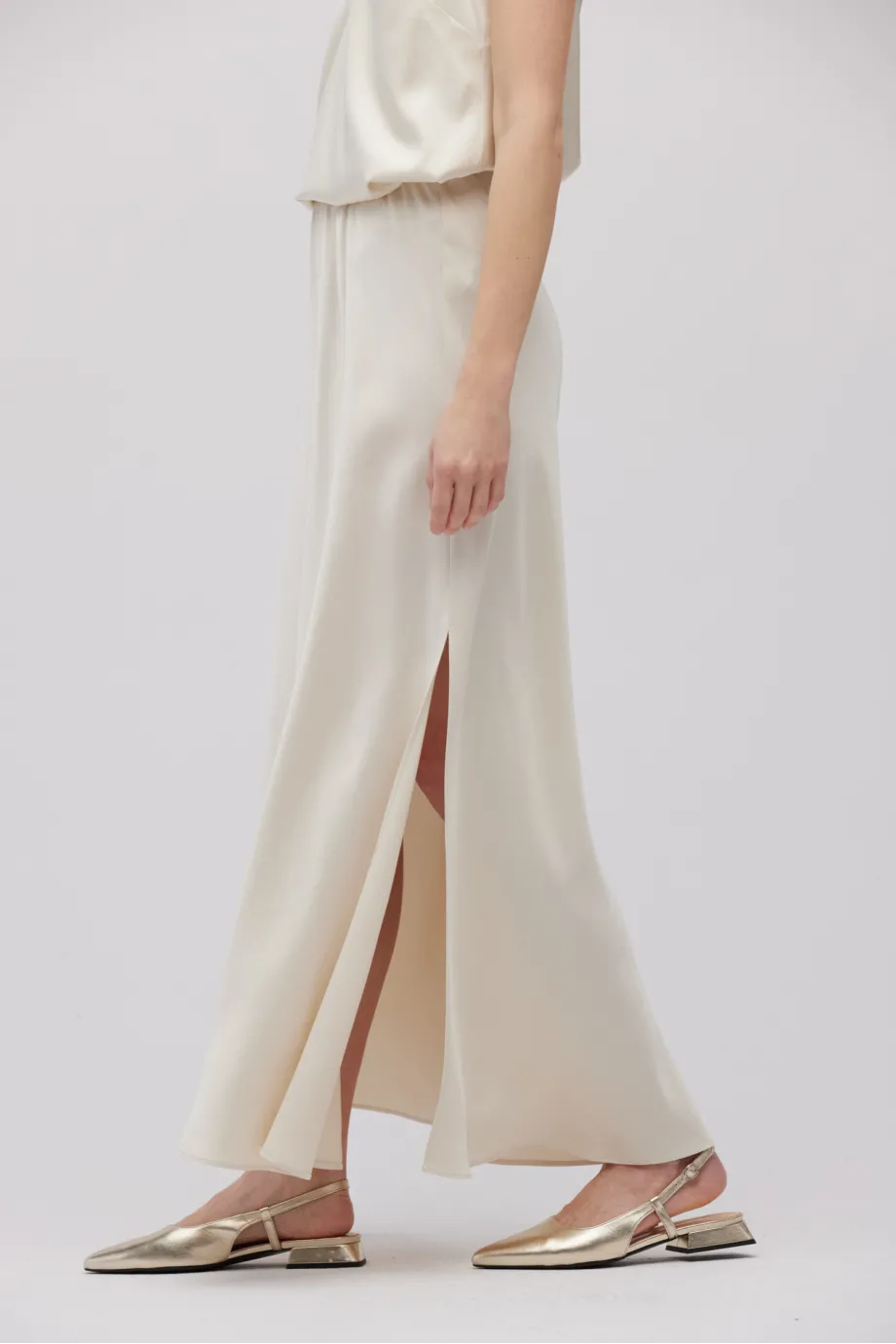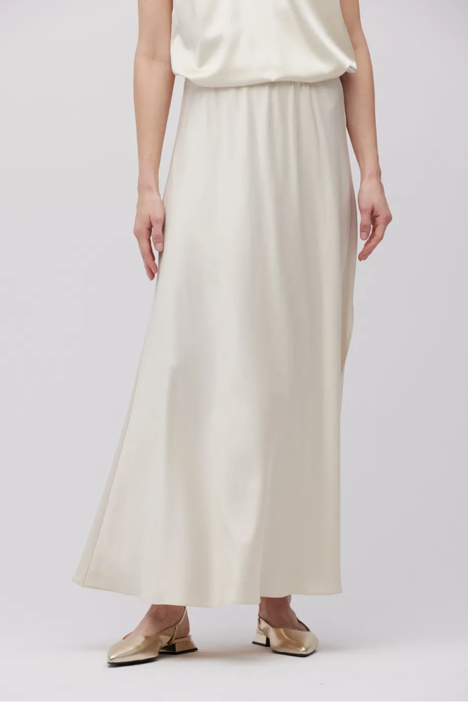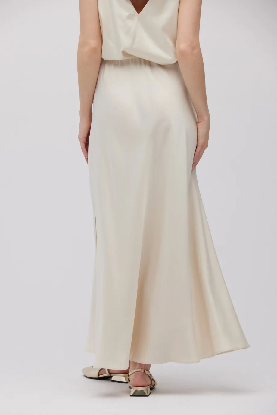 - Długa spódnica w odcieniu ciepłego beżu, o luźnym fasonie i elastycznej talii