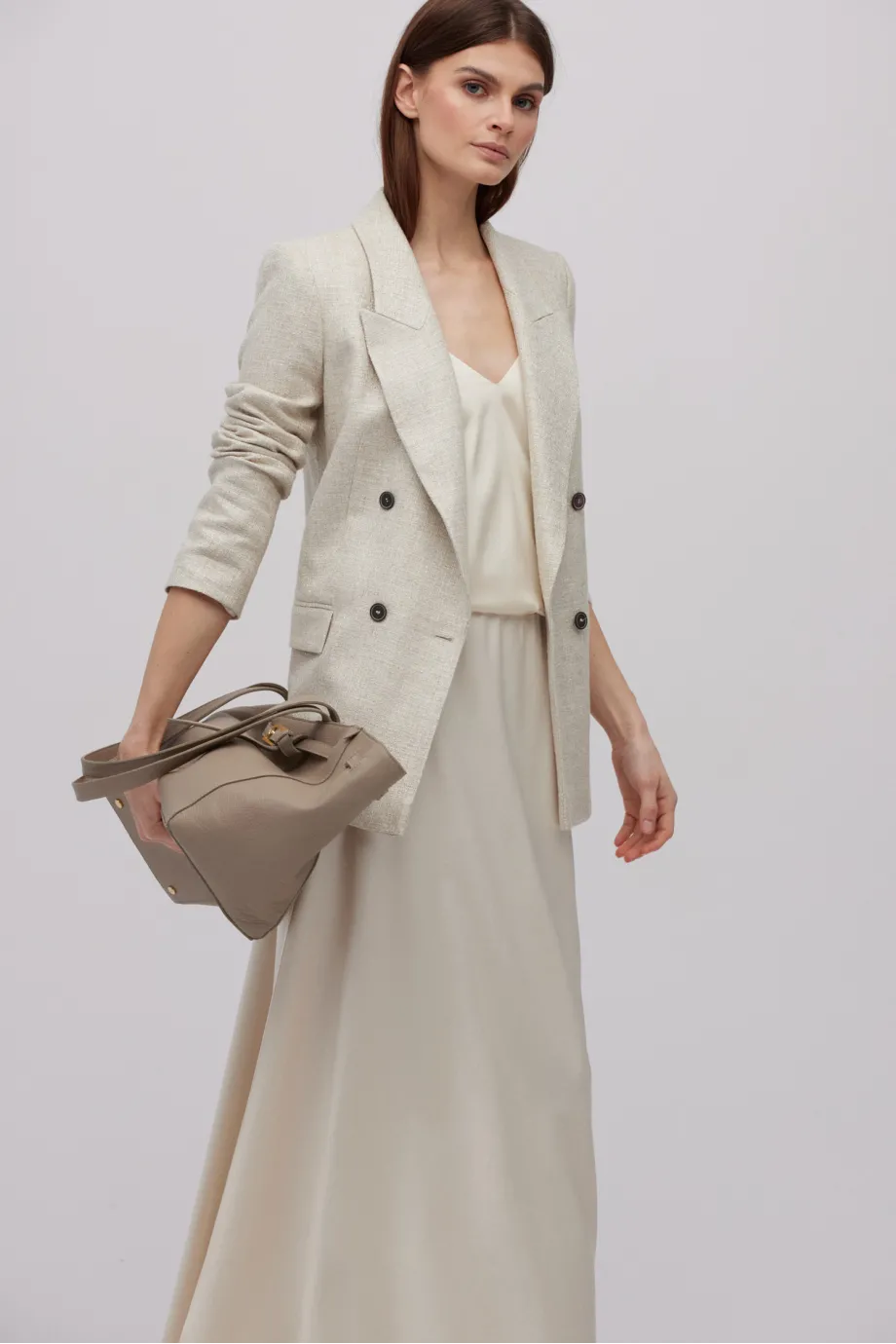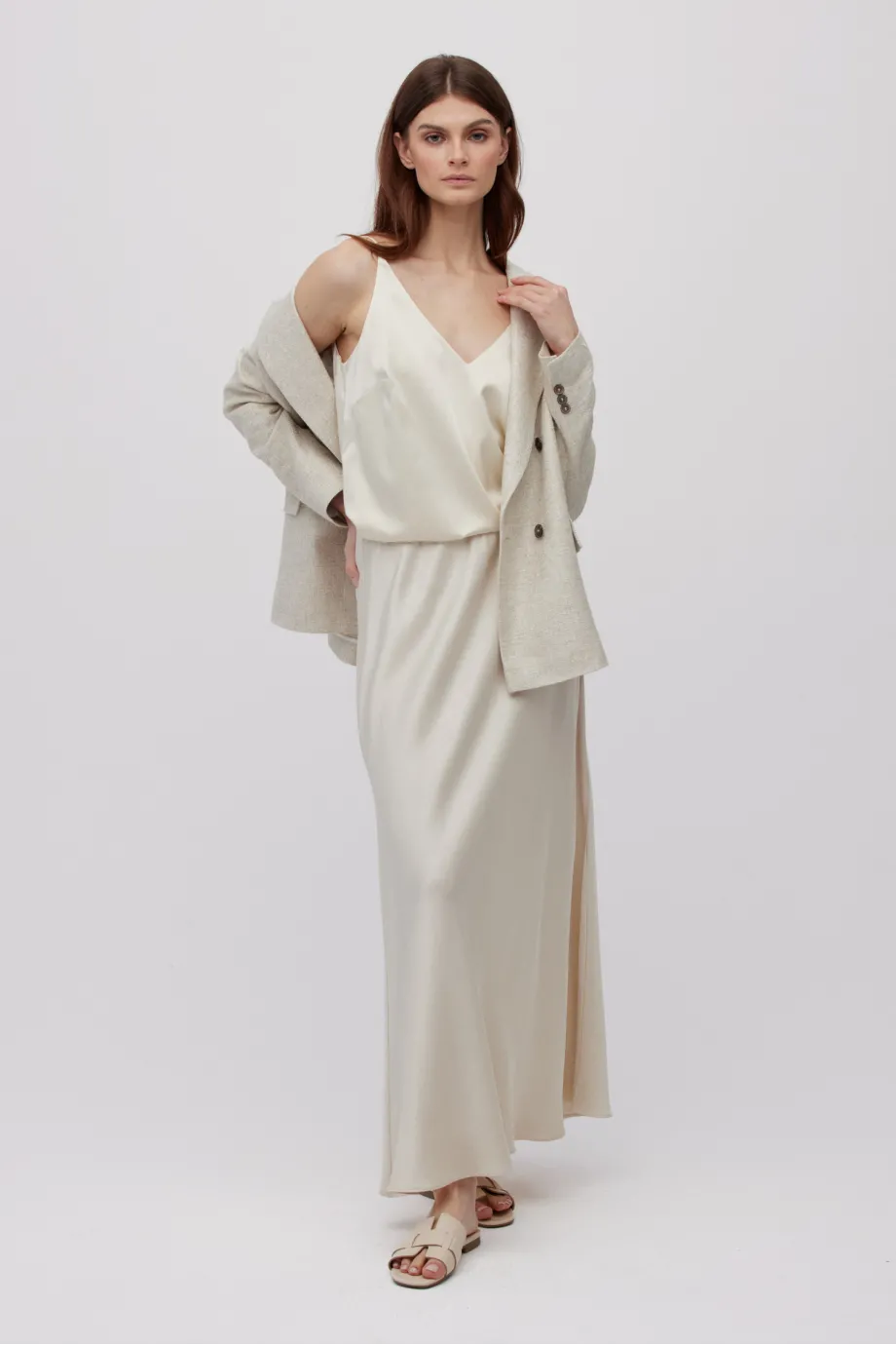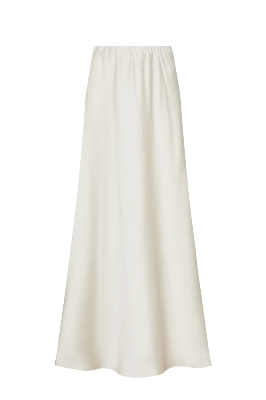 - Długa spódnica w odcieniu ciepłego beżu, o luźnym fasonie i elastycznej talii