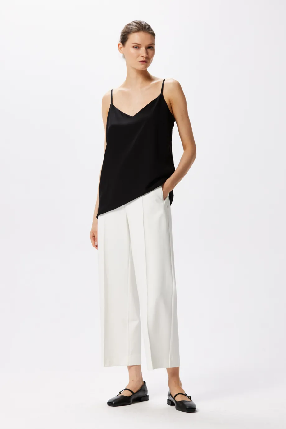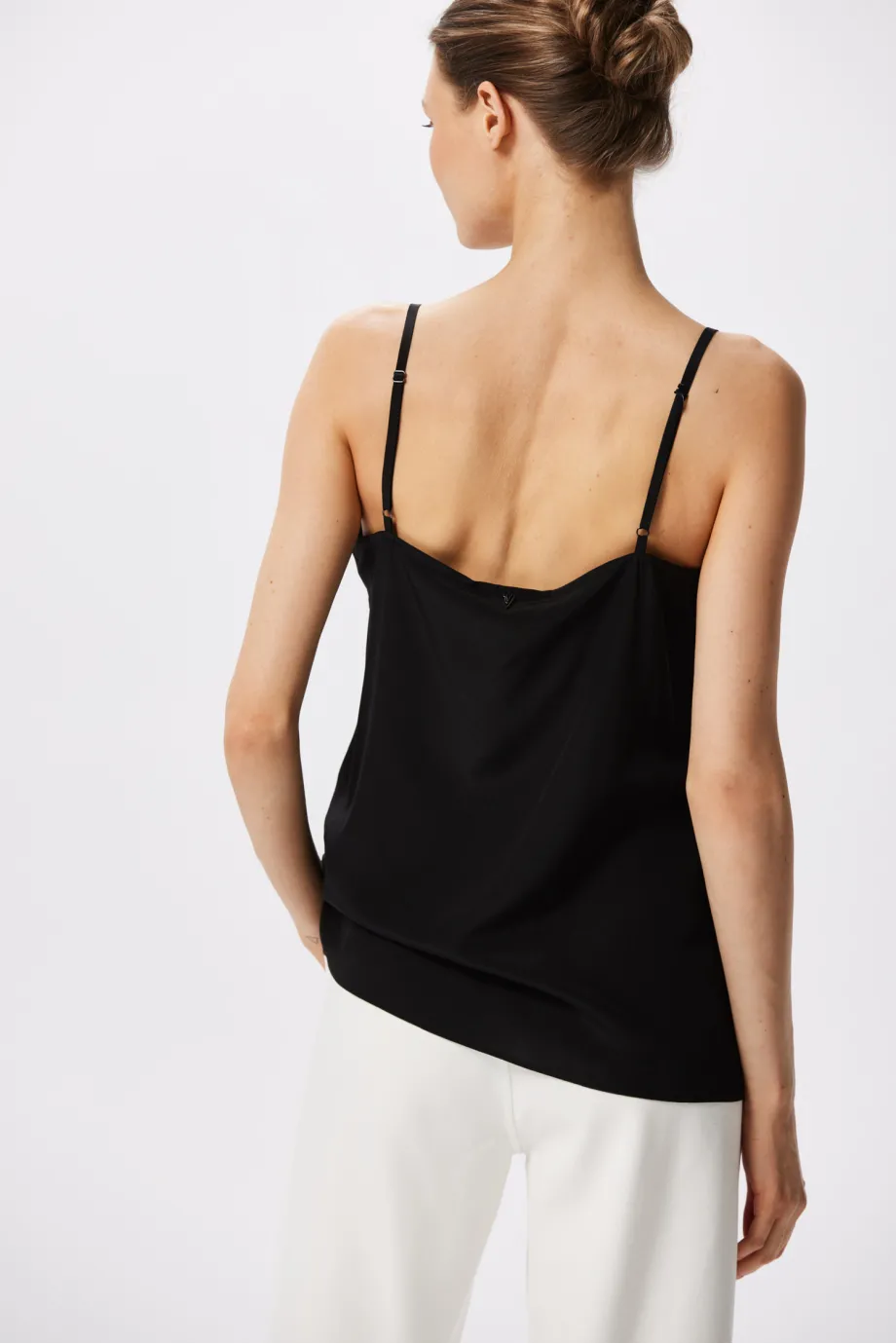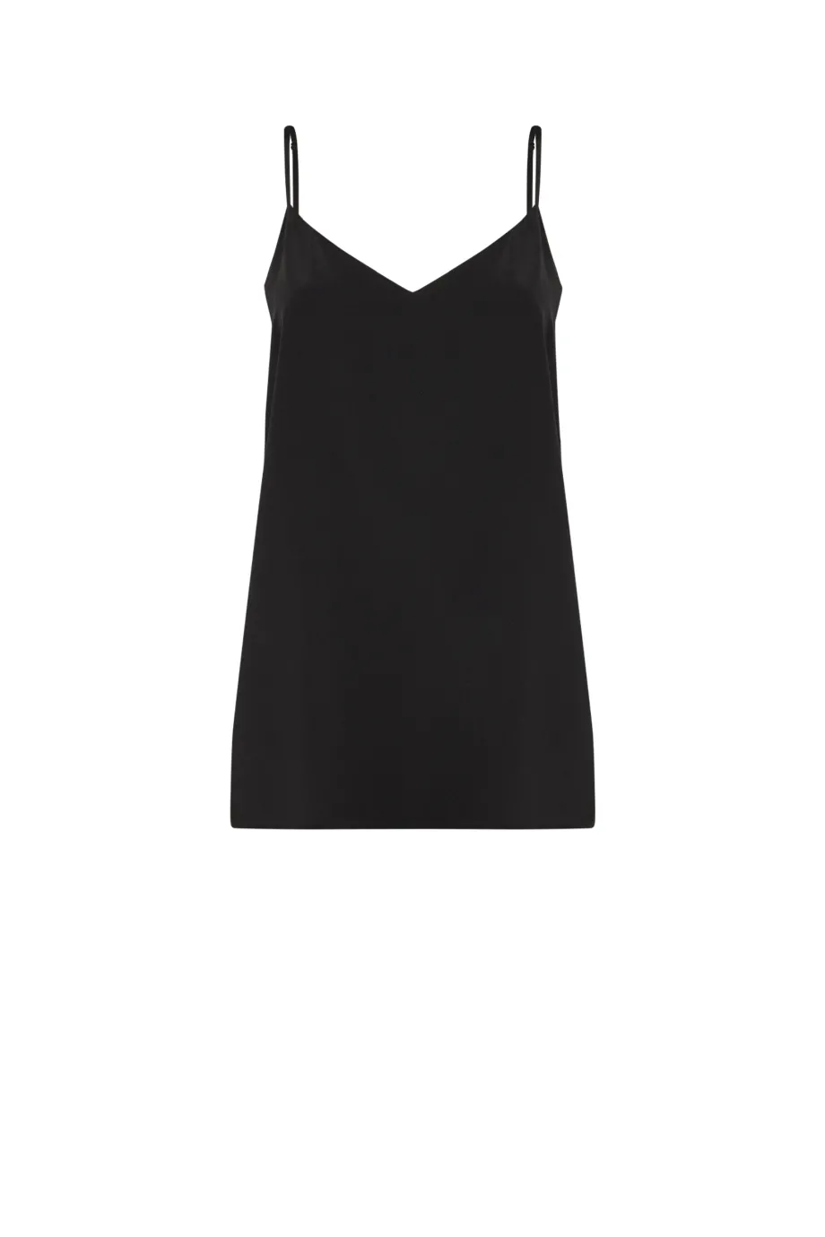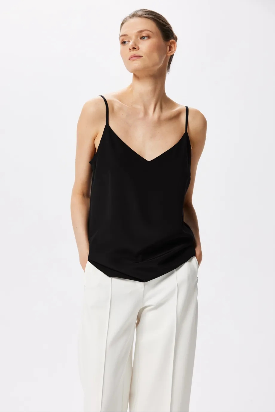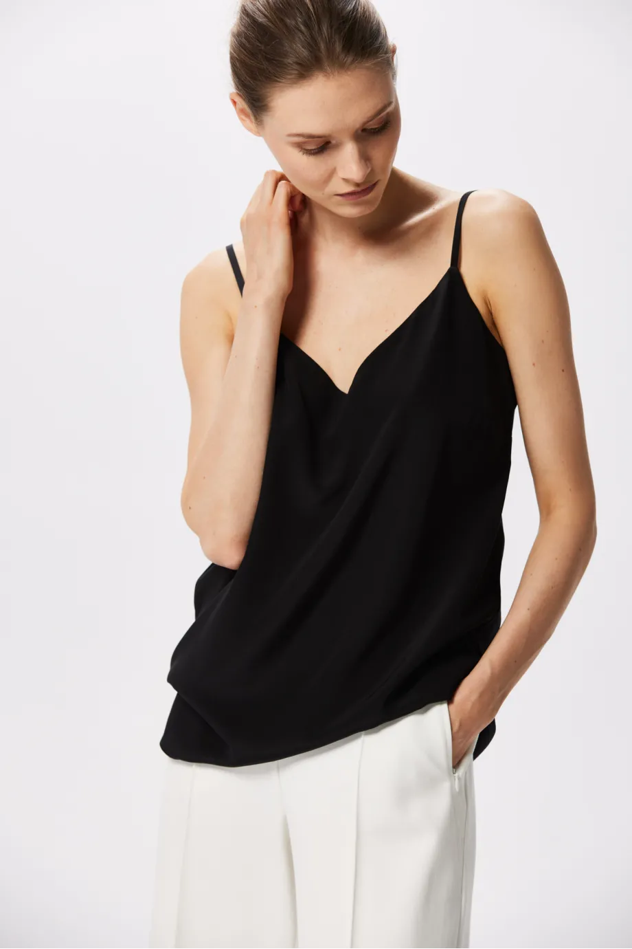 Jedwabna bluzka na ramiączkach to nasz sztandarowy produkt, który co sezon pojawia się w innym kolorze. Tym razem kultowy top z dekoltem V zyskuje odcień głębokiej czerni. Nie ma kompozycji, do której by nie pasował, niezależnie od preferowanego stylu ubierania. Czarny jedwabny top na ramiączkach to obowiązkowy basic w szafie każdej miłośniczki trendu quiet luxury.