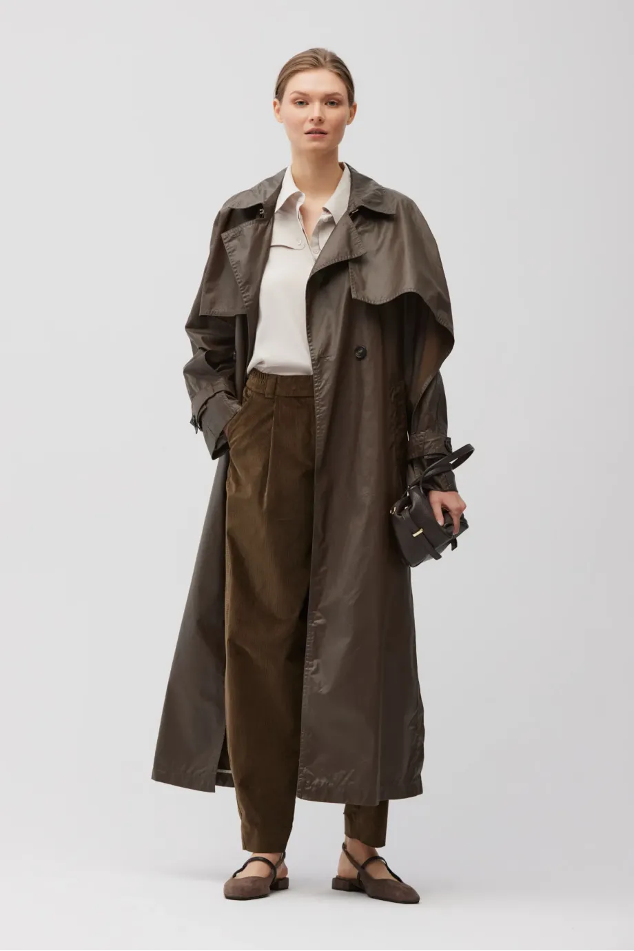 Elastyczna guma umiejscowiona z tyłu w pasie pomaga lepiej dopasować ubranie do talii, a pionowe zakładki na wysokości bioder budują czysty, lekko zarysowany kontur, zapewniając przy tym przyjemny luz. Spodnie mają boczne kieszenie, kryte zapięcie i szlufki, dzięki czemu możesz nosić je także z paskiem.