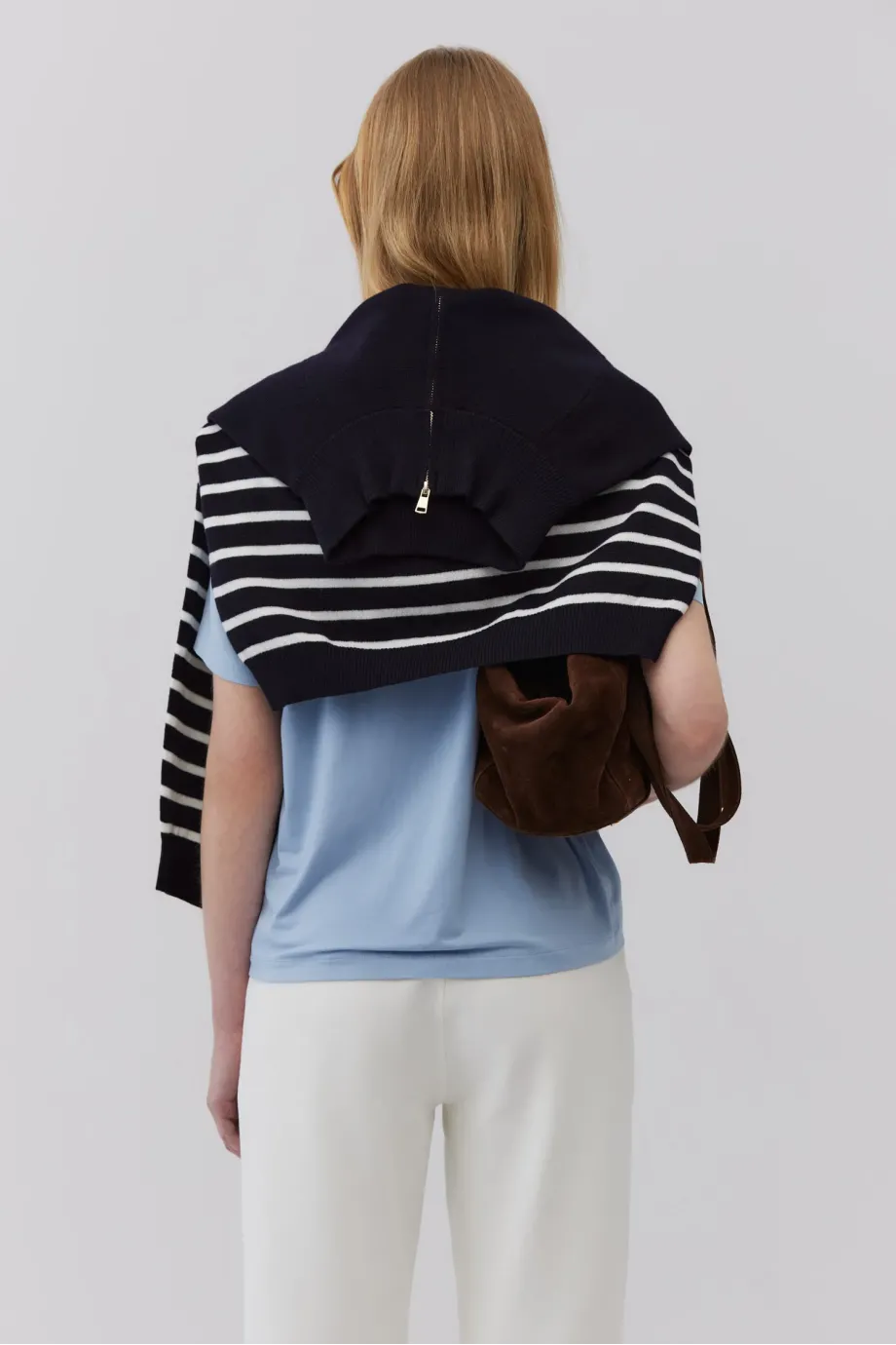 Projekt, na podstawie którego powstała ta konkretna bluzka z dzianiny, bazuje na dialogu dwóch tkanin: jedwabny przód ma szlachetny połysk i delikatnie unosi sylwetkę, podczas gdy dzianinowy tył dopasowuje się do ruchu i rytmu dnia, odpowiadając na potrzebę łagodnego dotyku na skórze. Prosty, pudełkowy fason pozwala Brigitte swobodnie układać się na ciele. Okrągły dekolt wprowadza delikatność do formy, a krótkie rękawy typu wstawianego tworzą ramę, która utrzymuje całą szykowną strukturę w ryzach.