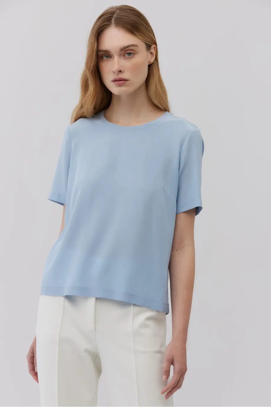 Bluzka z jedwabnym przodem i dzianinowym tyłem. Prosty, lekko pudełkowy krój. Okrągły dekolt. Krótkie rękawy.