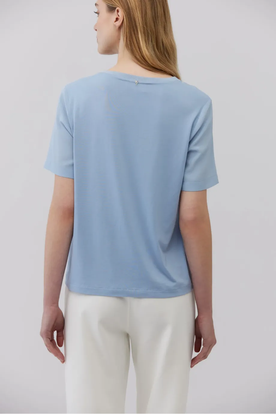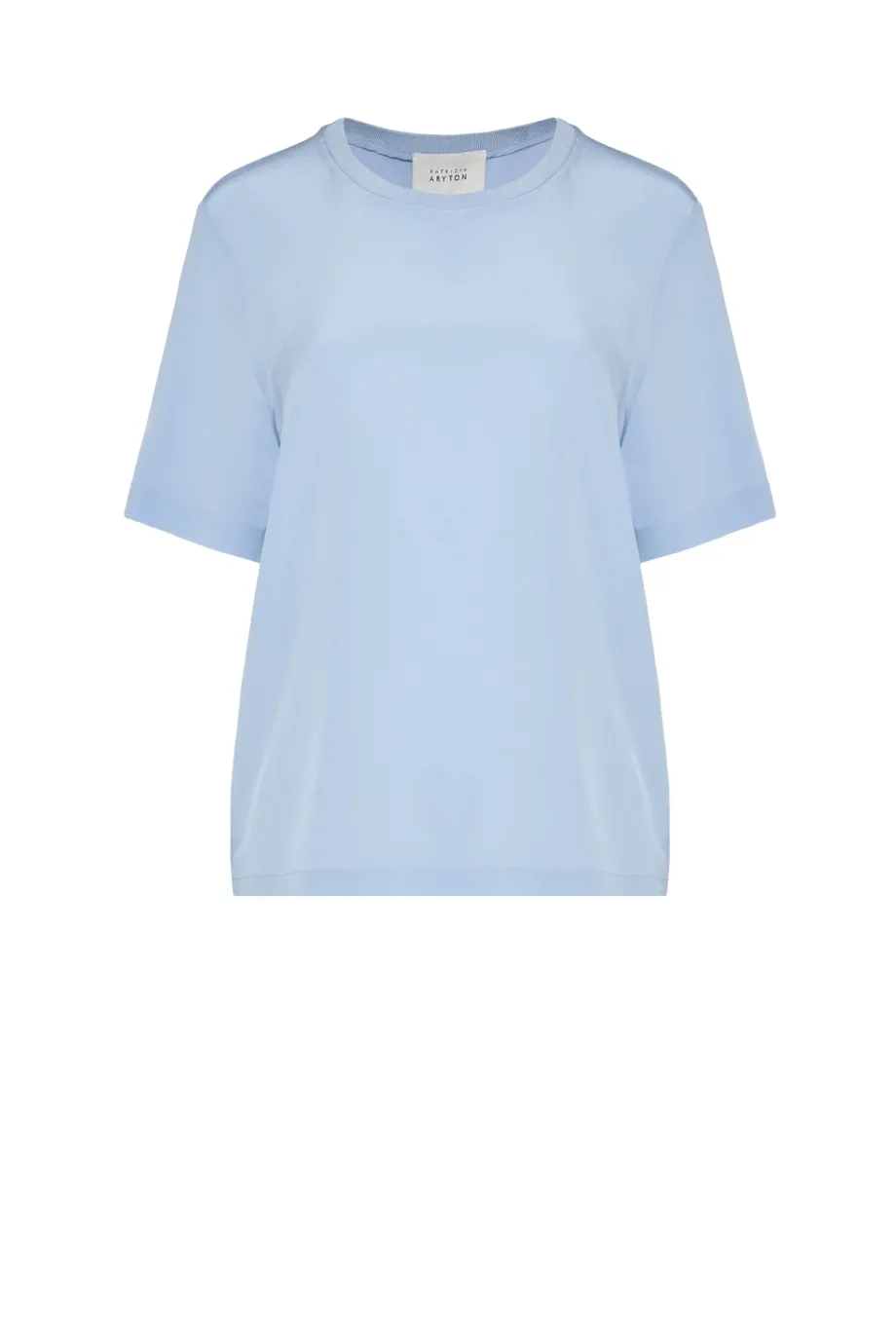 Błękitna bluzka z krótkim rękawem Patrizia Aryton dostępna jest w rozmiarach od 34 do 46. Została wykonana z dwóch uzupełniających się materiałów. Z przodu mamy 100% jedwabiu, który subtelnie odbija światło, jest hipoalergiczny, chłodny w dotyku i oddychający. Tył bluzki to dzianina z przewagą przewiewnej i szykownej wiskozy, wzbogaconej o dodatek poprawiającego sprężystość elastanu, dzięki któremu bluzka zyskuje na funkcjonalności.