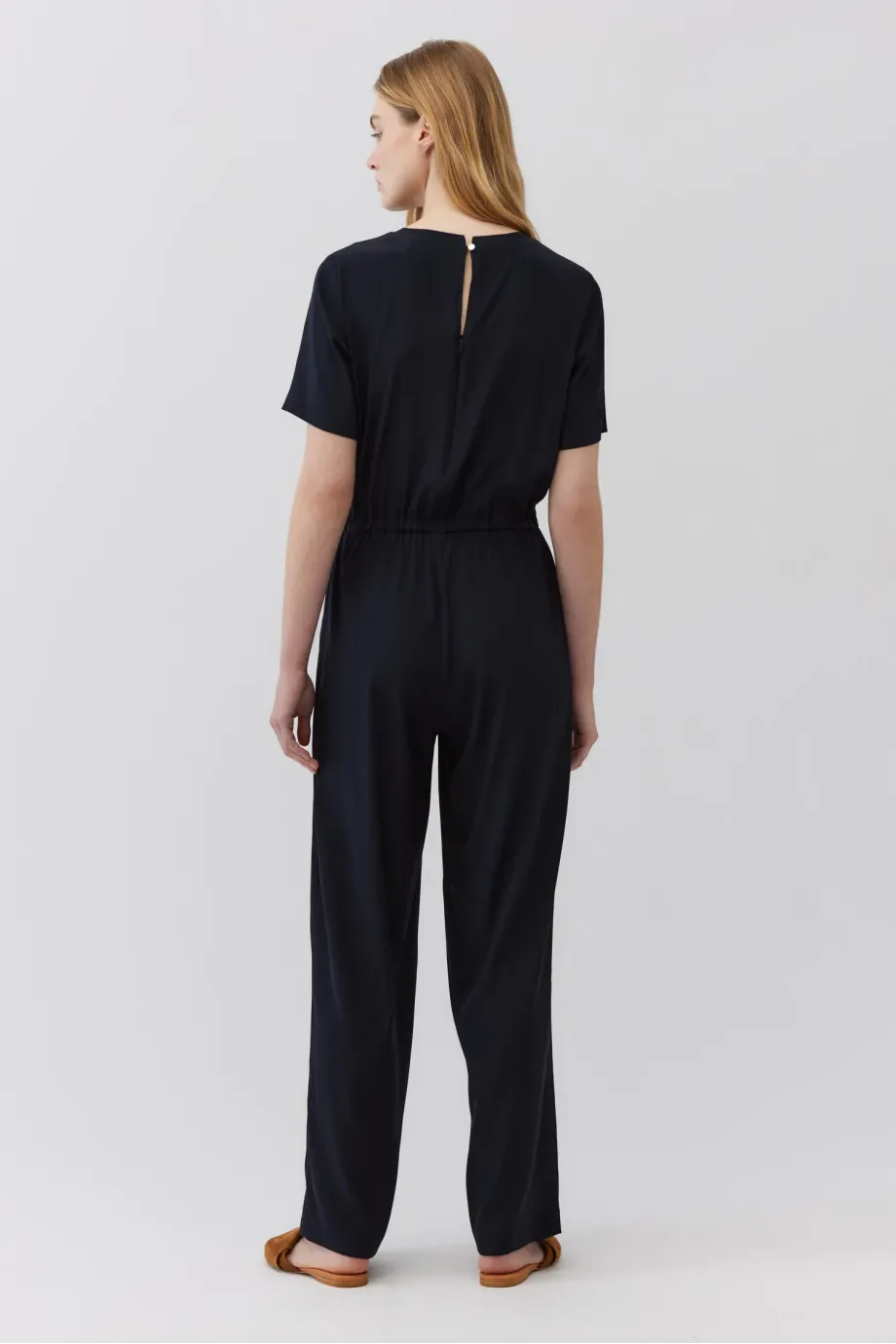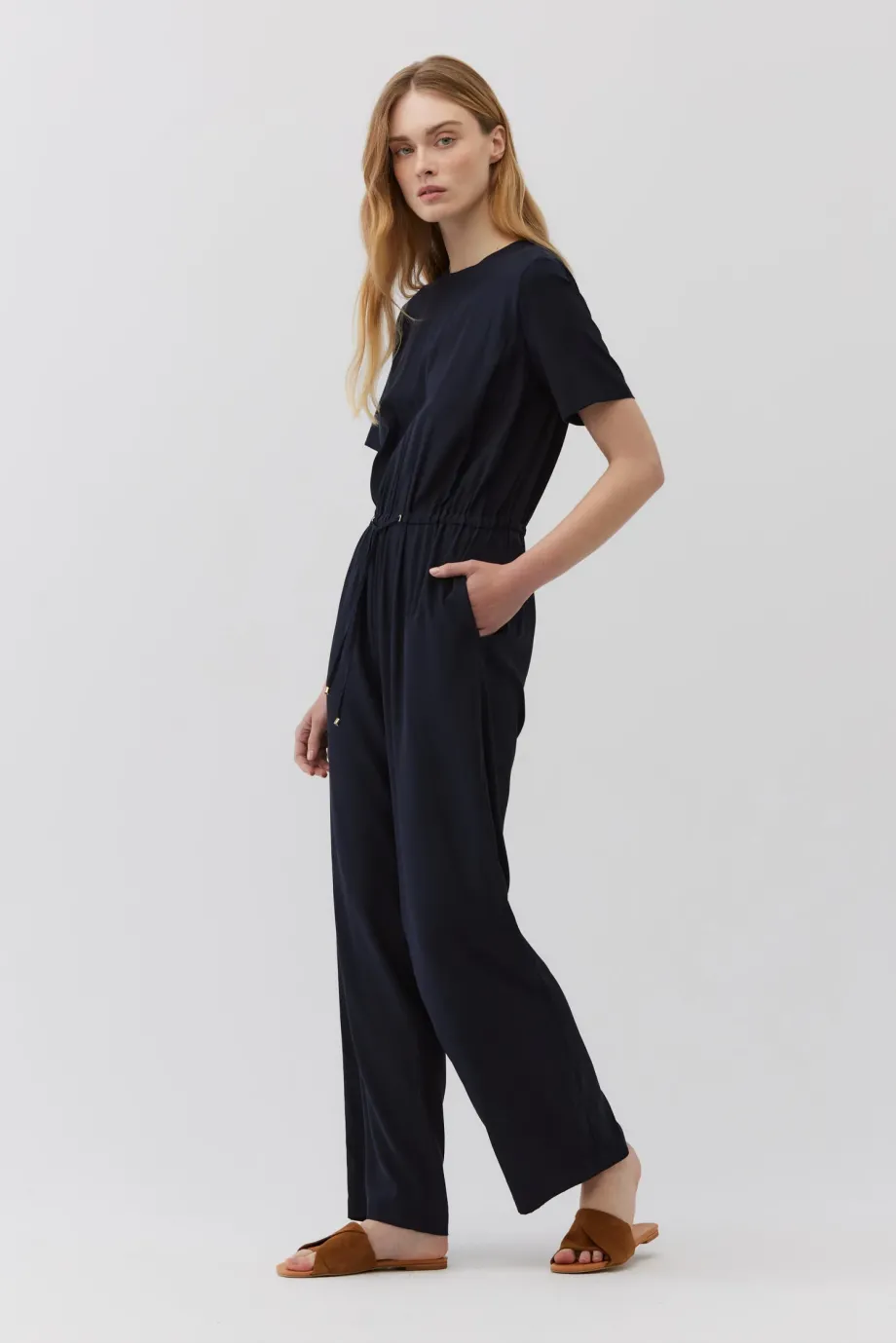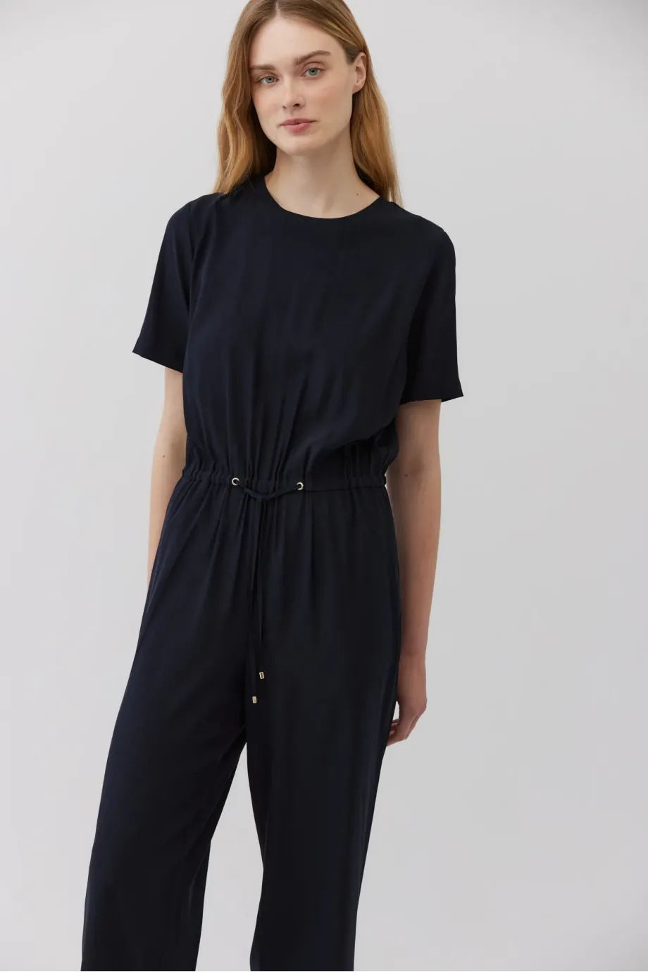 Granatowy kombinezon z krótkim rękawem. Prosty krój z długimi, luźnymi nogawkami. Elastyczna talia regulowana troczkiem. Okrągły dekolt. Zapięcie z tyłu na zamek i guzik. Ukryte kieszenie w szwach bocznych. Wykonany z jedwabiu.