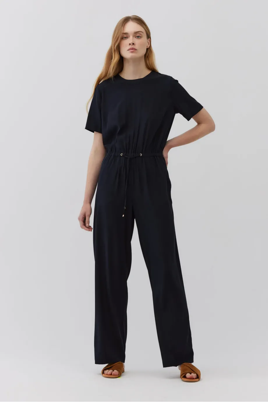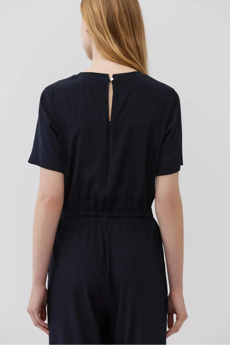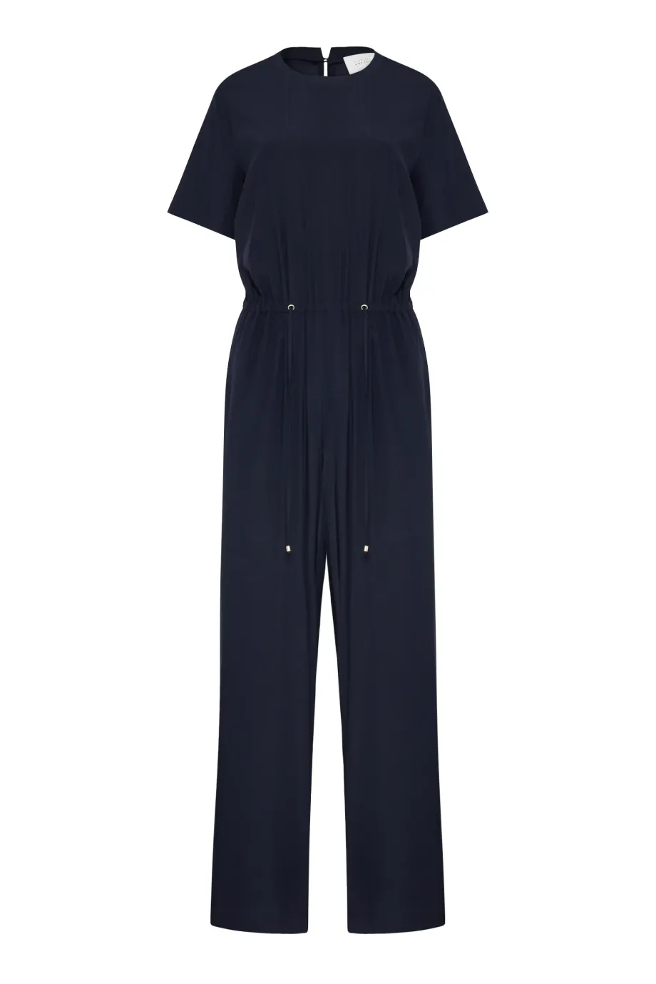 Granatowy kombinezon z krótkim rękawem. Prosty krój z długimi, luźnymi nogawkami. Elastyczna talia regulowana troczkiem. Okrągły dekolt. Zapięcie z tyłu na zamek i guzik. Ukryte kieszenie w szwach bocznych. Wykonany z jedwabiu.