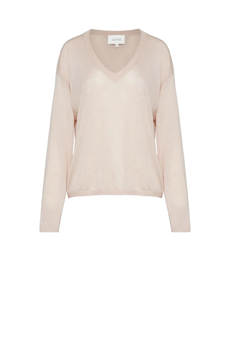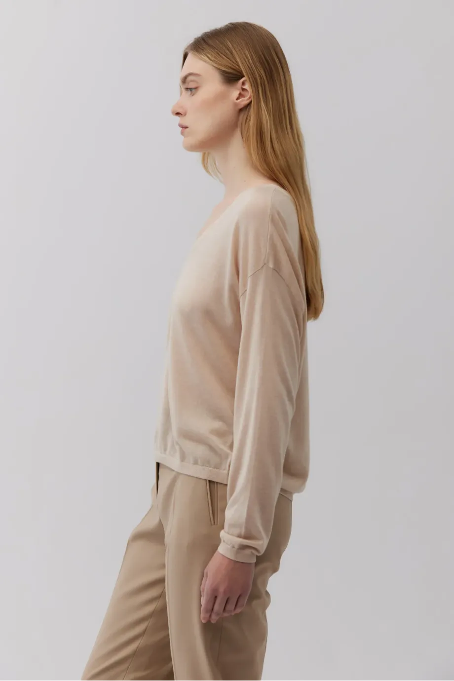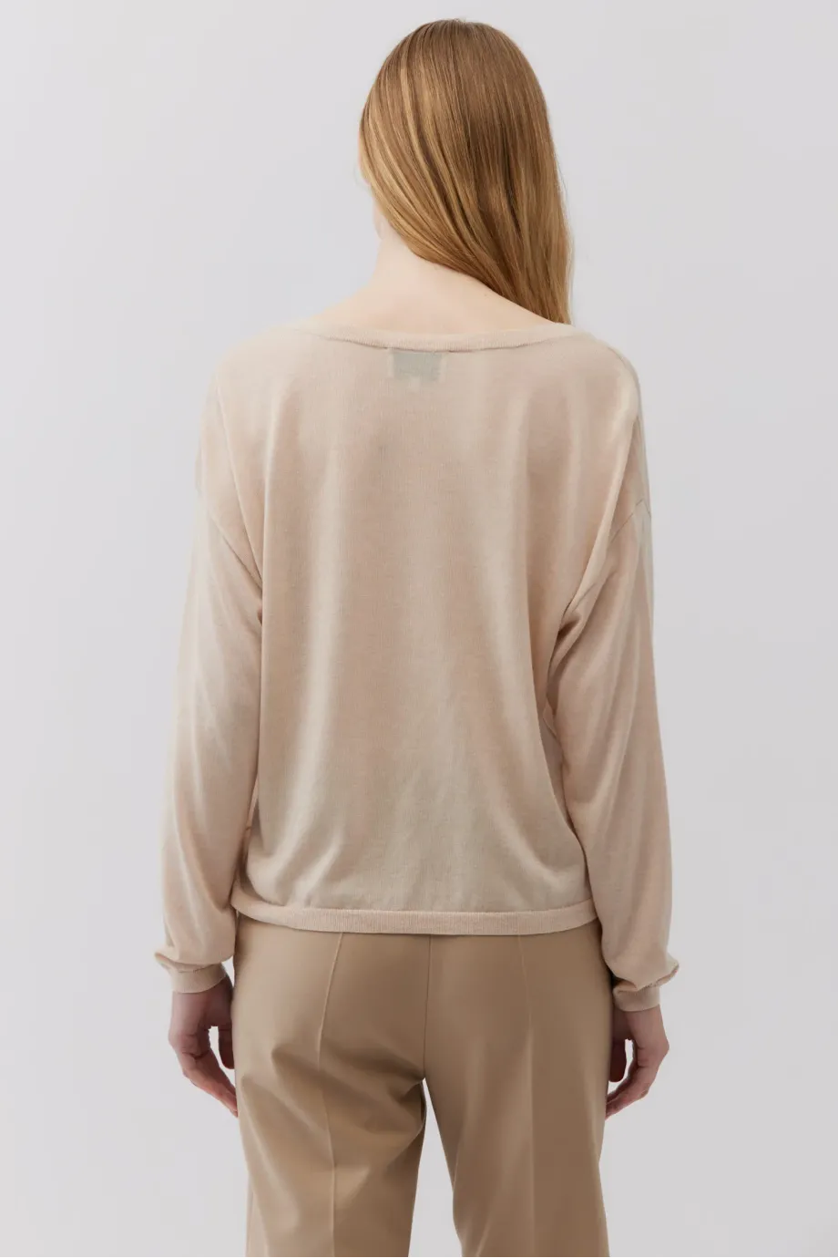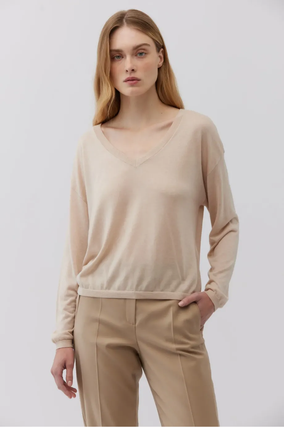 Lekka bluzka z domieszką kaszmiru. Drobny ścieg (16 GG), cienka dzianina o splocie single jersey. Dekolt w kształcie litery V, długie rękawy, luźny krój. Kolor beżowy.