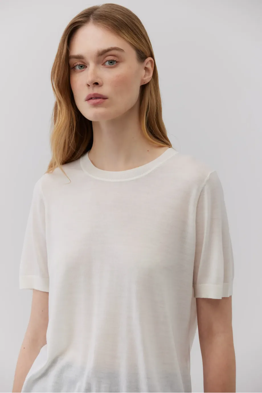 Biały T-shirt z wełny merynosowej. Okrągły dekolt. Krótkie rękawy. Miękka w dotyku, subtelnie transparentna dzianina. Drobny i gęsty splot jersey knit. Prosty, klasyczny krój. Dostępny w 2 kolorach.