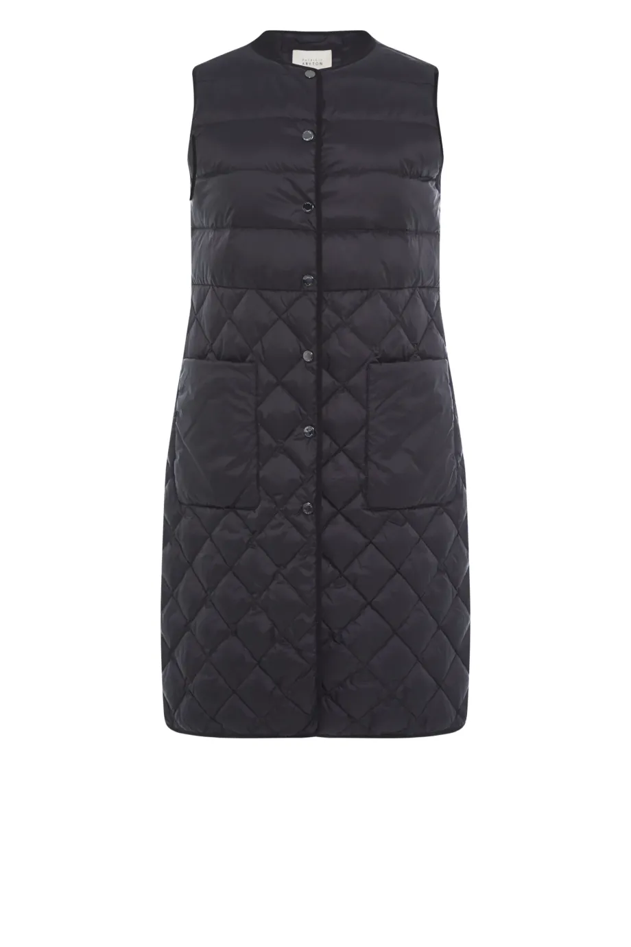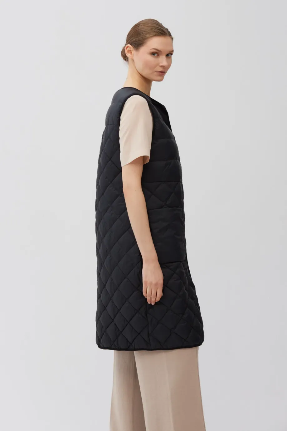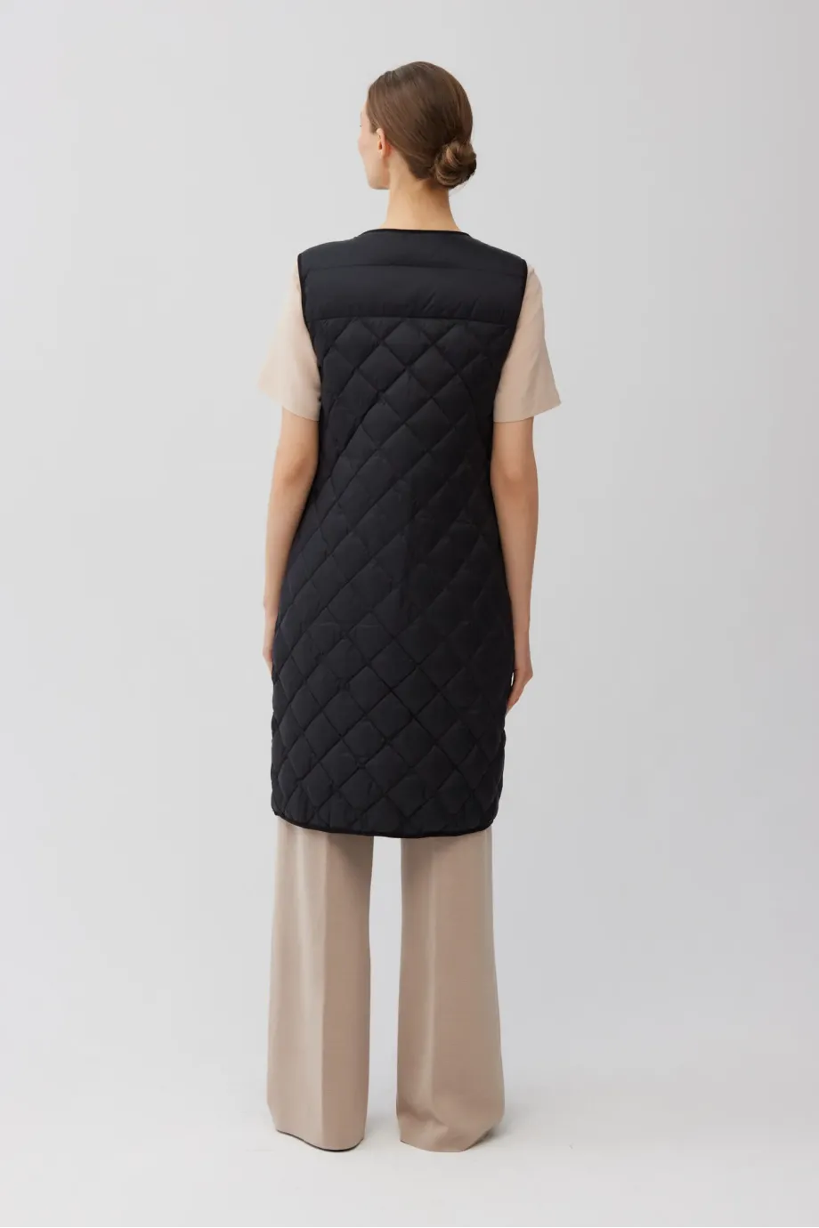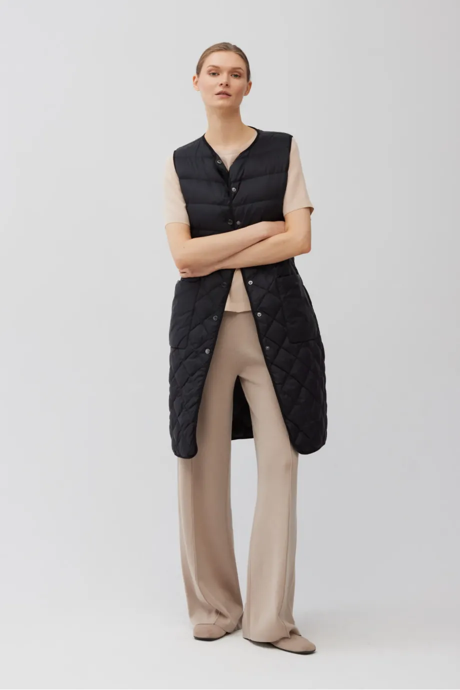 Lekka kamizelka z naturalnym, puchowym wypełnieniem. Zapinana na napy. Naszywane kieszenie z przodu. Prosty fason – do samodzielnego noszenia lub jako warstwa docieplająca pod płaszcz. Kolor czarny.