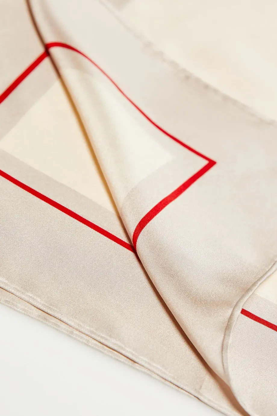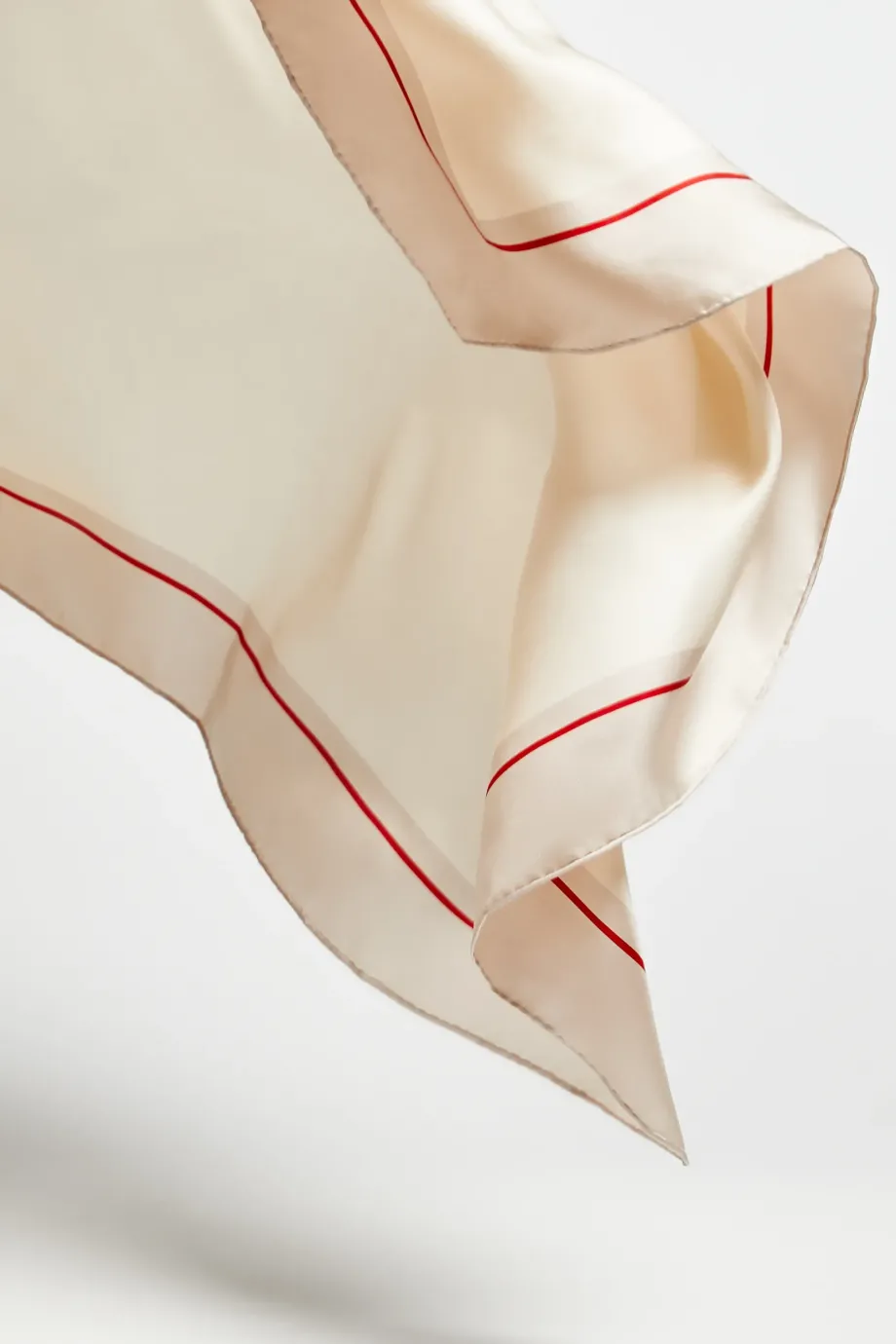 Jedwabna chusta w minimalistycznej palecie - odcienie beżu z kontrastowym akcentem czerwieni.