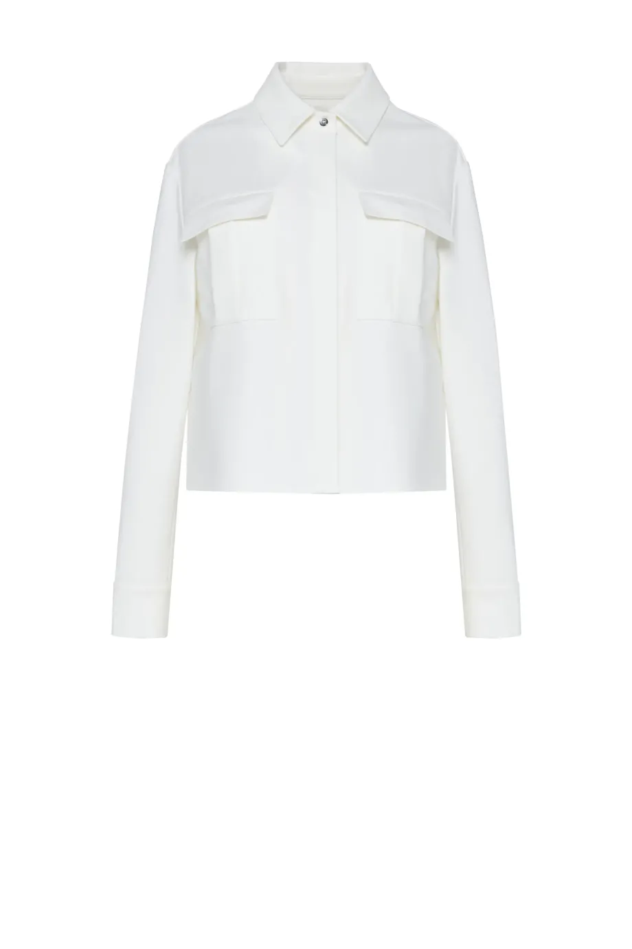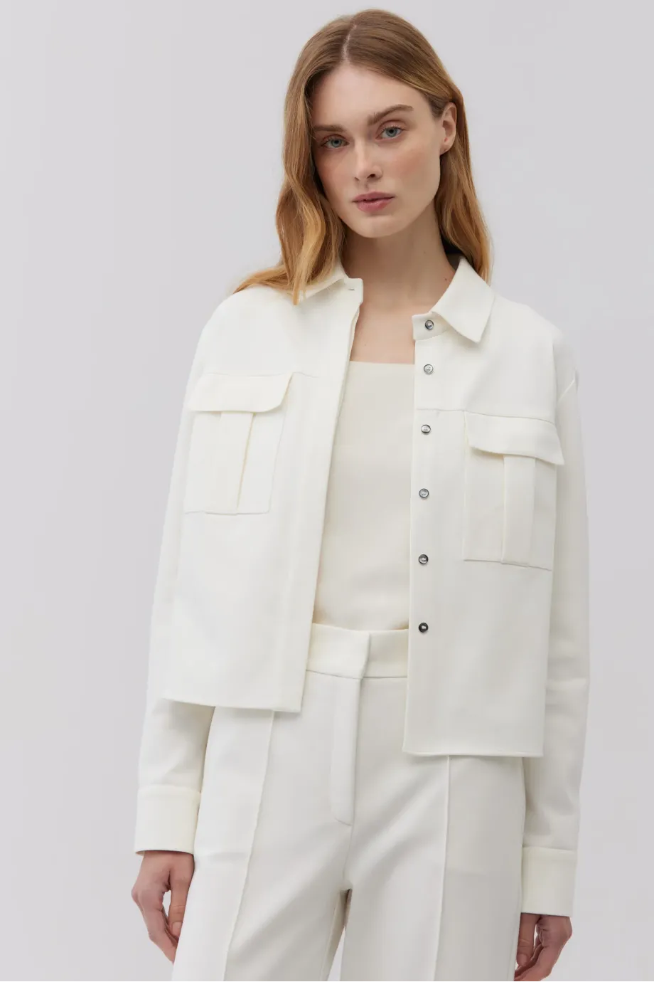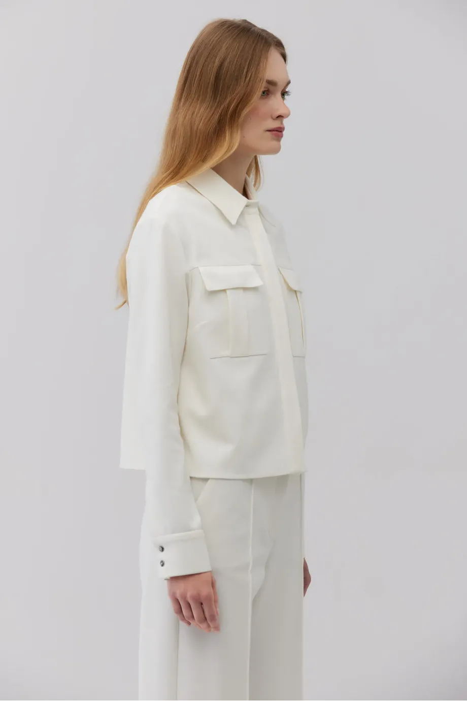 Biały koszulowy żakiet. Prosty, lekko pudełkowy krój. Kieszenie z klapkami. Zapięcie na napy. Do kompletu spodnie.