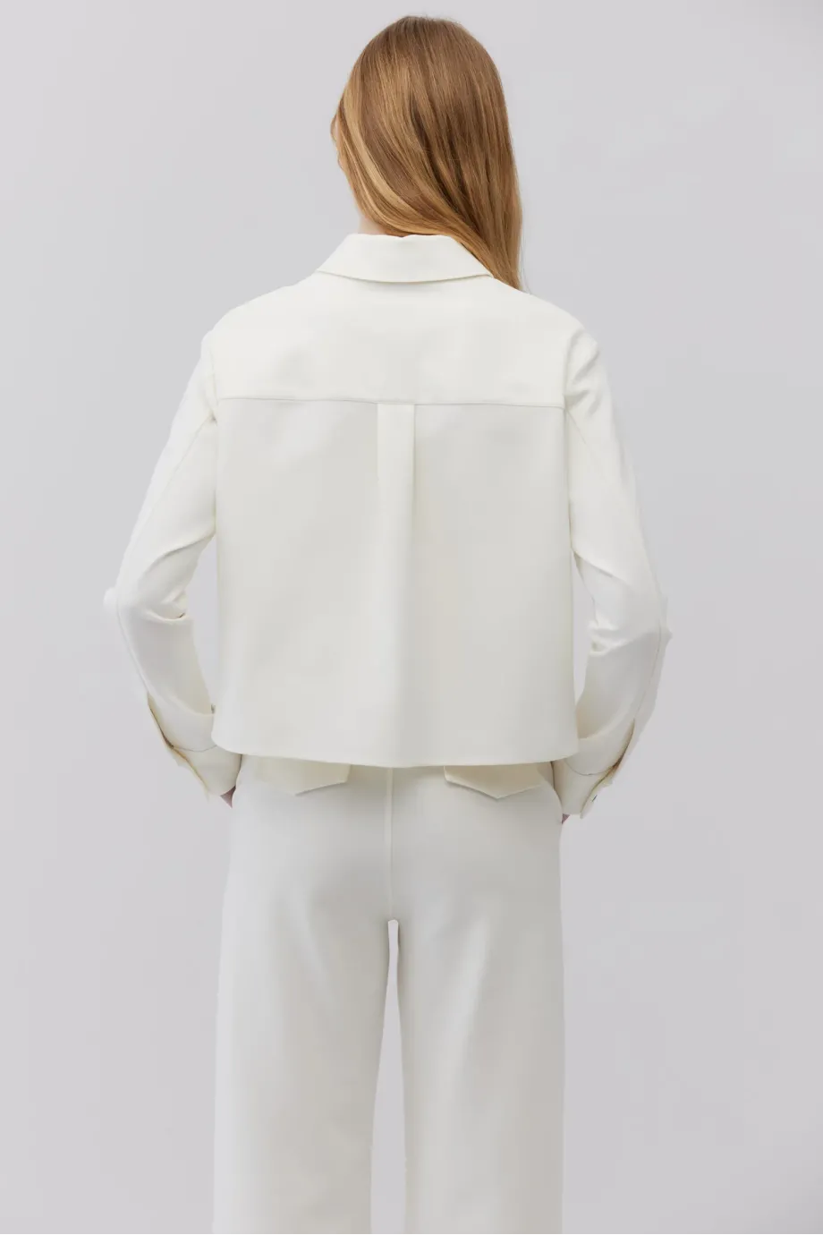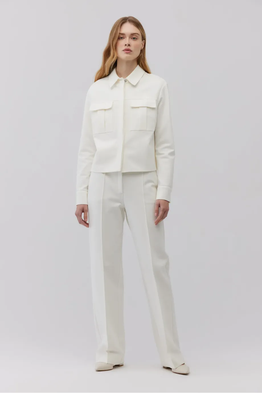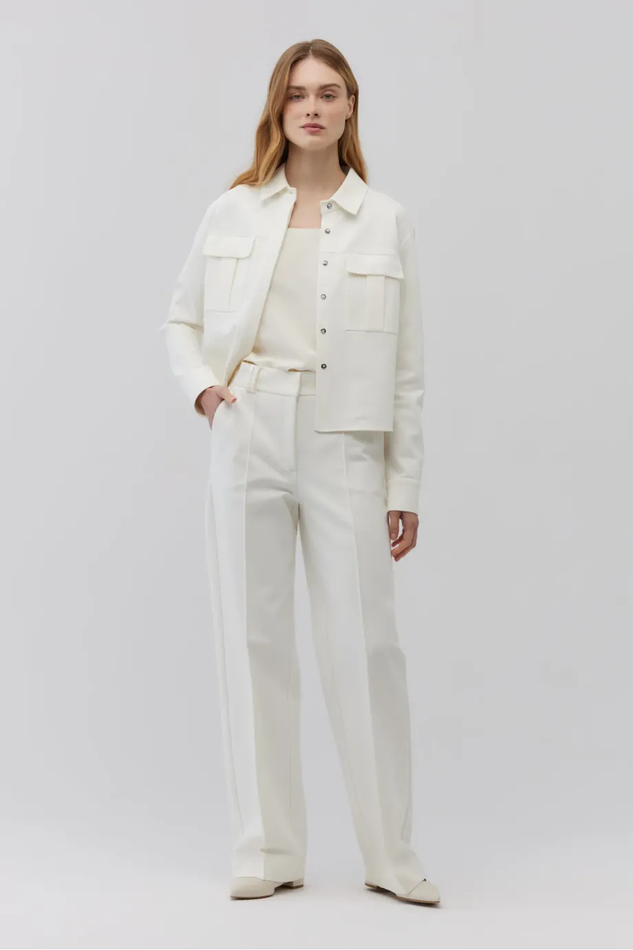 Biały koszulowy żakiet. Prosty, lekko pudełkowy krój. Kieszenie z klapkami. Zapięcie na napy. Do kompletu spodnie.