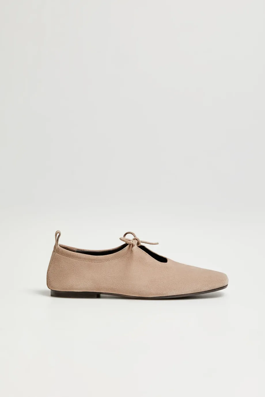 Miękka naturalna skóra zamszowa. Model wiązany, na płaskiej podeszwie. Kolor beżowy. Dostępne również w czerwieni. Ręcznie wykonane w hiszpańskiej manufakturze.