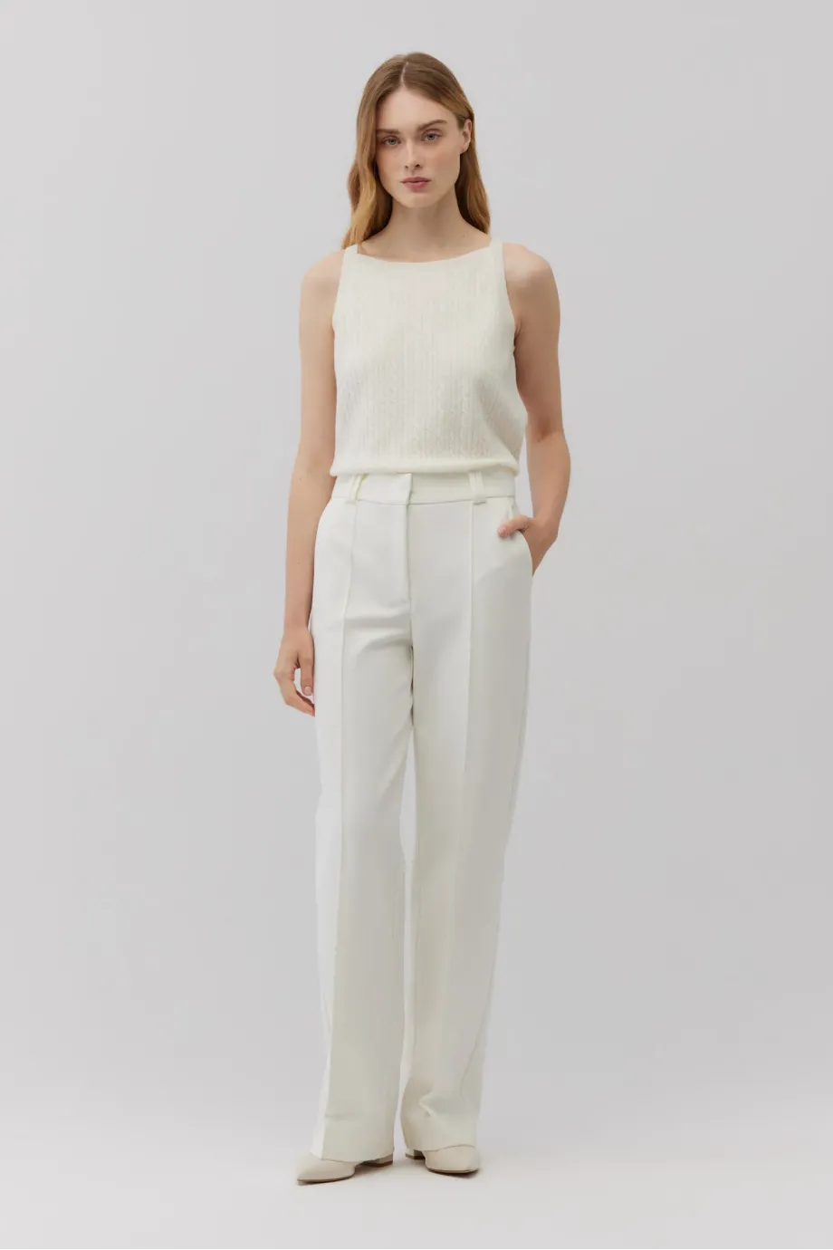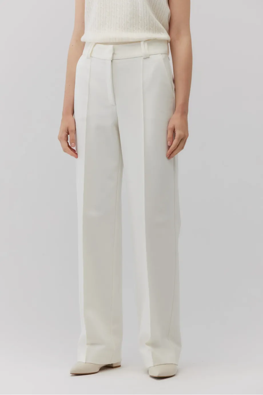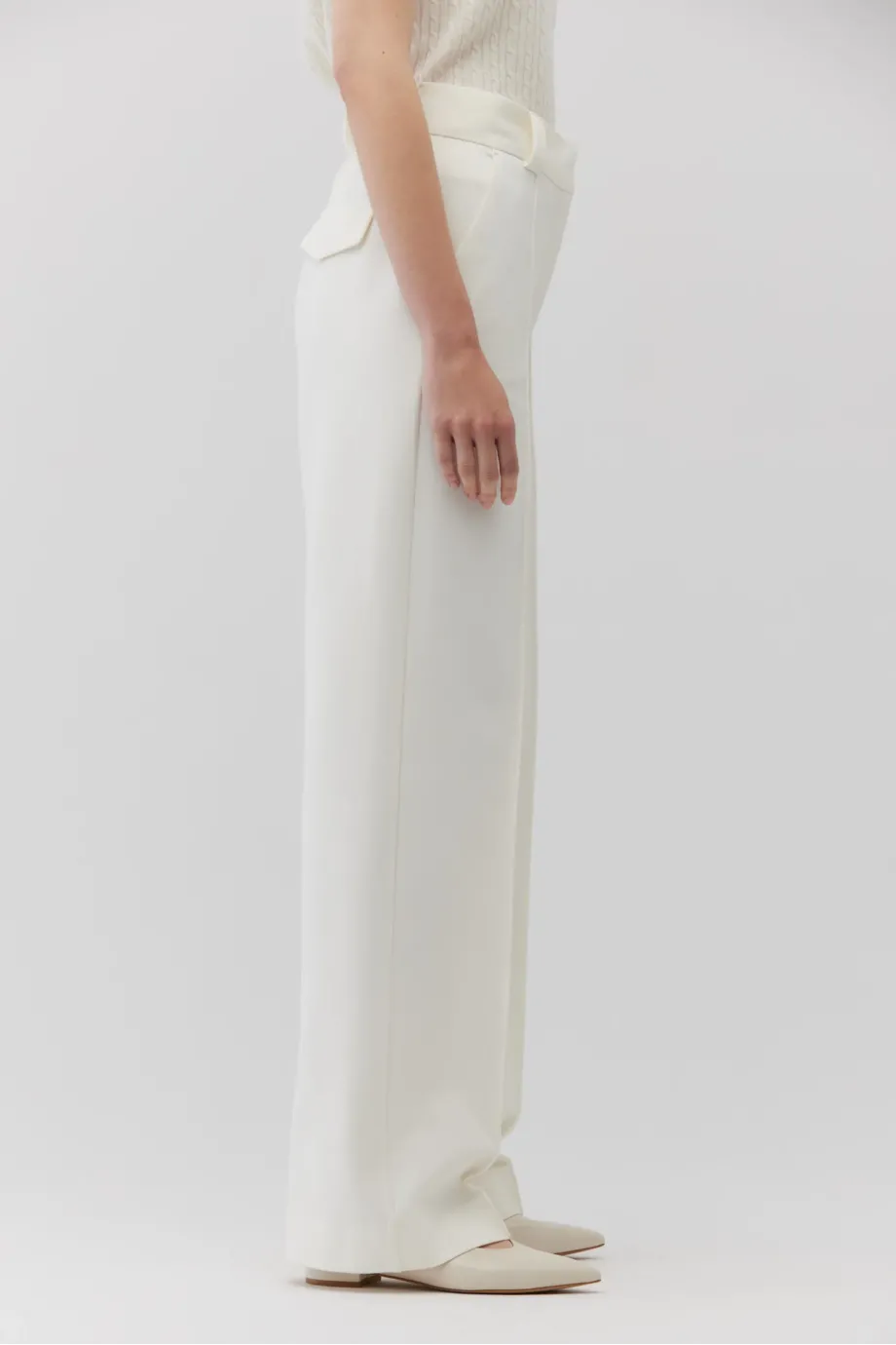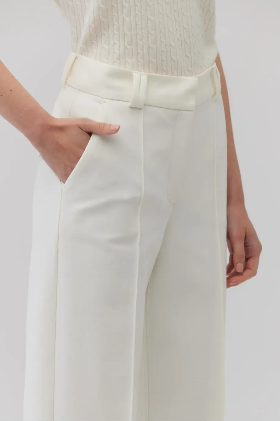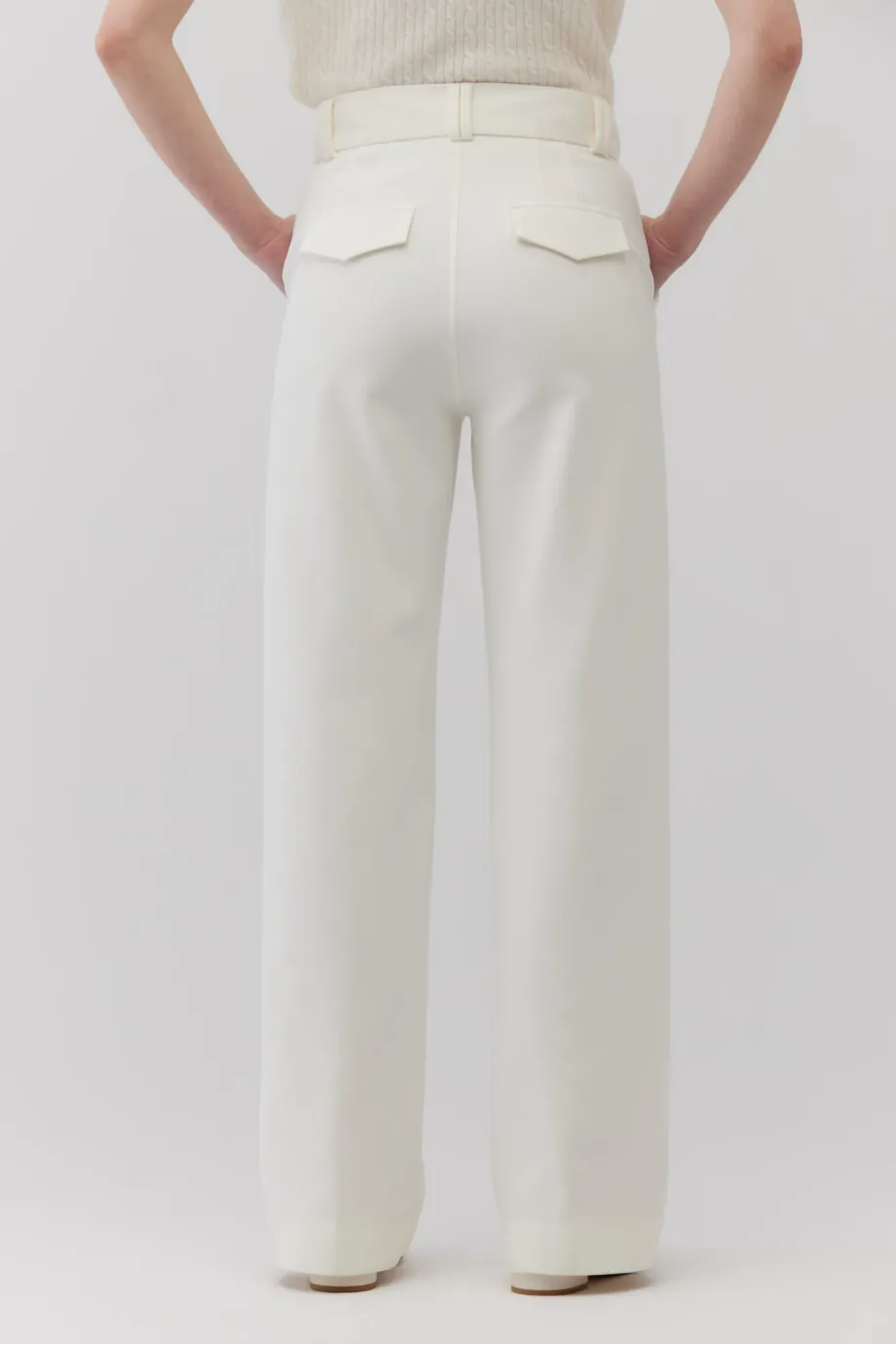 Białe szerokie spodnie z wysokim stanem z przodu wzbogacono o kanty, które nadają spodniom formalny sznyt, podczas gdy z tyłu nogawka jest gładka, dla większej miękkości w odbiorze. Model ma dwie kieszenie boczne i dodatkowe kieszenie z patkami zakończonymi szpicem, umiejscowione z tyłu. W talii wszyto efektowne, a zapięcie spodni jest bardzo dyskretne - na suwak, haczyk i wewnętrzny guzik z orzecha.