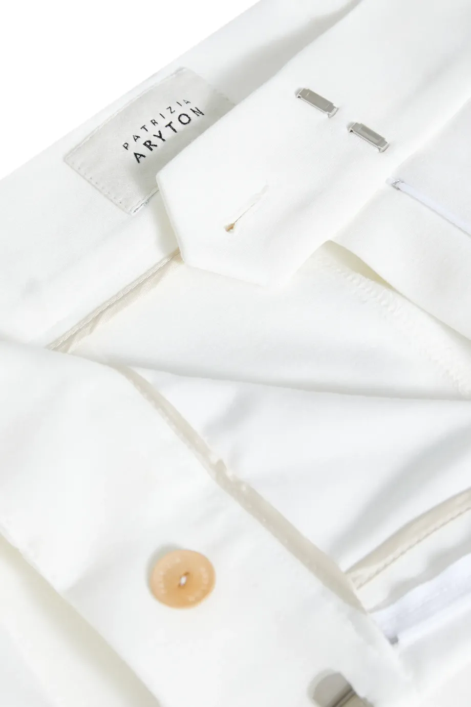 Spodnie z wysokim stanem i prostą, szeroką nogawką. Kanty z przodu. Kieszenie boczne oraz tylne kieszenie z patkami. Zapięcie na kryty suwak, haczyk i guzik z orzecha naturalnego. Szlufki w pasie. Starannie wykończone szwy od środka. Kolor biały. Do kompletu marynarka z tej samej tkaniny.
