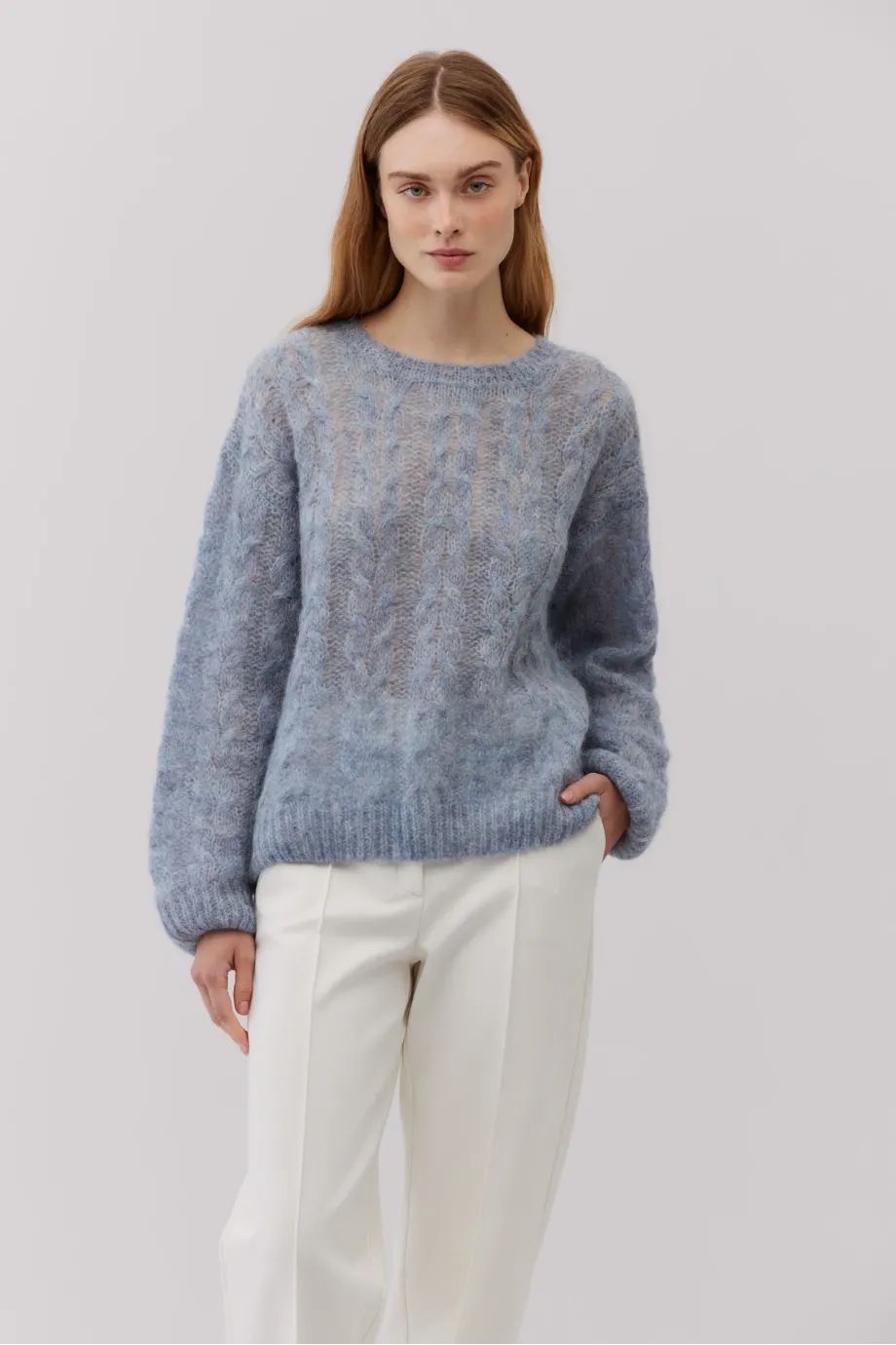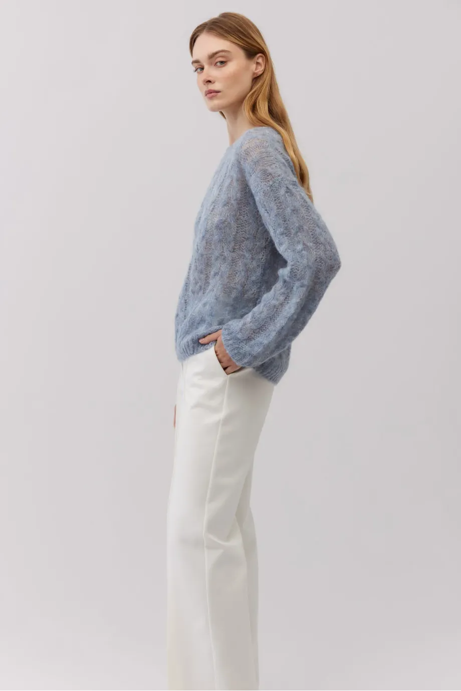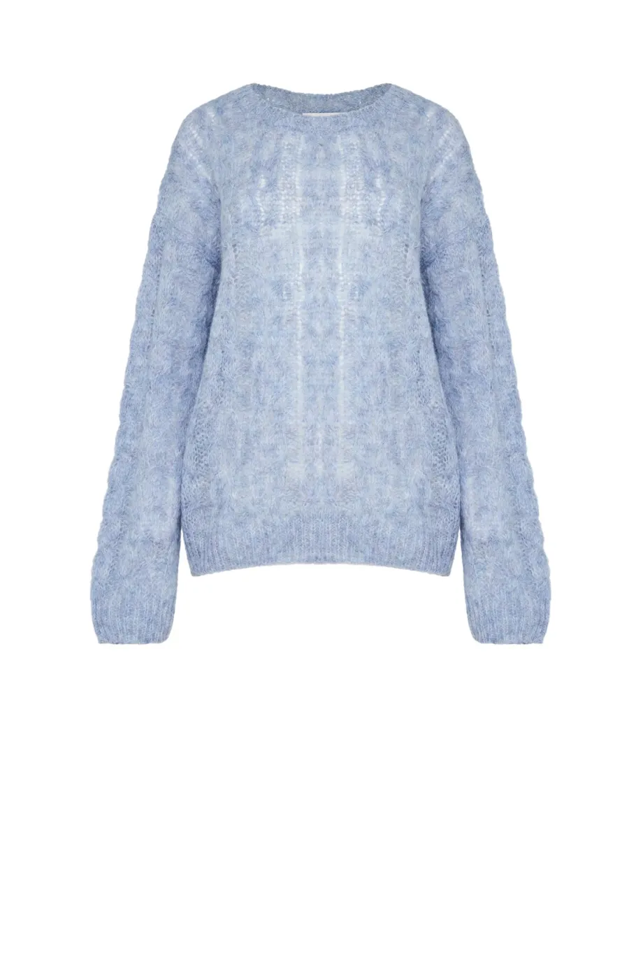 Miękki sweter o klasycznym kroju. Okrągły dekolt. Długie rękawy zakończone ściągaczem. Luźny splot braided stitch z długim włosem wykonany z mieszanki wełny alpaki. Kolor jasnoniebieski.