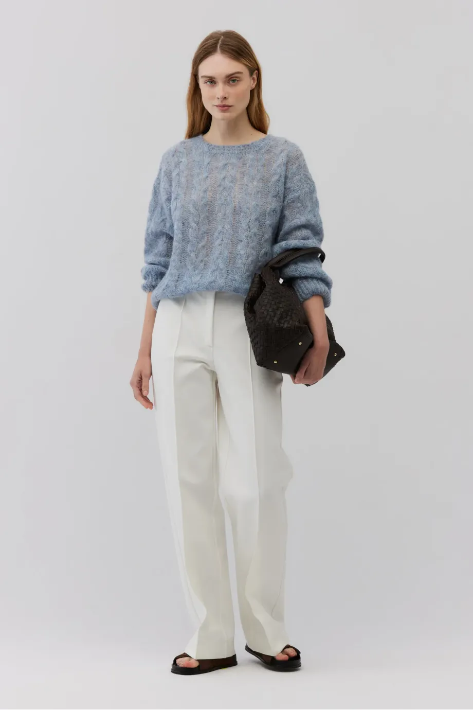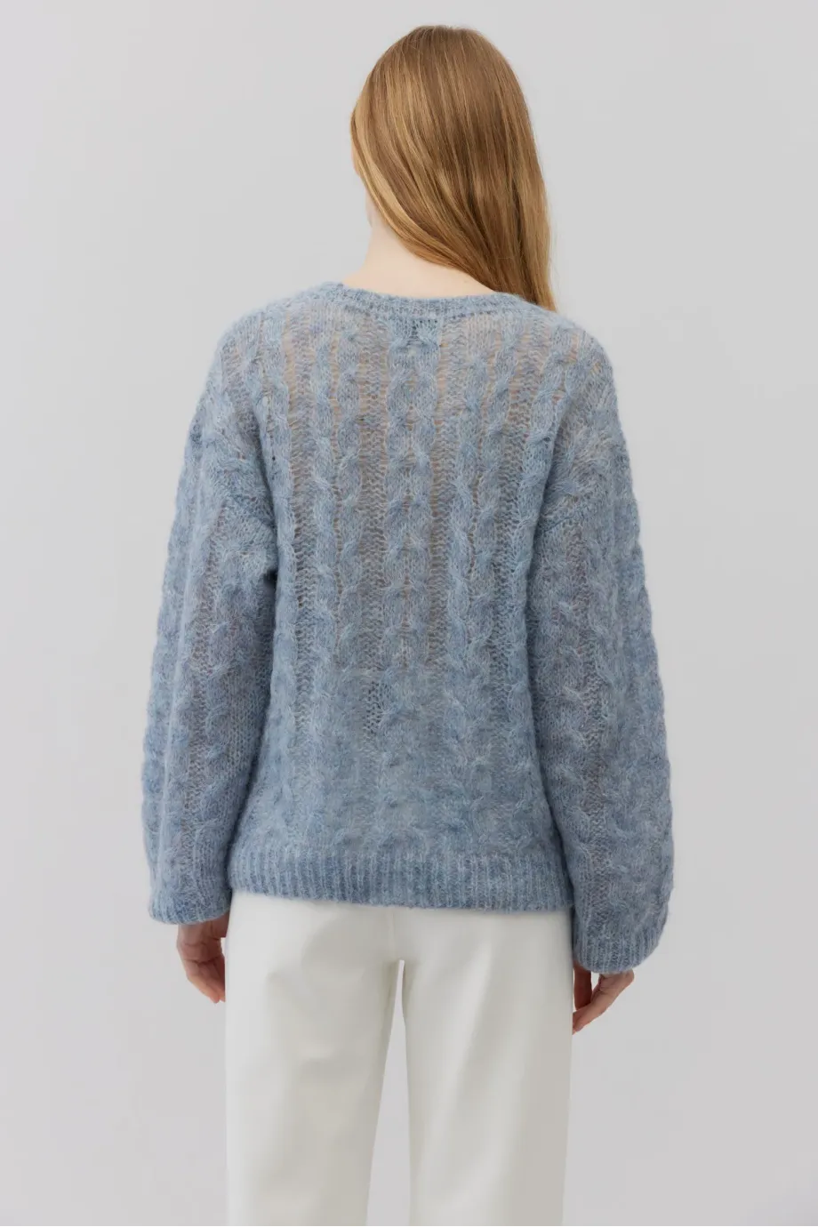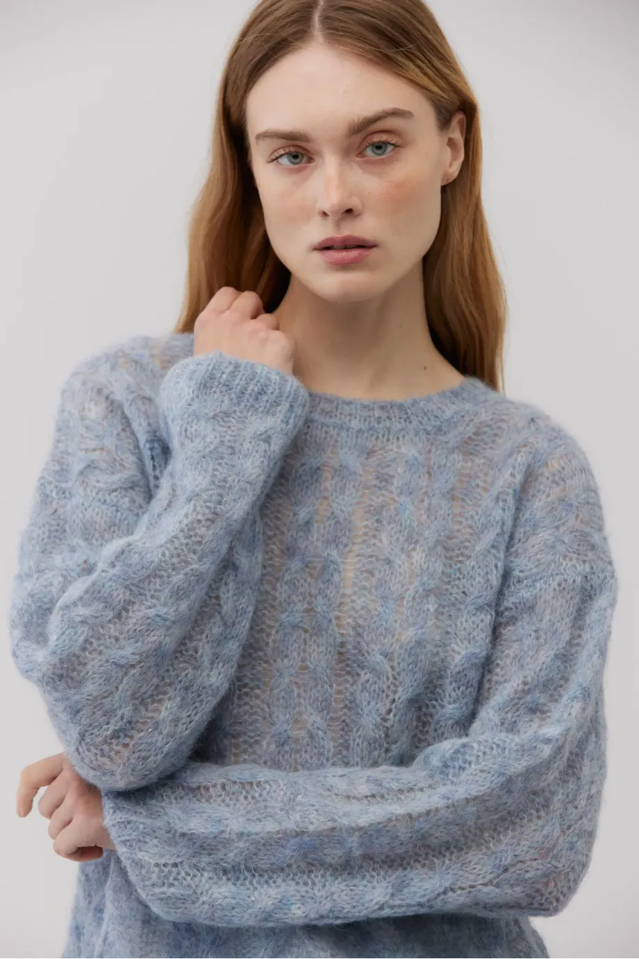 Miękki sweter o klasycznym kroju. Okrągły dekolt. Długie rękawy zakończone ściągaczem. Luźny splot braided stitch z długim włosem wykonany z mieszanki wełny alpaki. Kolor jasnoniebieski.