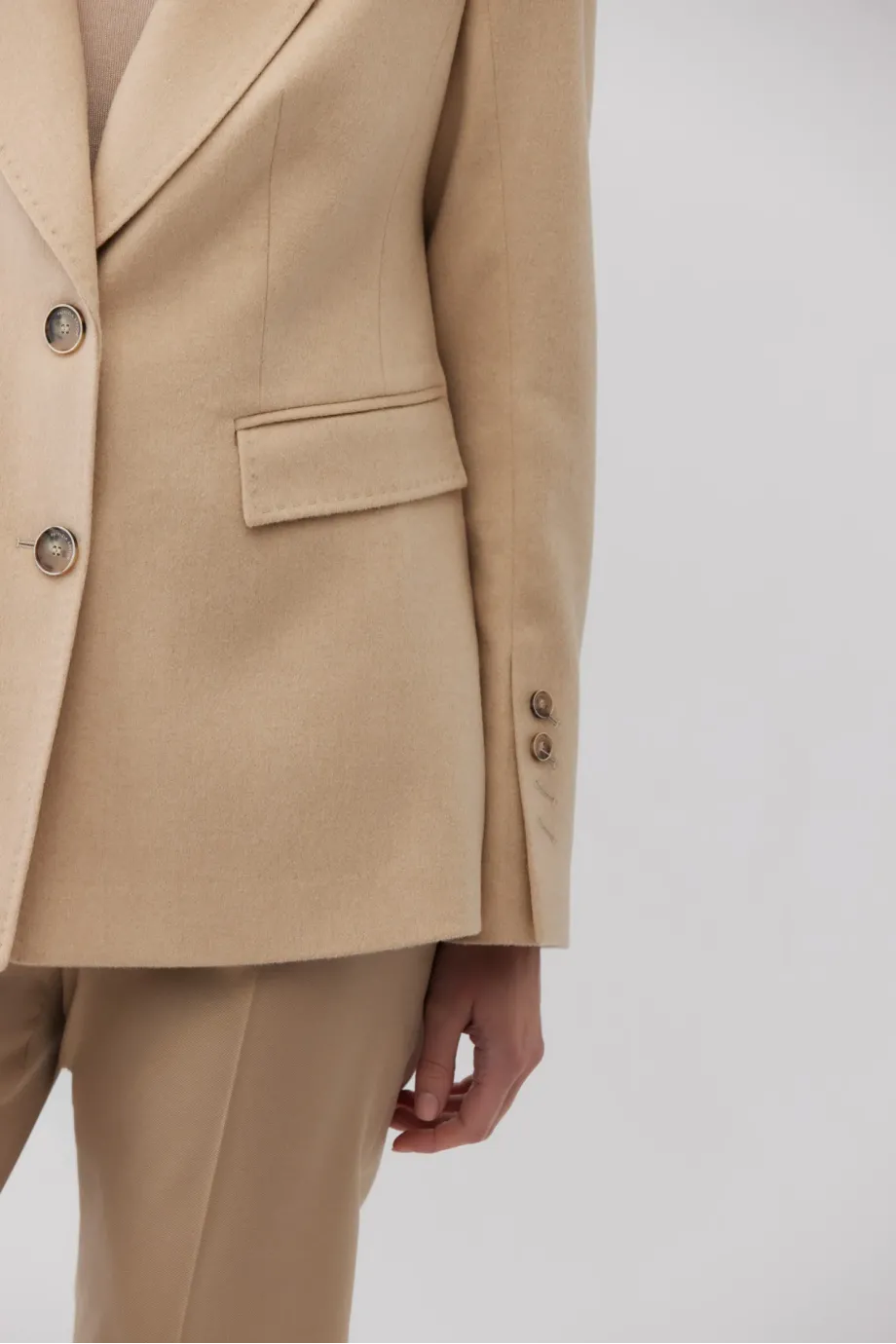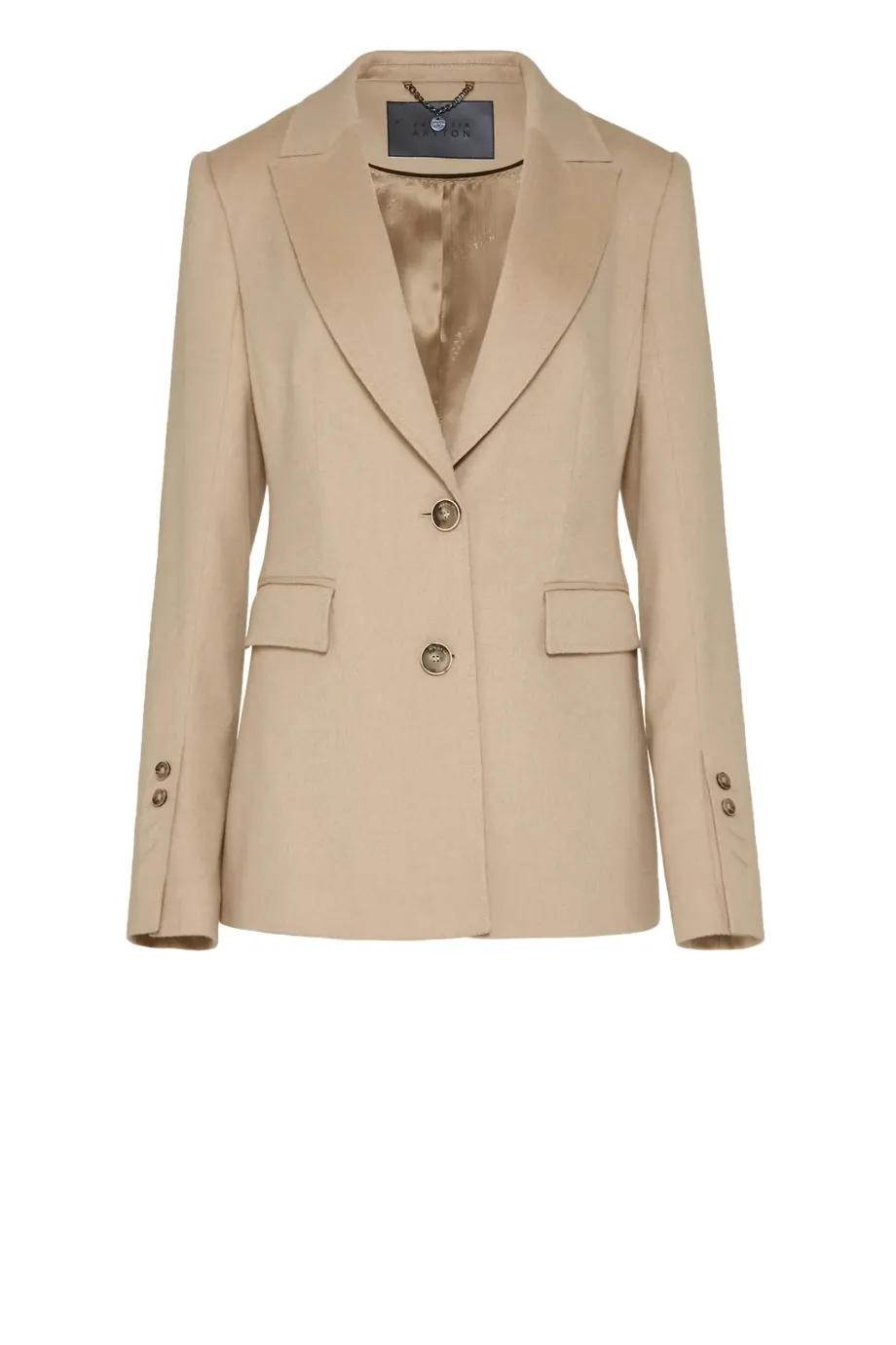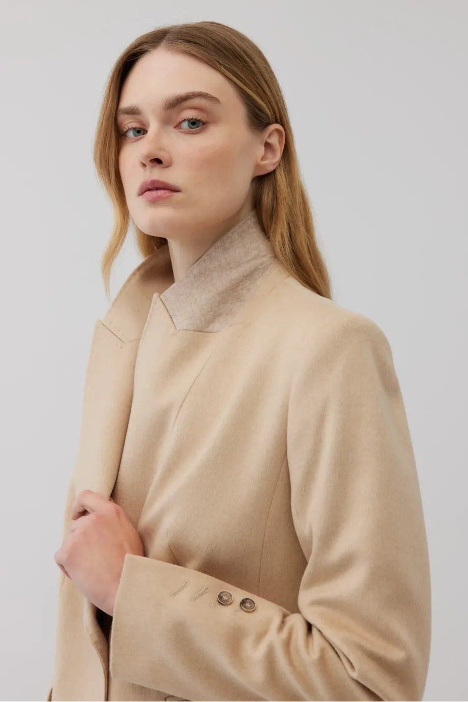Taliowana kurtka z wełny wielbłądziej. Odcień beżu albinos - niezwykle rzadki i szlachetny. Zapinana na dwa guziki z przodu, jednorzędowa. Kołnierz obszyty filcem. Ozdobne stebnowanie i piping. Z tyłu rozcięcie. Całość na podszewce, rękawy wykończone guzikami.