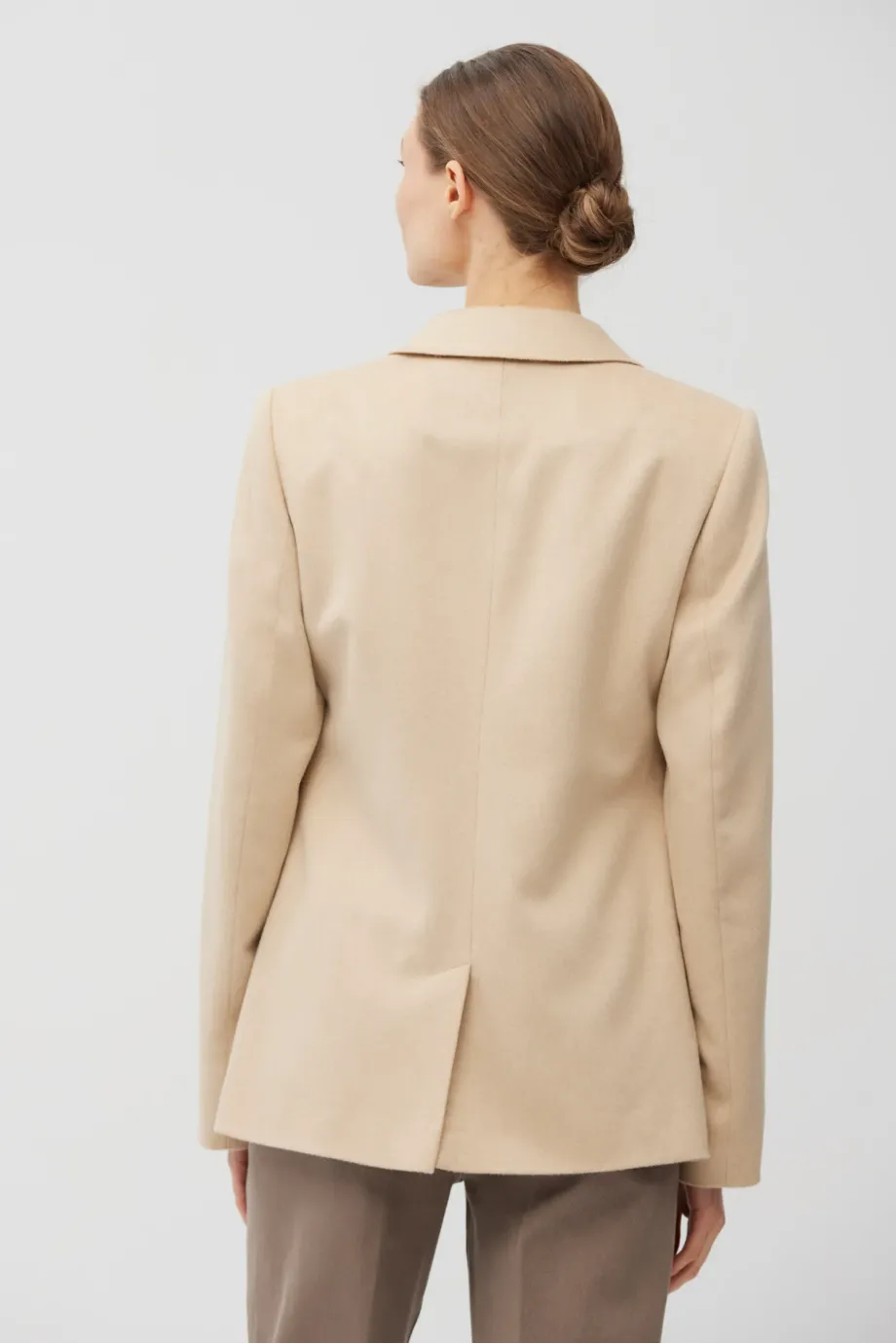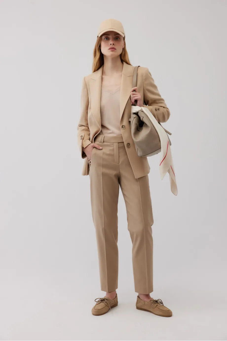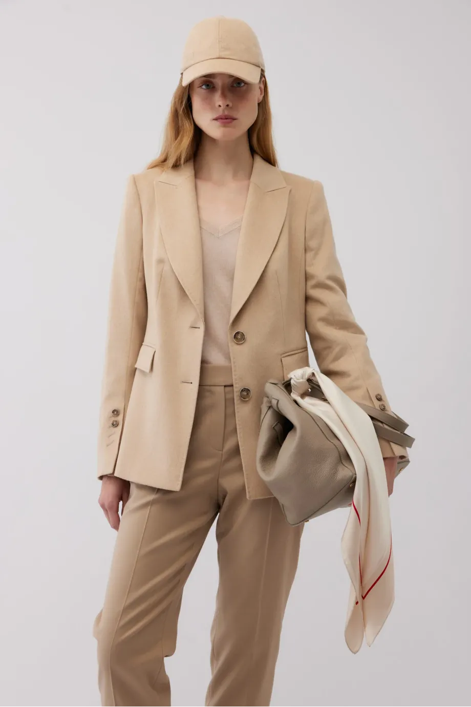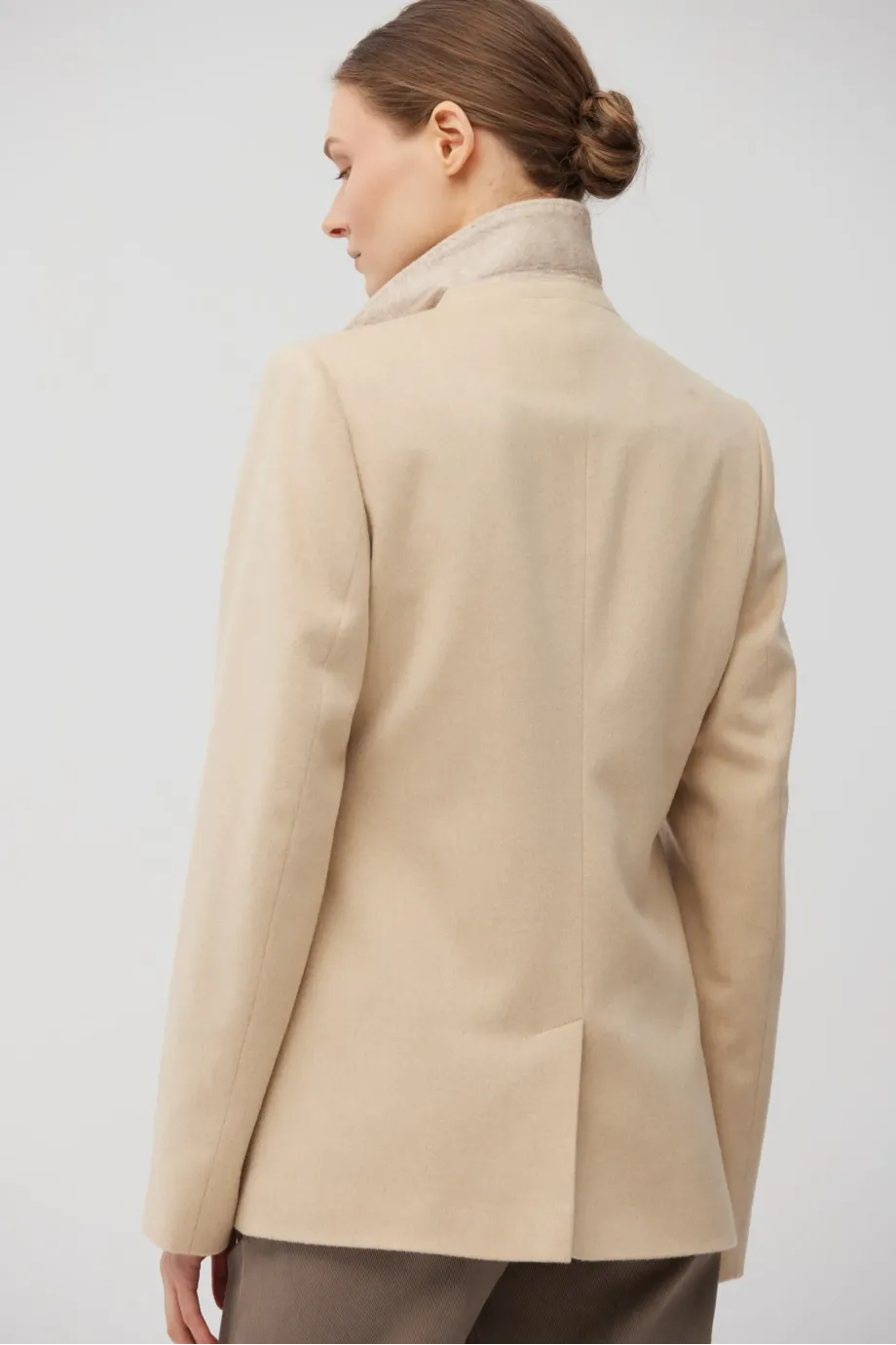 Taliowana kurtka z wełny wielbłądziej. Odcień beżu albinos - niezwykle rzadki i szlachetny. Zapinana na dwa guziki z przodu, jednorzędowa. Kołnierz obszyty filcem. Ozdobne stebnowanie i piping. Z tyłu rozcięcie. Całość na podszewce, rękawy wykończone guzikami.