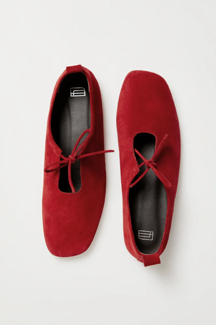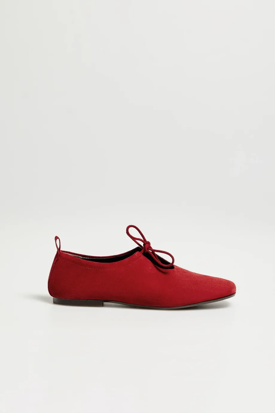 Miękka naturalna skóra zamszowa. Model wiązany, na płaskiej podeszwie. Kolor czerwony. Dostępne również w beżu. Ręcznie wykonane w hiszpańskiej manufakturze.