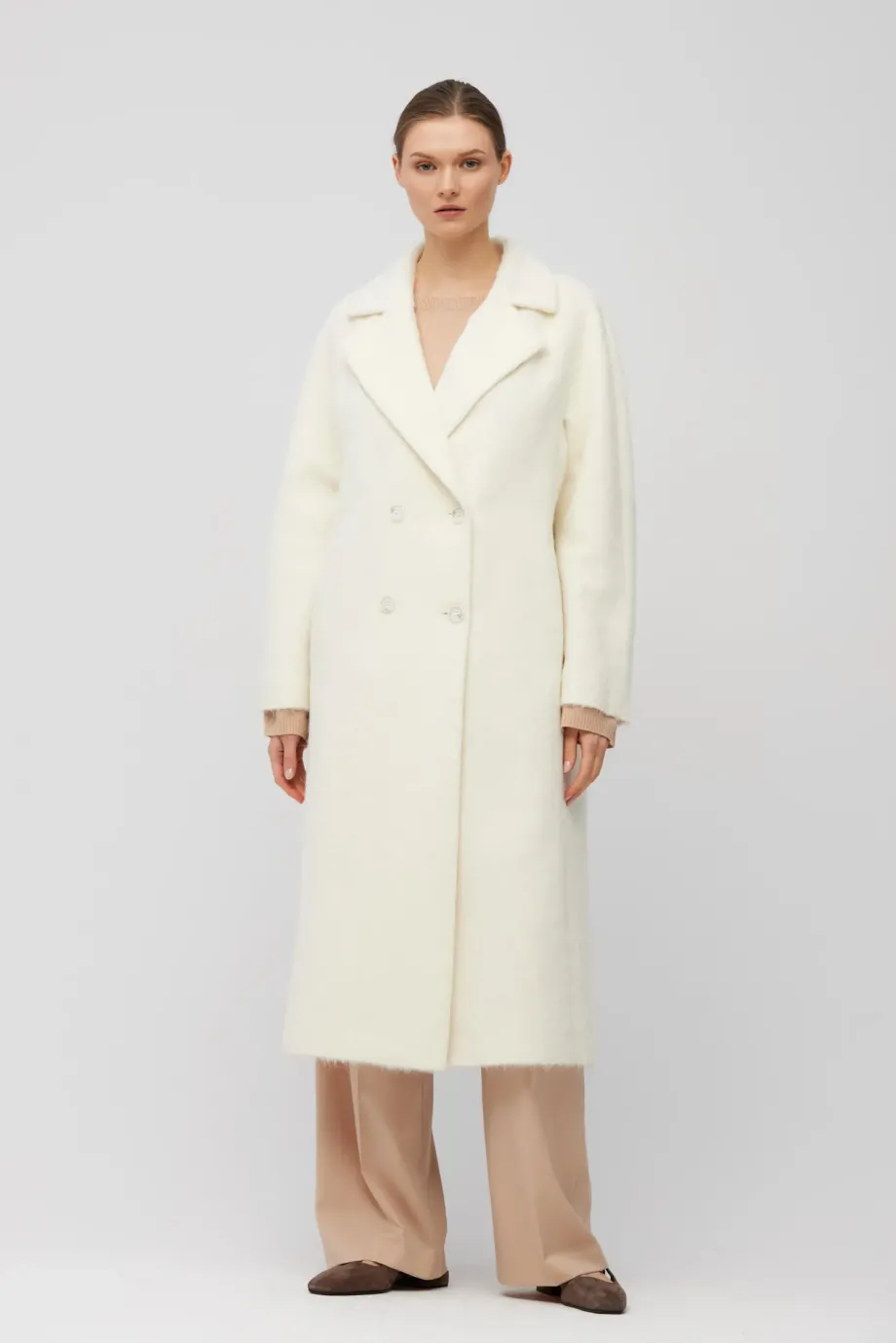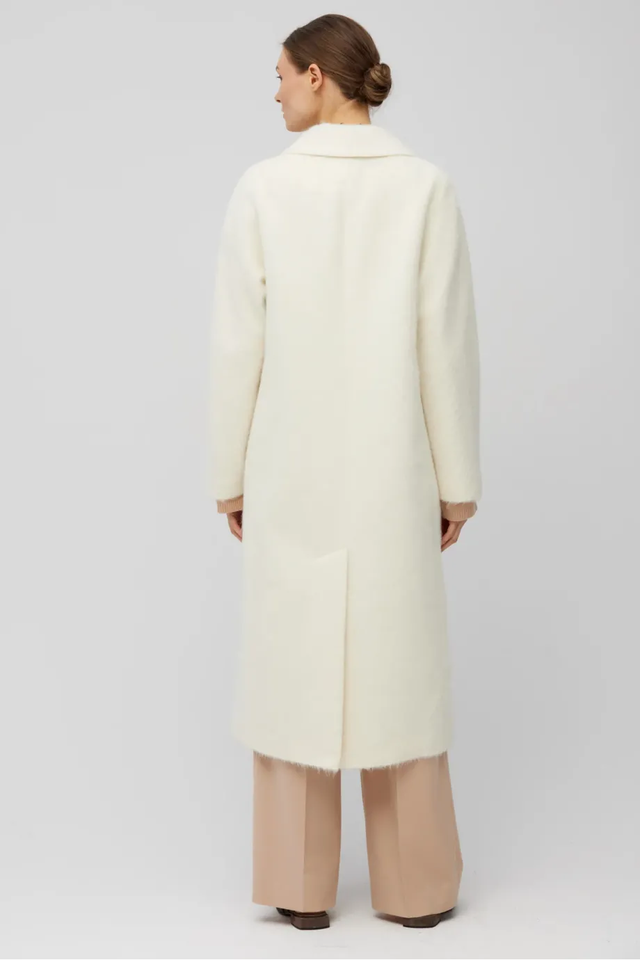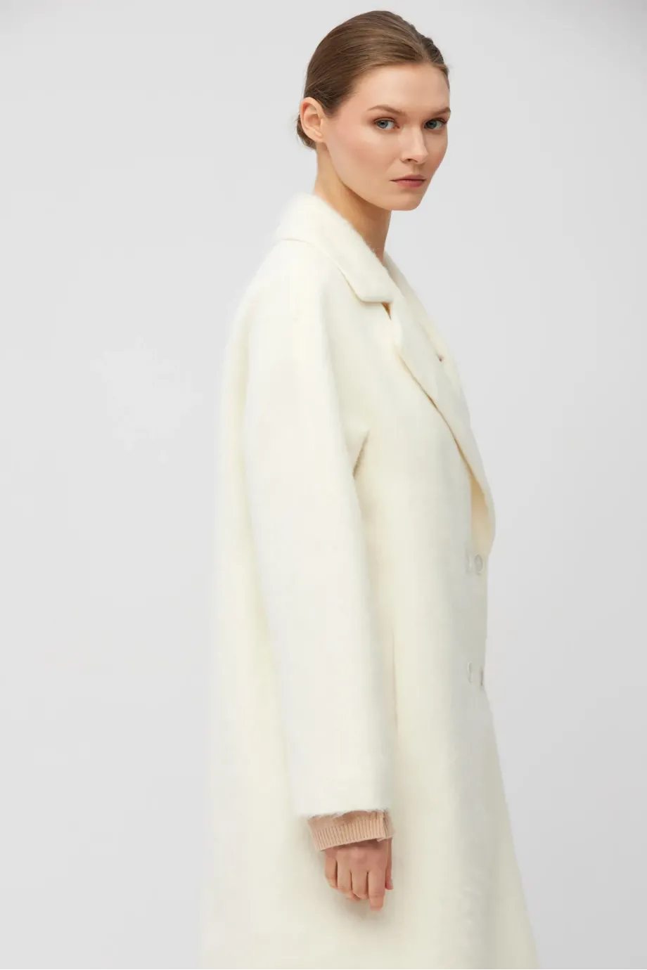 Prosta forma z mieszanki wełny alpaki i jedwabiu. Dwurzędowe zapięcie na guziki z naturalnego orzecha corozo. Klasyczny kołnierz, raglanowe rękawy, rozcięcie z tyłu. Całość na podszewce, starannie wykończona ozdobnym stebnowaniem, pipingiem i lamowaniem od środka. Kolor biały.