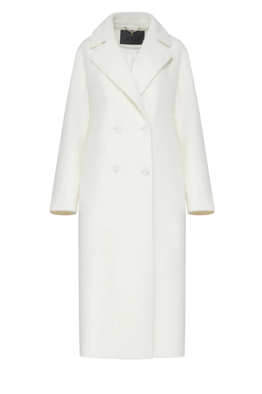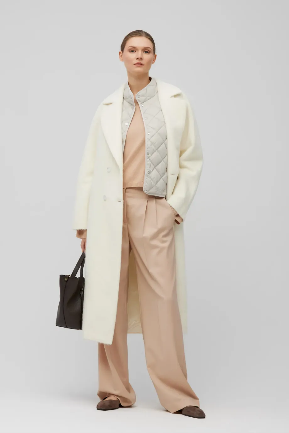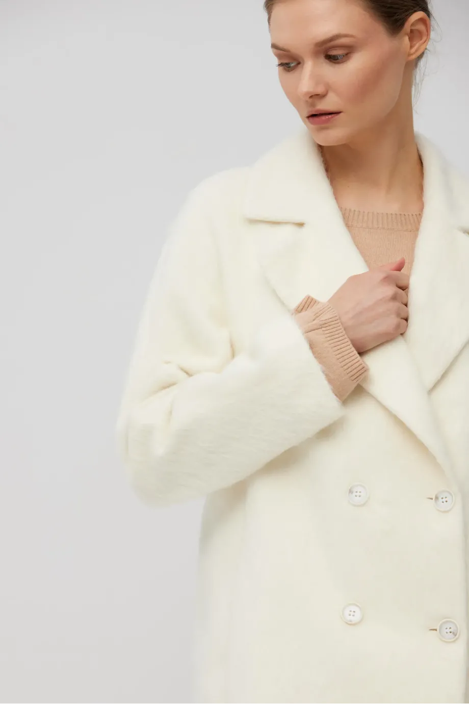 Prosta forma z mieszanki wełny alpaki i jedwabiu. Dwurzędowe zapięcie na guziki z naturalnego orzecha corozo. Klasyczny kołnierz, raglanowe rękawy, rozcięcie z tyłu. Całość na podszewce, starannie wykończona ozdobnym stebnowaniem, pipingiem i lamowaniem od środka. Kolor biały.