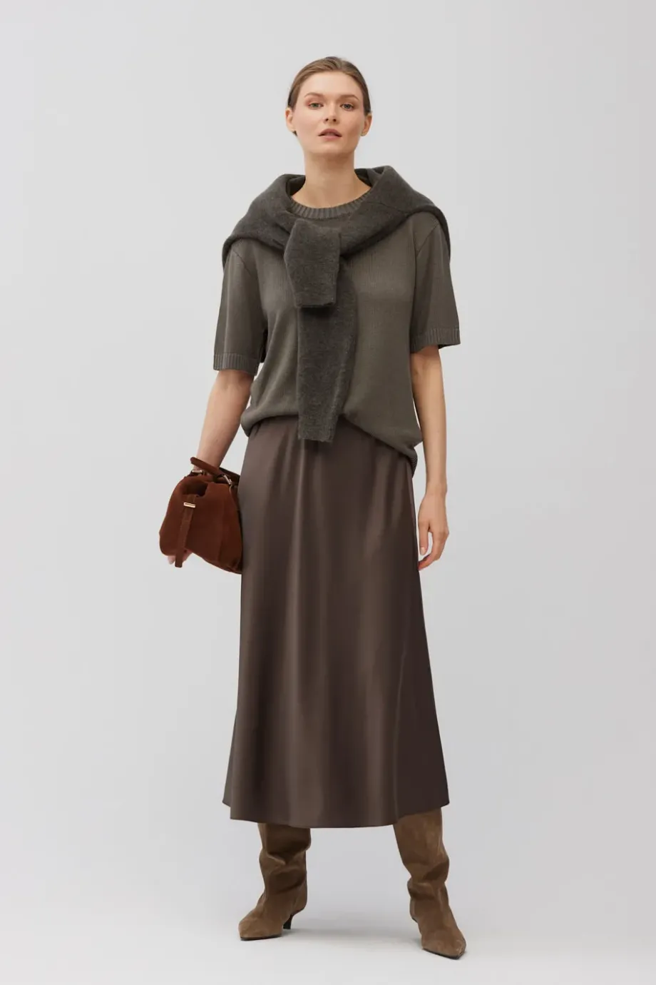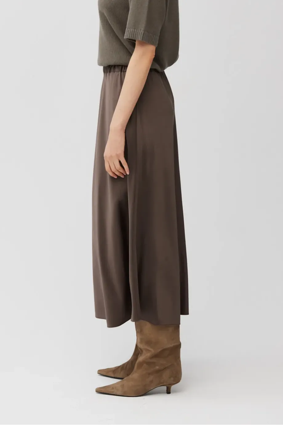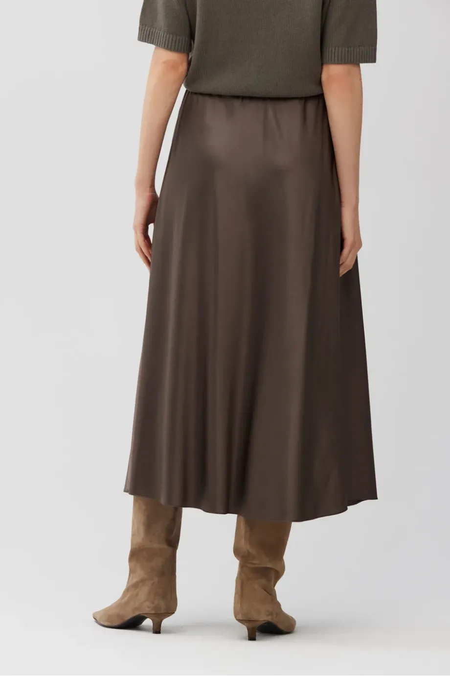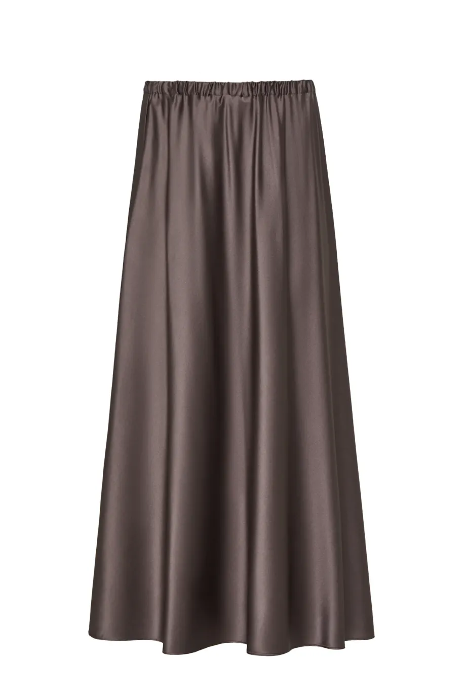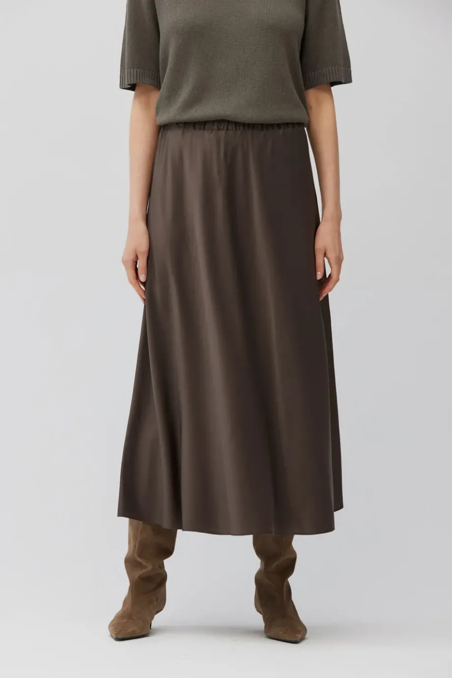 Jedwabna spódnica w odcieniu brązu. Zwiewna, o luźnym fasonie z elastyczną talią. Długość midi. Bez podszewki.
