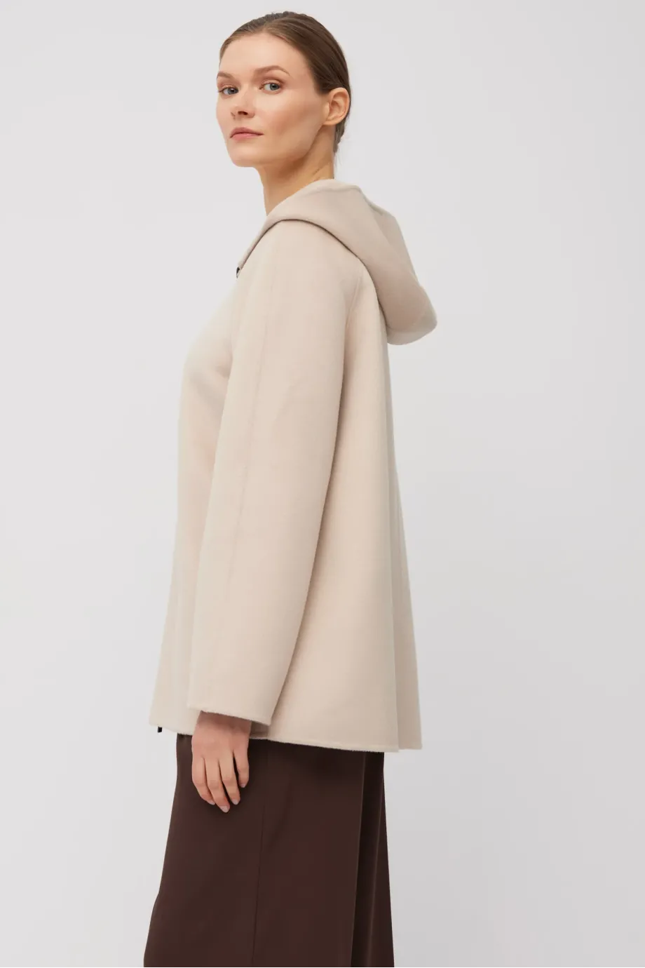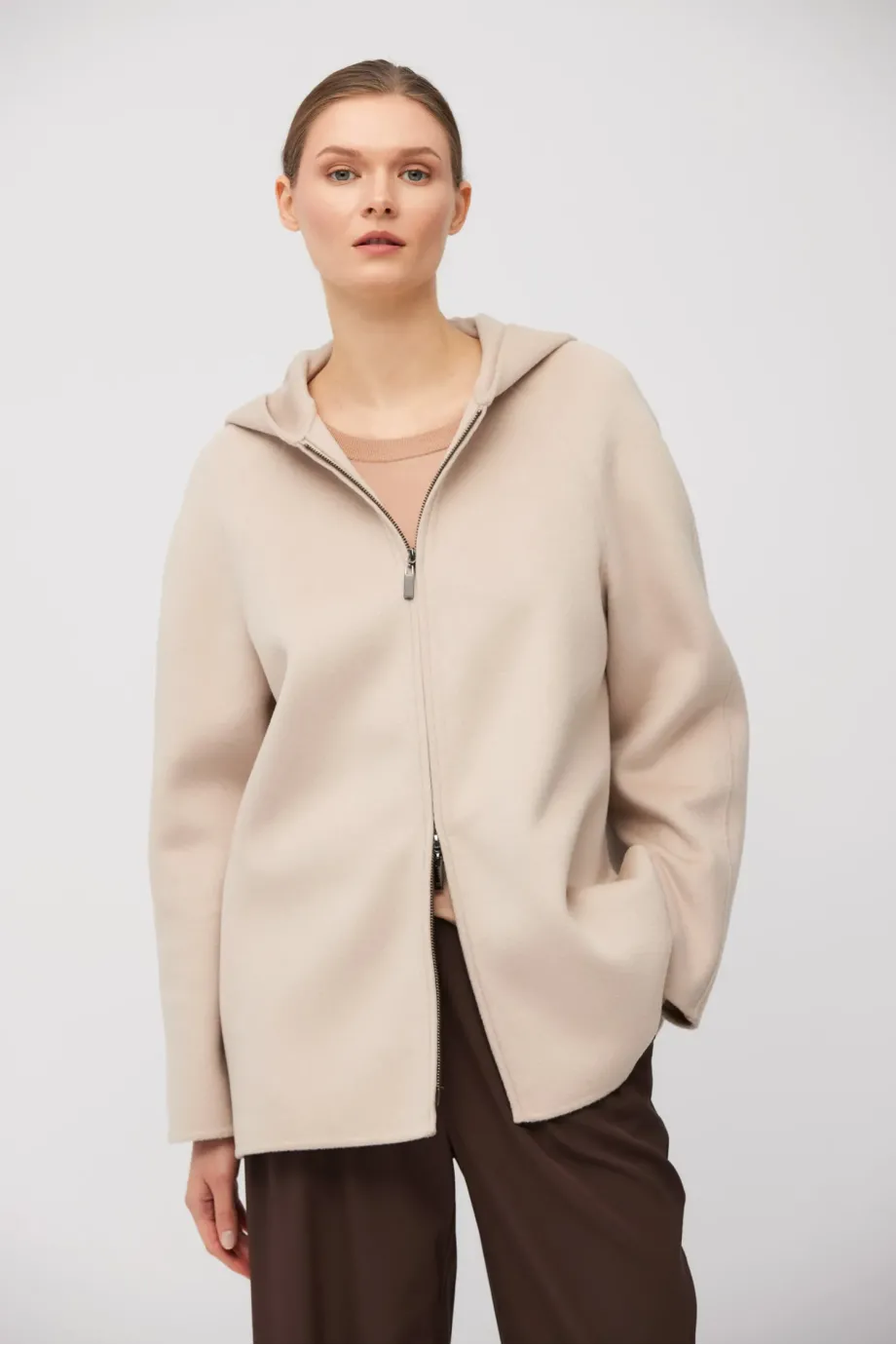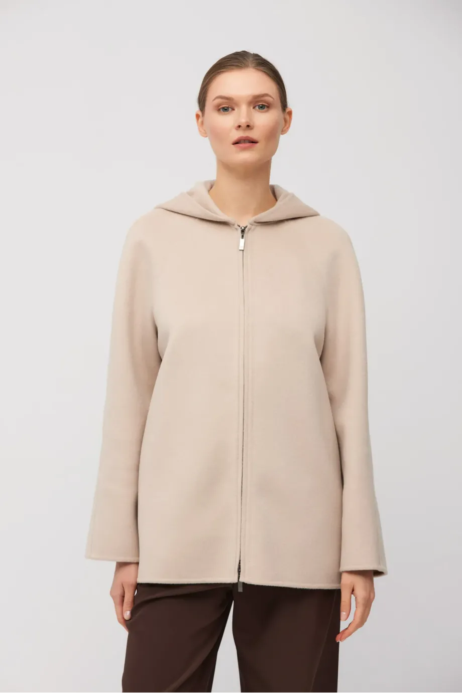 Lekka, niepodszewkowana kurtka o prostej, luźnej formie. Tkanina doubleface – mieszanka wełny i jedwabiu. Model z kapturem i dwubiegunowym metalowym suwakiem. Kolor beżowy.